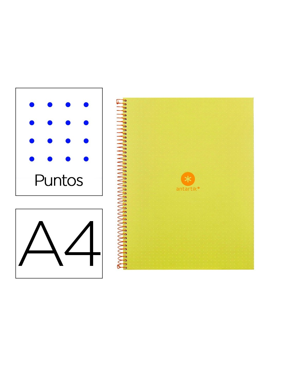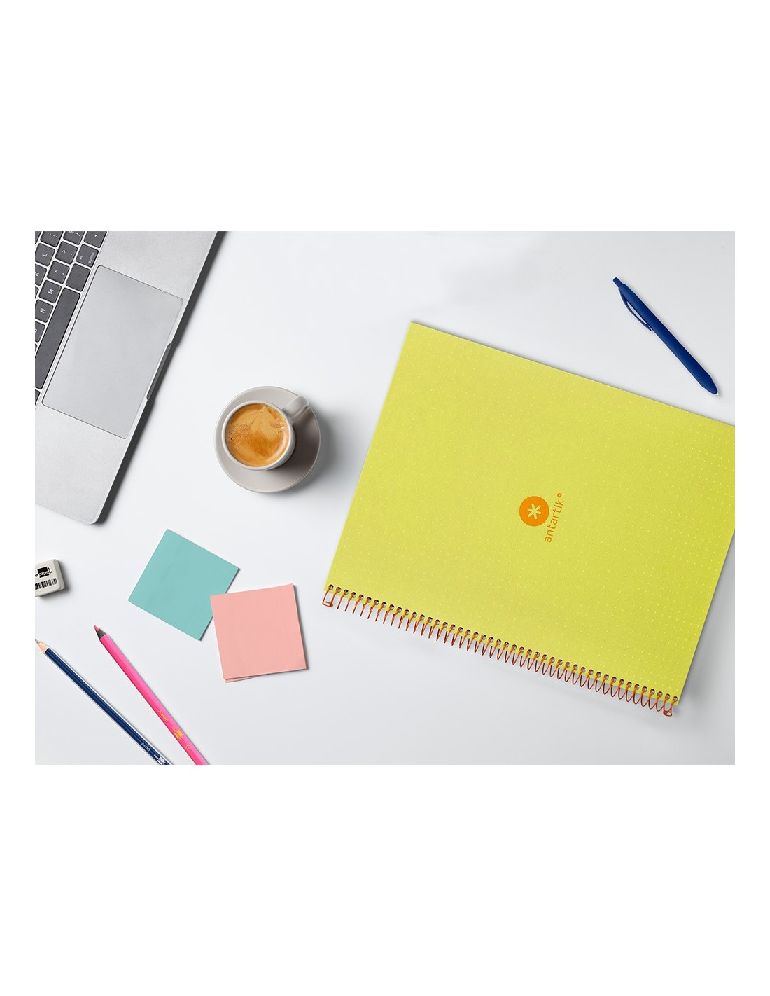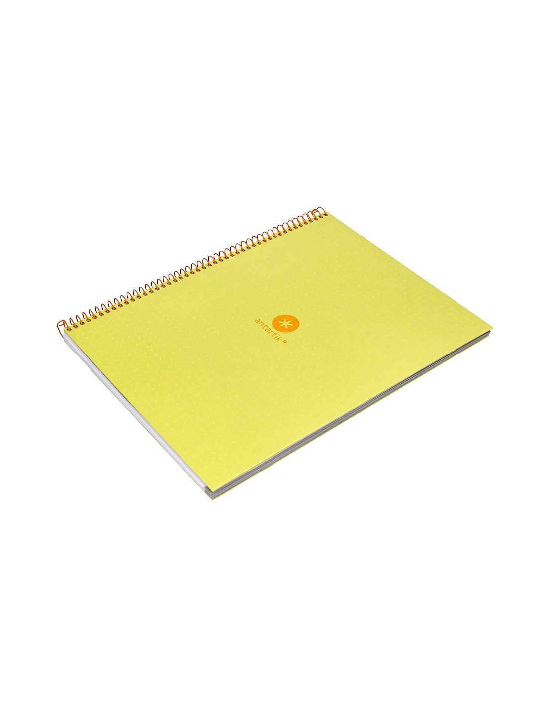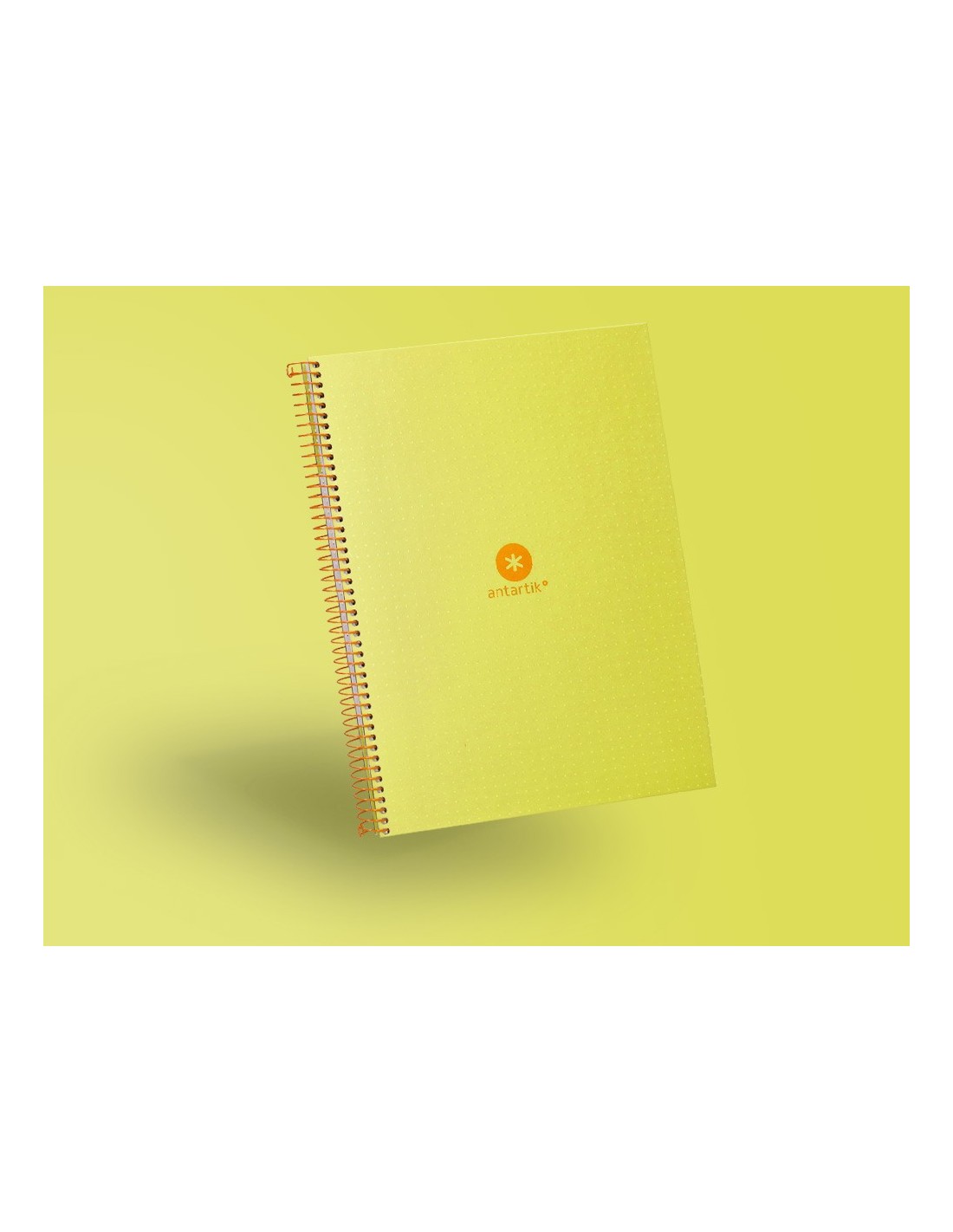 El cuaderno de más alta gama del mercado: exclusivo diseño, características inigualables, un cuaderno sin precedentes que se distingue por la suavidad y blancura de su papel. Tapa de cartón entrecolado de 1,5 mm de espesor, forrado a una cara con papel estucado mate extrasuave y reserva de barniz uvi. Guarda interior impresa. 80 hojas de gran resistencia y rigidez. Papel extrablanco de 90 g/m2, ultrasuave que hace la escritura mucho más fluida. La tinta no traspasa. Banda de color. Formato Din A4. Microperforado.Espiral nylonizada de colores. Coil-lock. Color Amarillo. INTERIOR IMPRESO EN SUAVES PUNTOS GRISES EQUIDISTANTES 5MM ENTRE SI QUE PERMITEN SER UNA PERFECTA GUIA SIN DESTACAR. IDEAL PARA HACER BOCETOS, DIBUJAR, TOMAR APUNTES O HACER GRAFICOS.