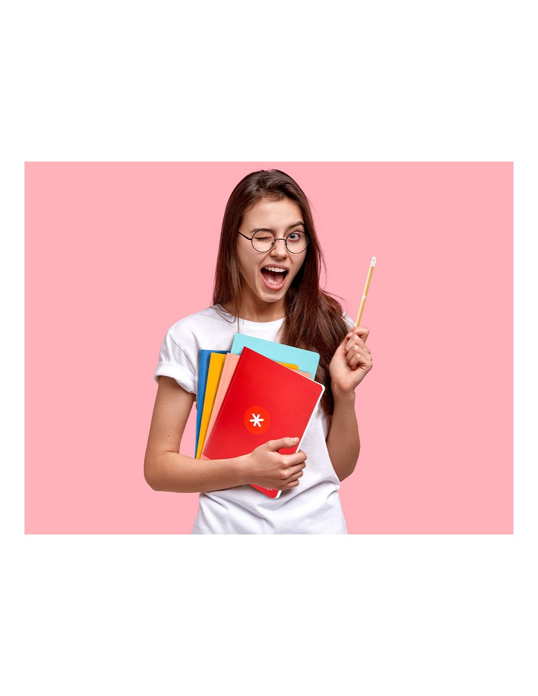 Libreta cosida con tapa de papel estucado impreso de 350 g/m² y plastificado en polietileno mate antiroce con reserva brillo. Formato Din A5+. 48 hojas. Papel extrablanco de 90 g/m² ultrasuave, hace la escritura mucha más fluida. La tinta no traspasa. Cuadro 4 mm. Con margen. Colores surtidos.