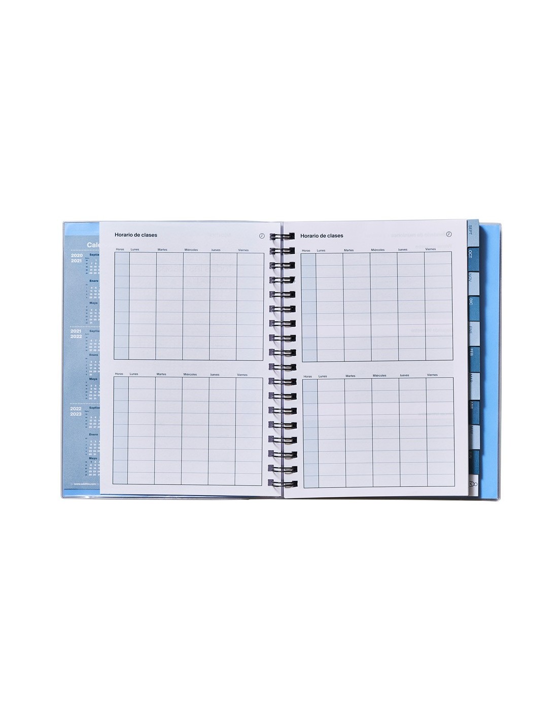 Organización por pestañas. Contenido: datos personales, horarios, calendario de reuniones, calendario de actividades y salidas, PLANIFICACIÓN diariadel curso, EVALUACIÓN continua, páginas para anotaciones. Cubierta encaps ulada en PVC, con doble espiral, funda de polipropileno transparente, calendario y cierre con goma elástica. Tamaño: 17 x 24 cm.