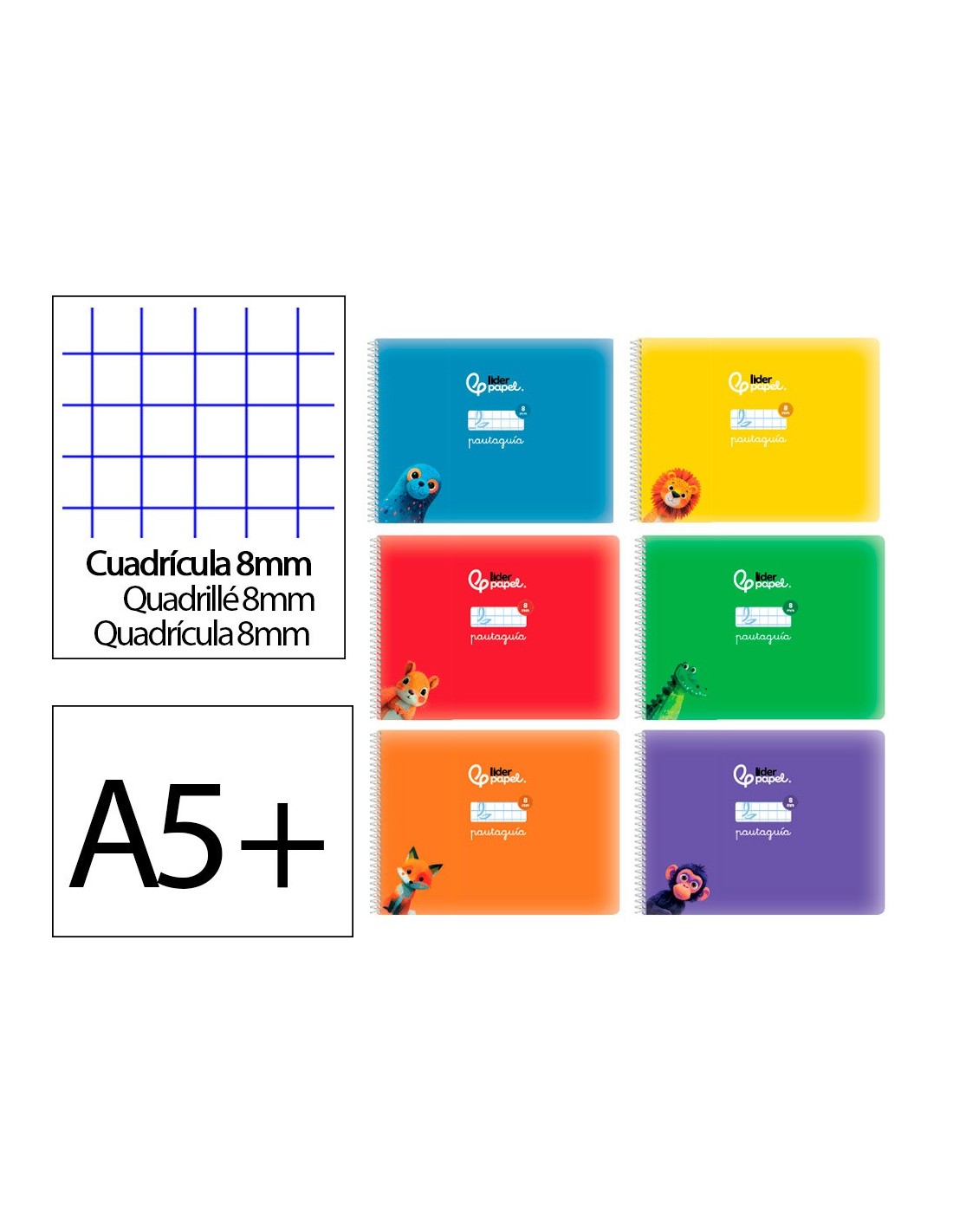 Tapa y contratapa de cartoncillo impreso plastificado brillo. Formato Din A5+. 32 hojas. 75g/m². Incluye una cuadrícula pautada en su interior que sirve de guía al alumno en el aprendizaje de la escritura. Hueco par añadirlos datos personales en la tapa sobre una cuadrícula del mismo tamaño a l a impresa en el interior. Con margen. Grapadas. 6 colores surtidos.