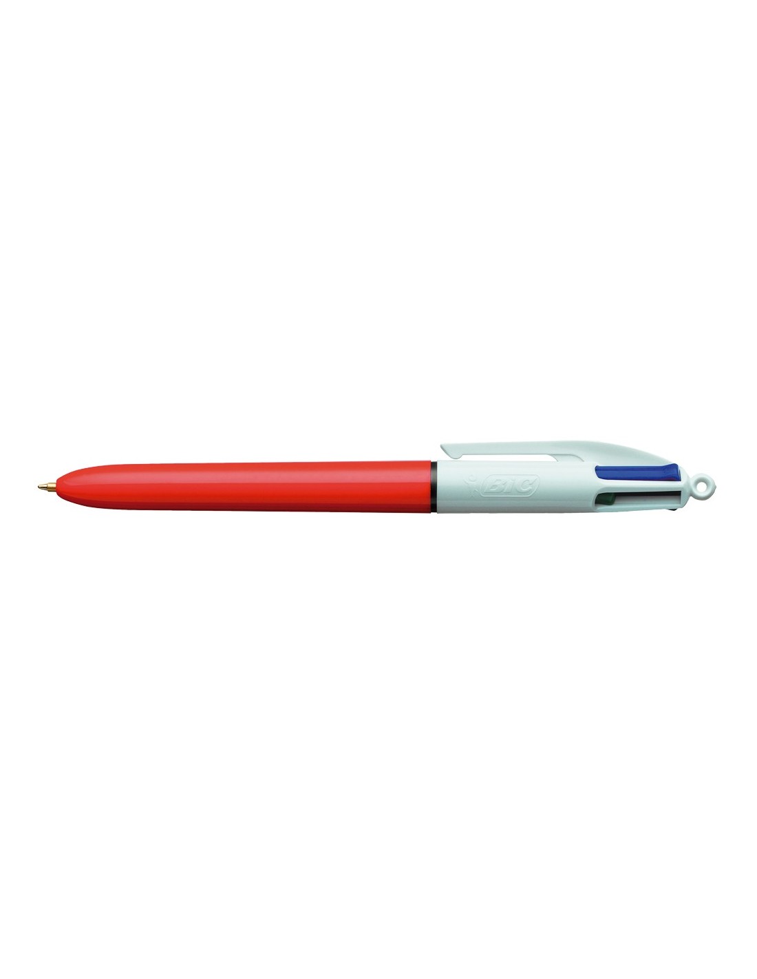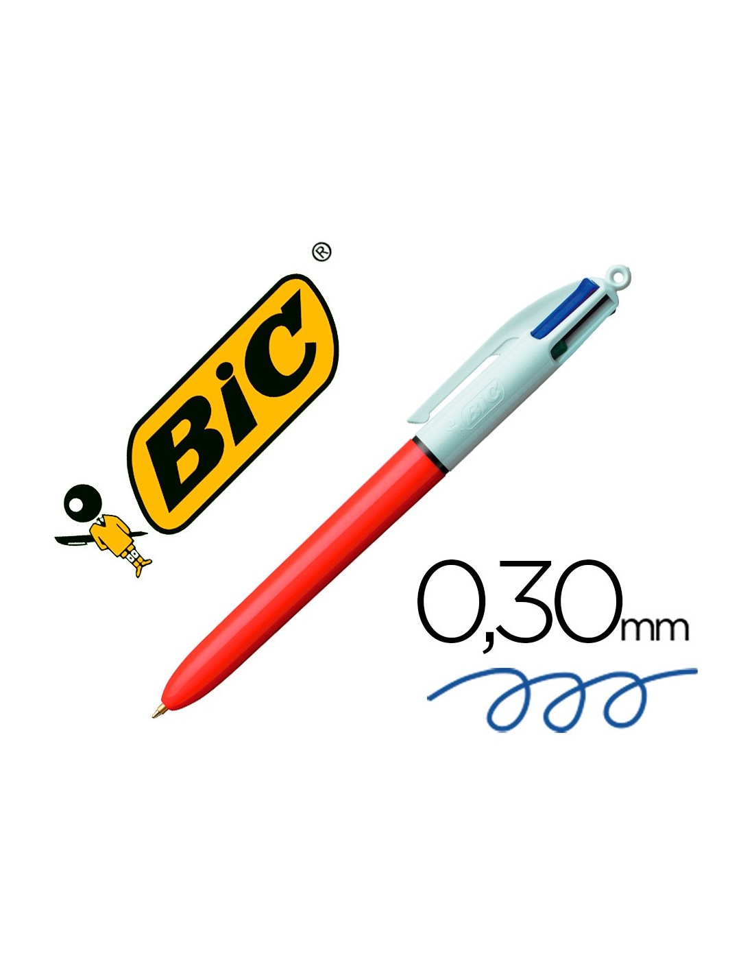 Bolígrafo retráctil 4 en 1. Escribe en azul, negro, rojo, verde. Permite corregir, marcar o diferenciar un texto con sólo pulsar el color de tinta elegido. Sistema para correa. El modelo convencional garantiza 8 km de escritura entre los 4 colores.