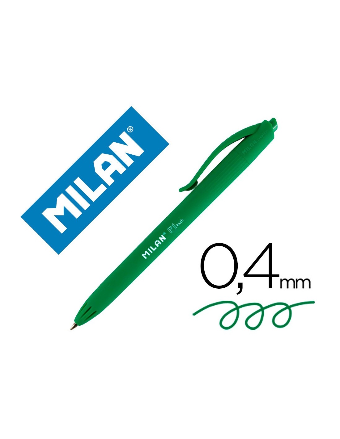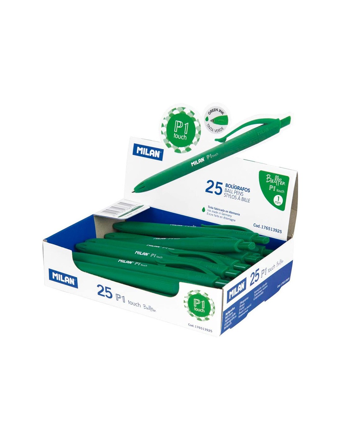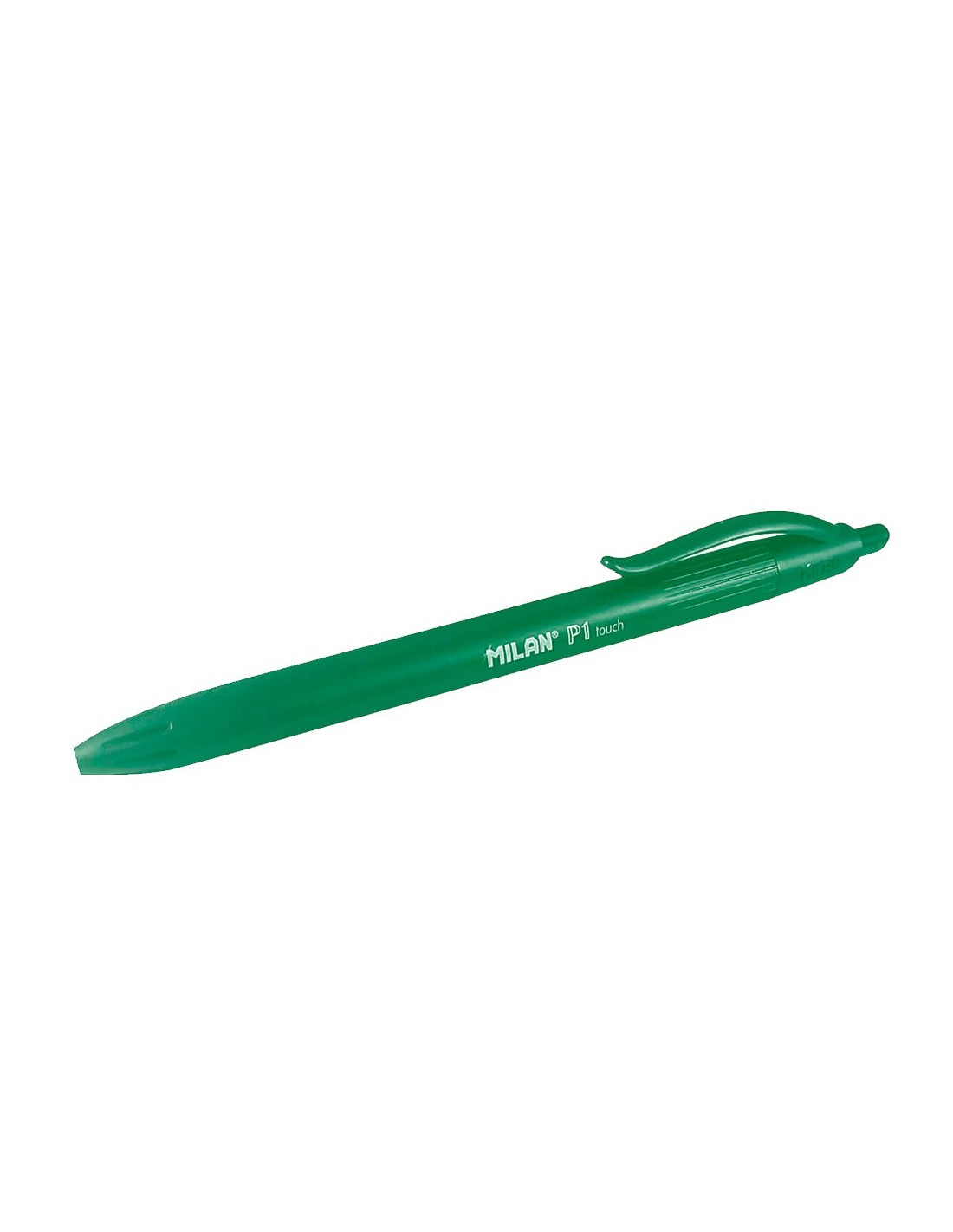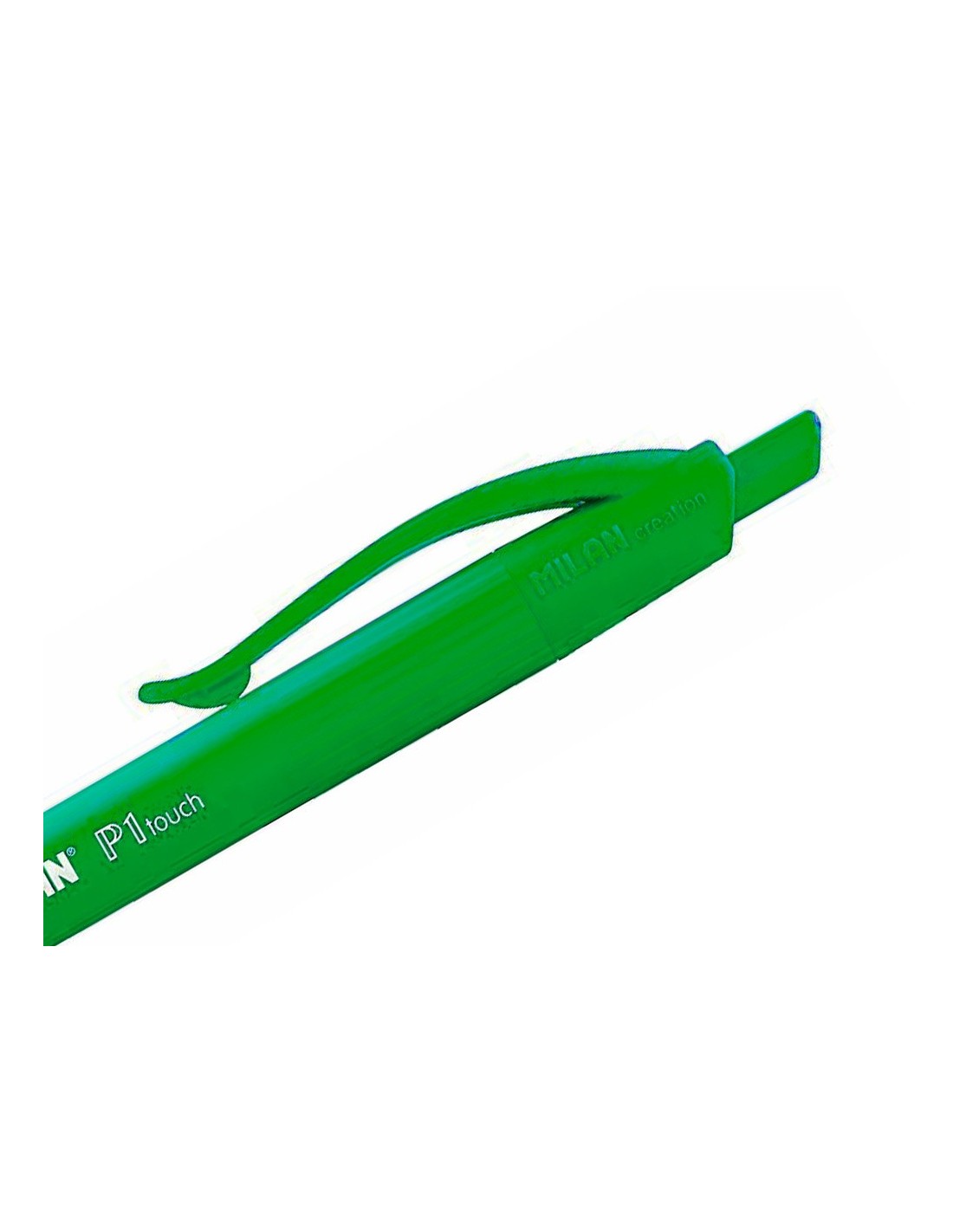 Bolígrafo P1 touch verde, con el cuerpo del mismo color que la tinta. Longitud de escritura aproximada de 1.200 metros. Punta 1 mm. Tinta fabricada en Alemania. Diseño original creado por el departamento de I+D de MILAN. Medidas bolígrafo: 14,1 x 1,7 cm. 1 cm Ø.