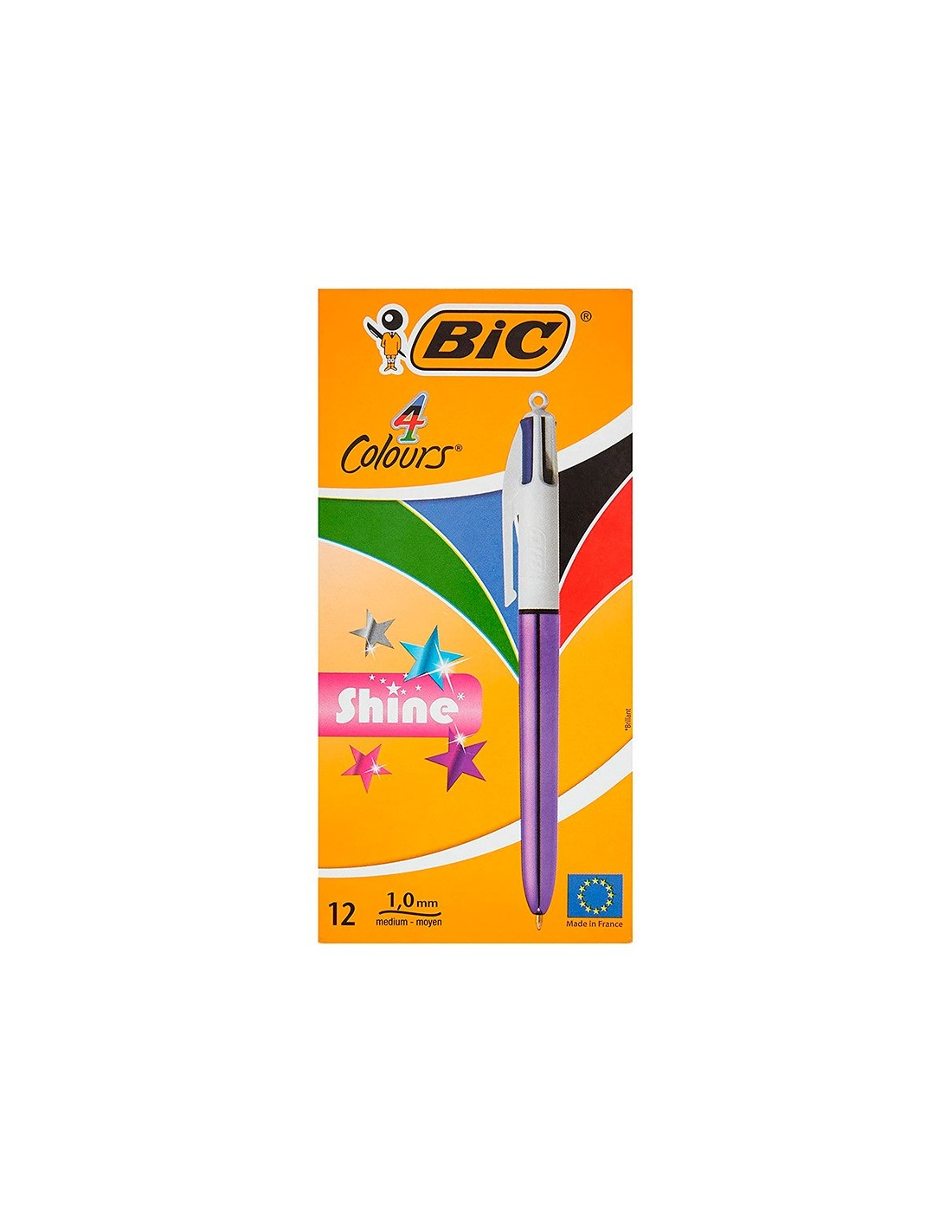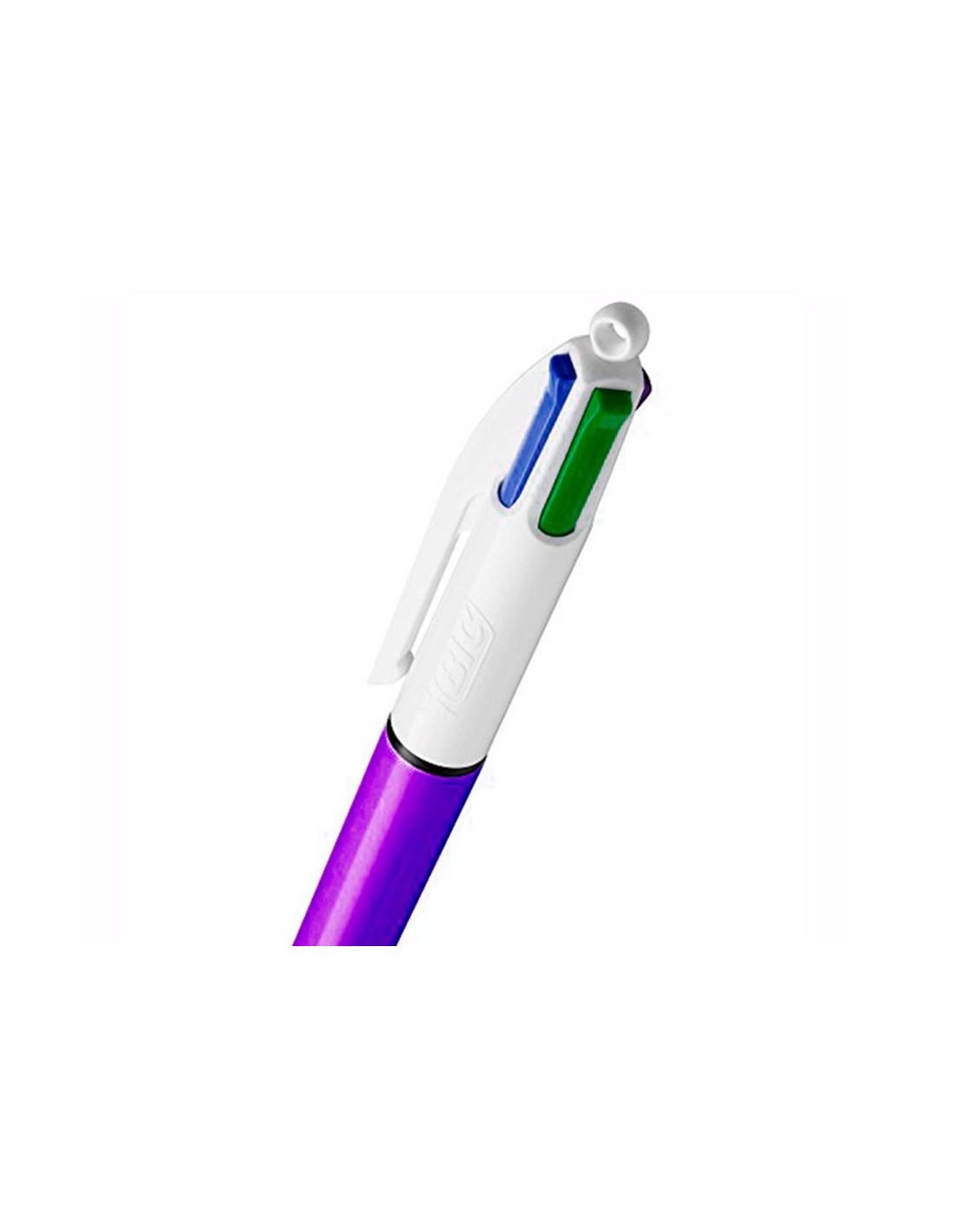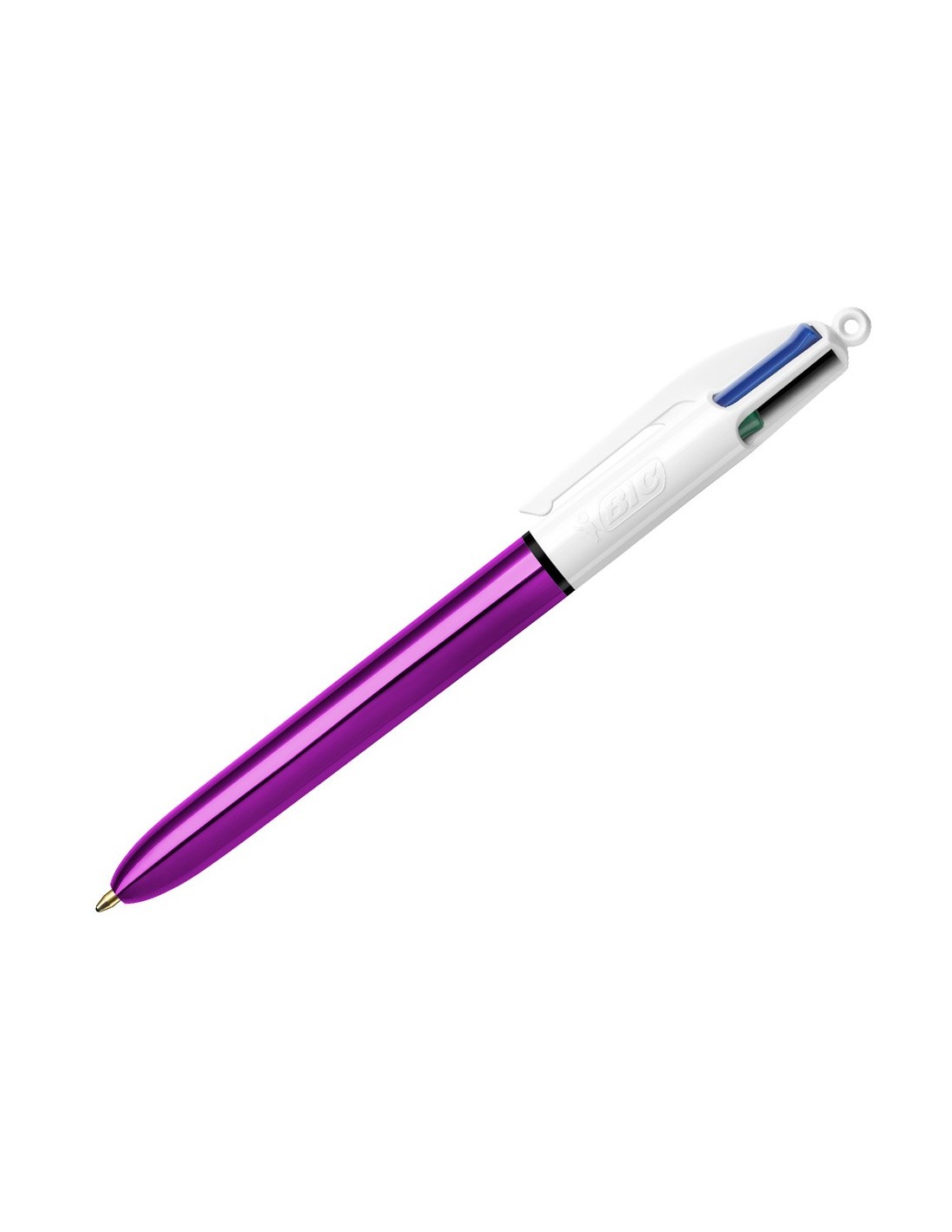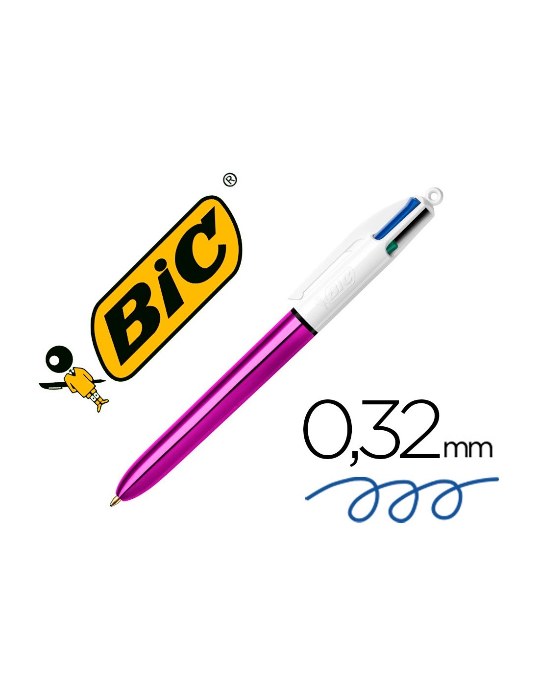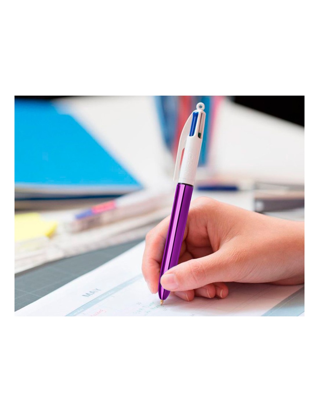 Bolígrafo 4 colores. Diseño moderno con cuerpo en colores metálicos surtidos. Permite corregir, marcar o diferenciar un texto con sólo pulsar el color de tinta elegido. Tinta de calidad, de secado rápido y una escritura suave. Sistema para correa. Producto libre de PVC. Punta media de 1 mm. Trazo 0,32 mm.