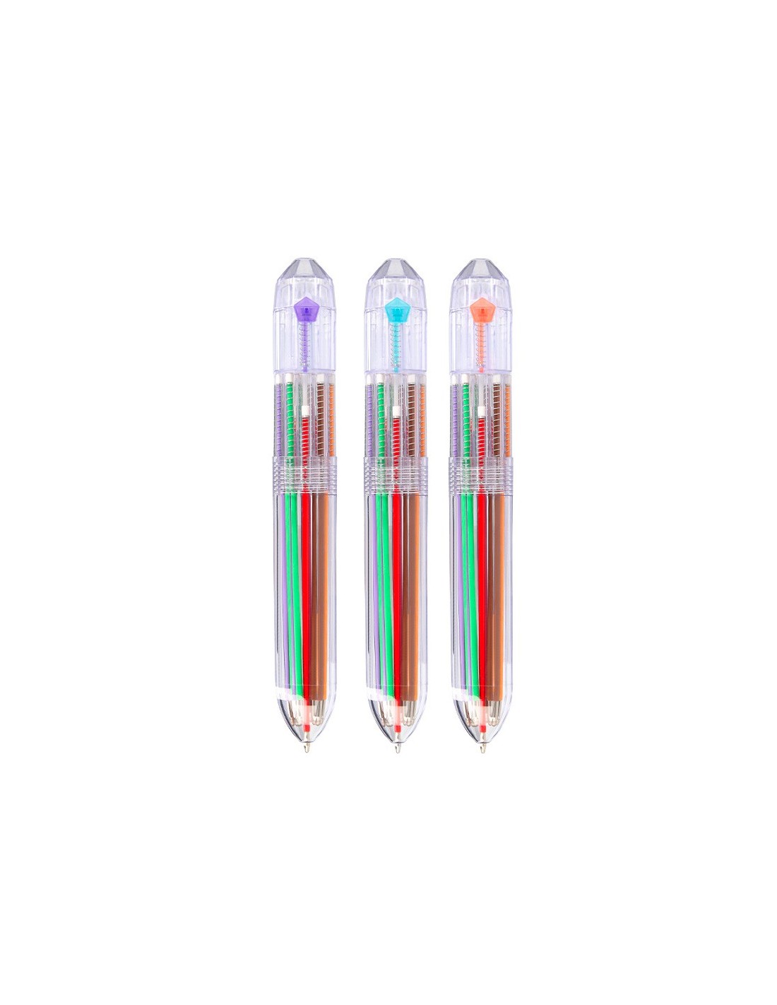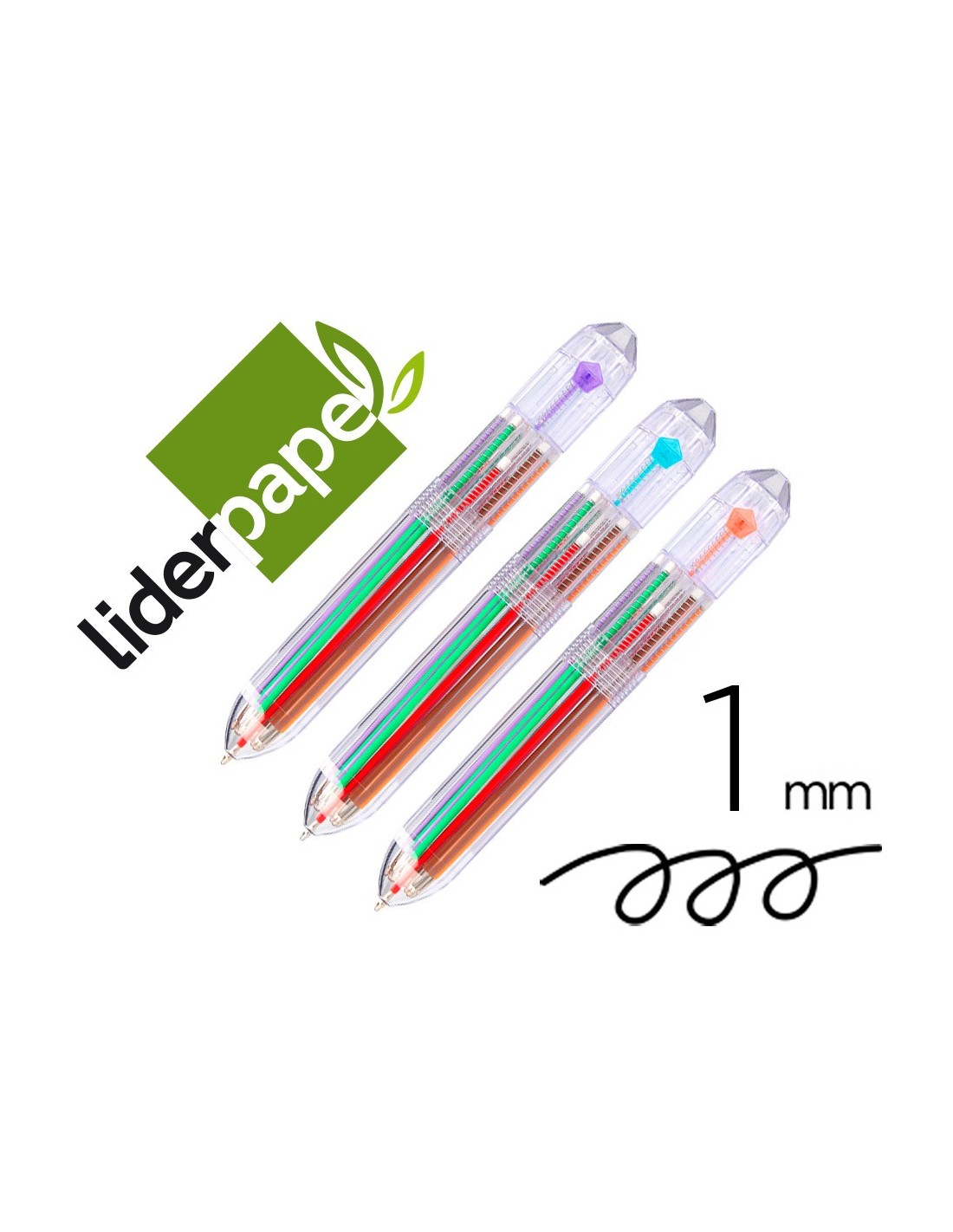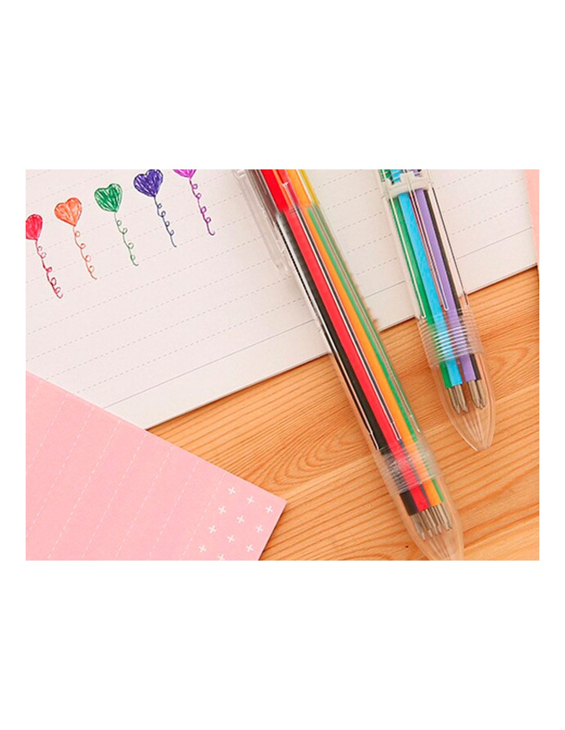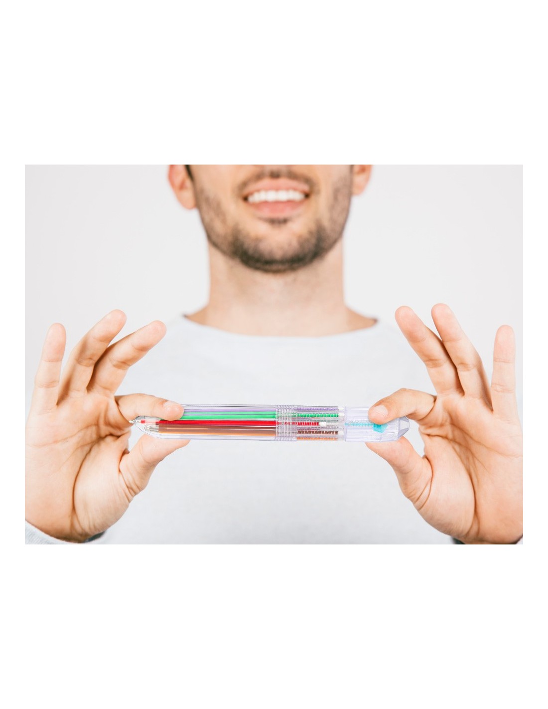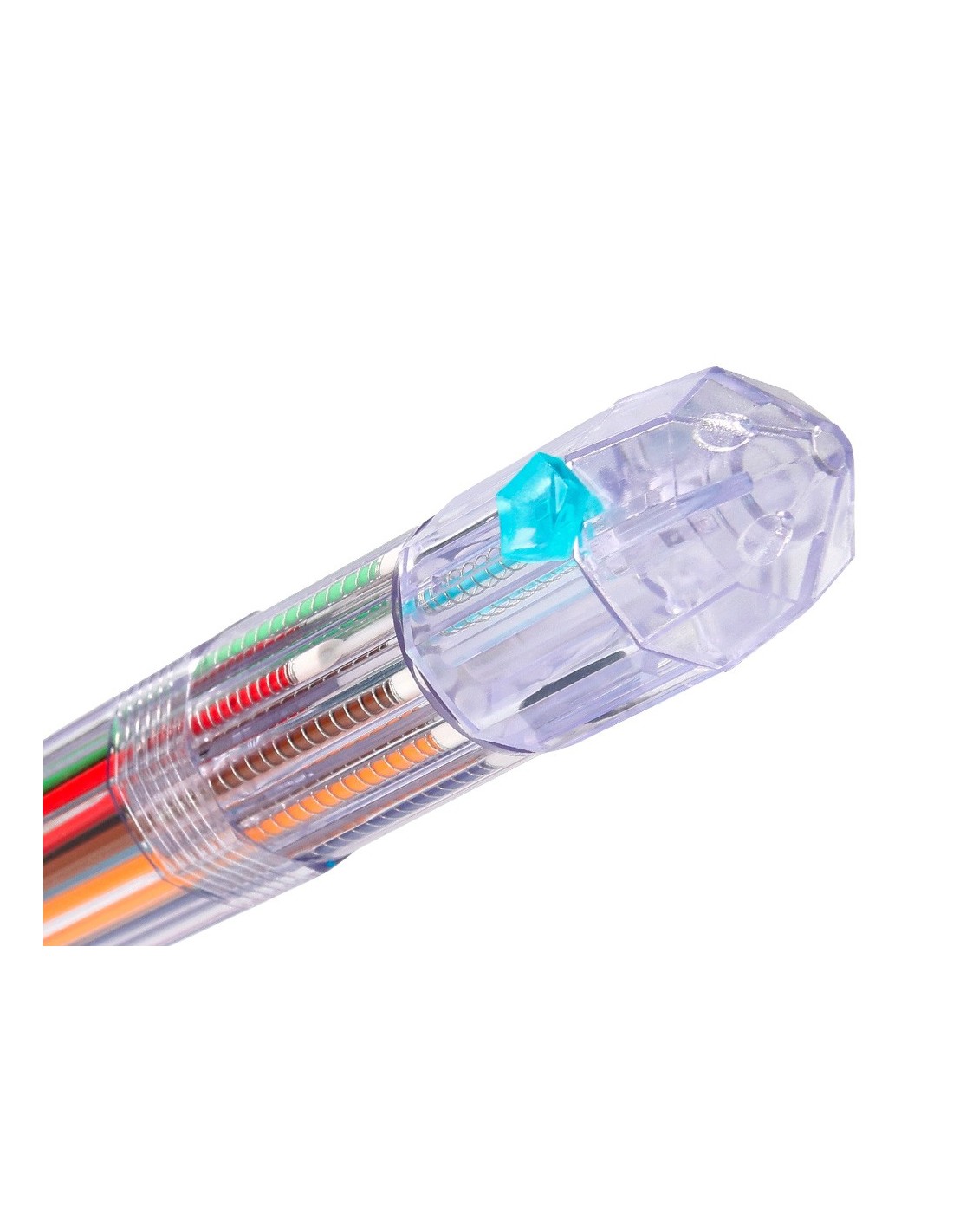 Bolígrafo retráctil multifunción con tinta a base de aceite. Completo sistema 10 en 1: con 10 colores de tinta (amarillo, azul, celeste, marrón, naranja, negro, rojo, rosa, verde y violeta). Cuerpo de plástico transparente. Punta de 1 mm. Trazo del bolígrafo de 0,7 mm.