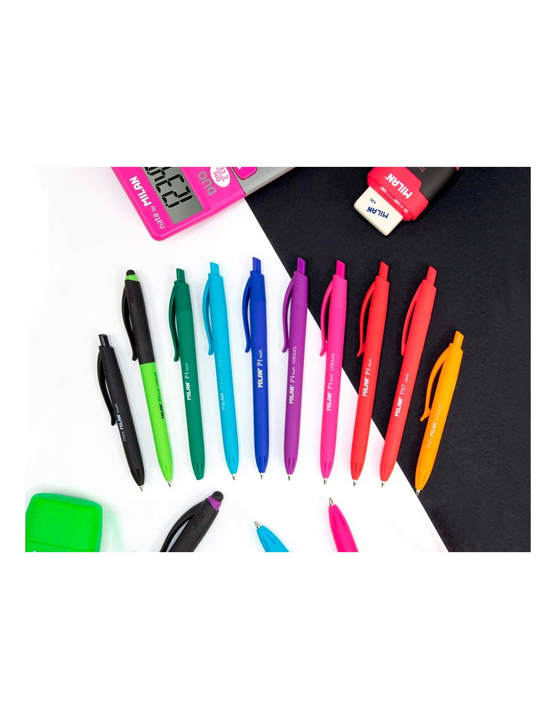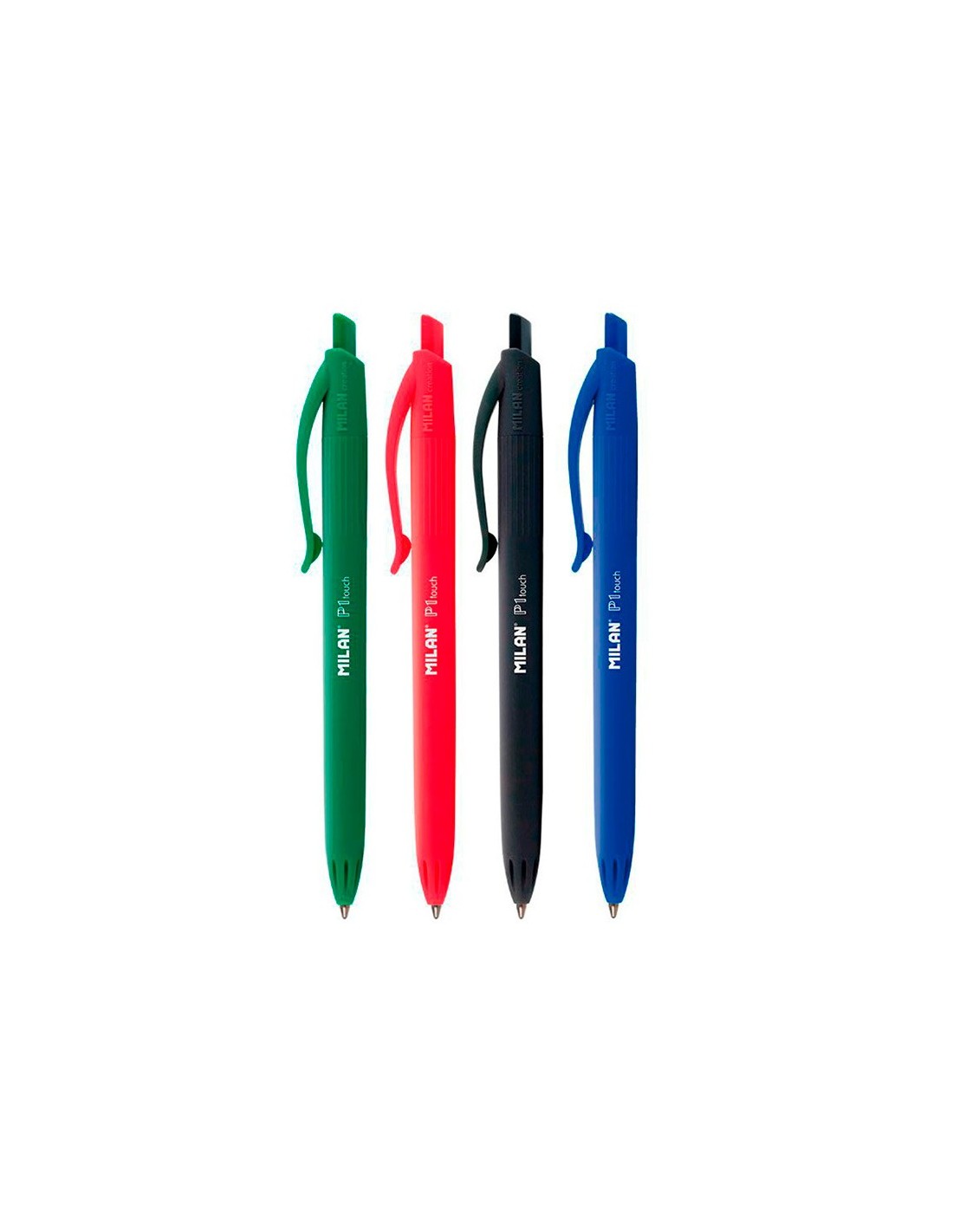 5 BOLÍGRAFOS P1 TOUCH DE COLORES SURTIDOS (2 AZULES, 1 NEGRO, 1 ROJO, VERDE), CON EL CUERPO DEL MISMO COLOR QUE LA TINTA. LONGITUD DE ESCRITURA PROXIMADA DE 1.200 METROS. PUNTA 1 MM. DISEÑO ORIGINAL CREADO POR LDEPARTAMENTO DE I+D DE MILAN. MEDIDASBOLÍGRAFO:14,1 X 1,7 CM.