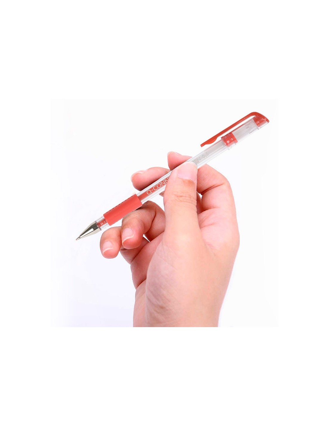 Bolígrafo con tinta gel de escritura muy suave, con cuerpo transparente que permite ver el nivel de la tinta. Sujeción de caucho. Capuchón del color de la tinta. Punta de 0,7 mm. Trazo de 0,5 mm.