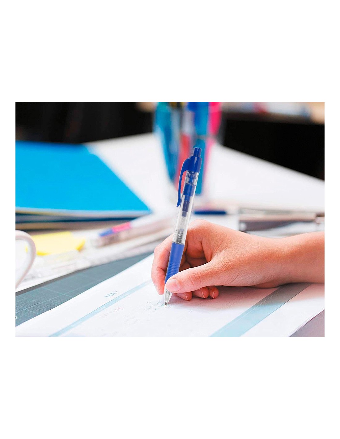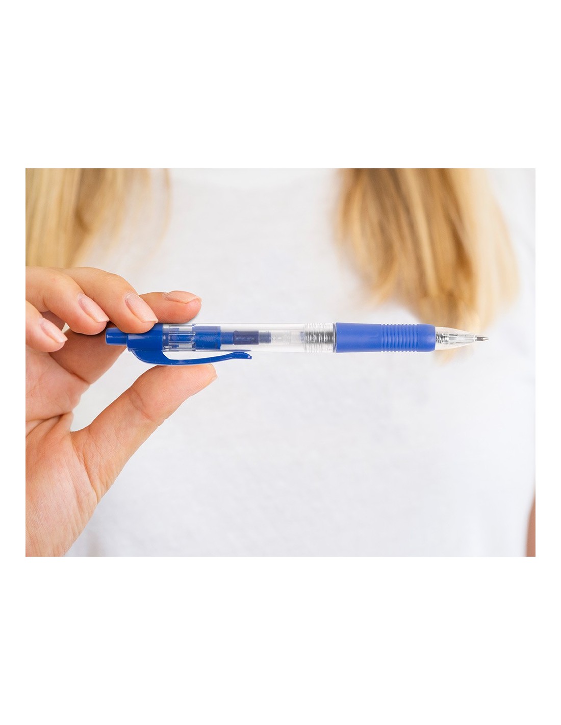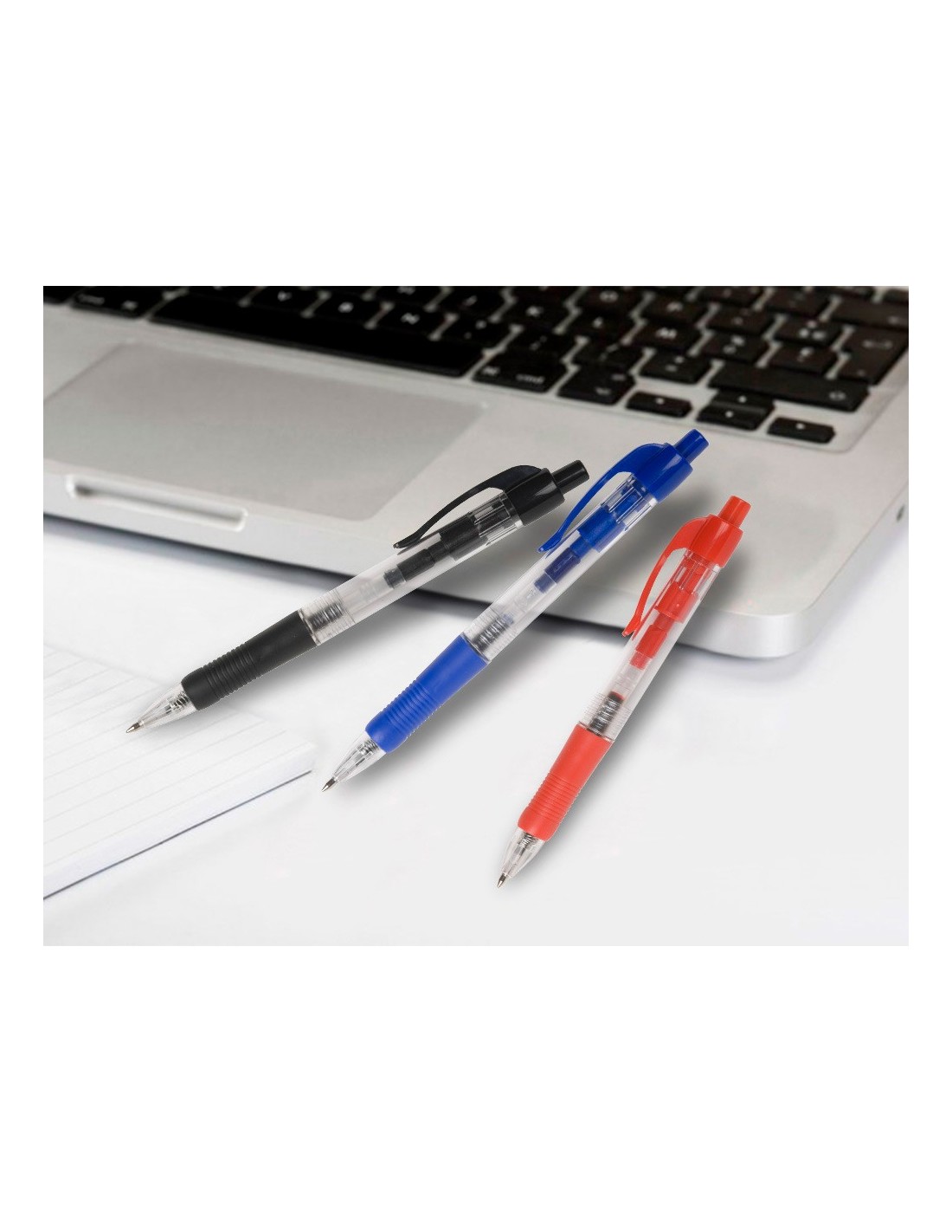 Bolígrafo retráctil con sujeción de caucho del mismo color que la tinta. Tinta a base de aceite. Cuerpo transparente que permite ver el nivel de la tinta. Punta de 1 mm. Trazo de 0,7 mm.