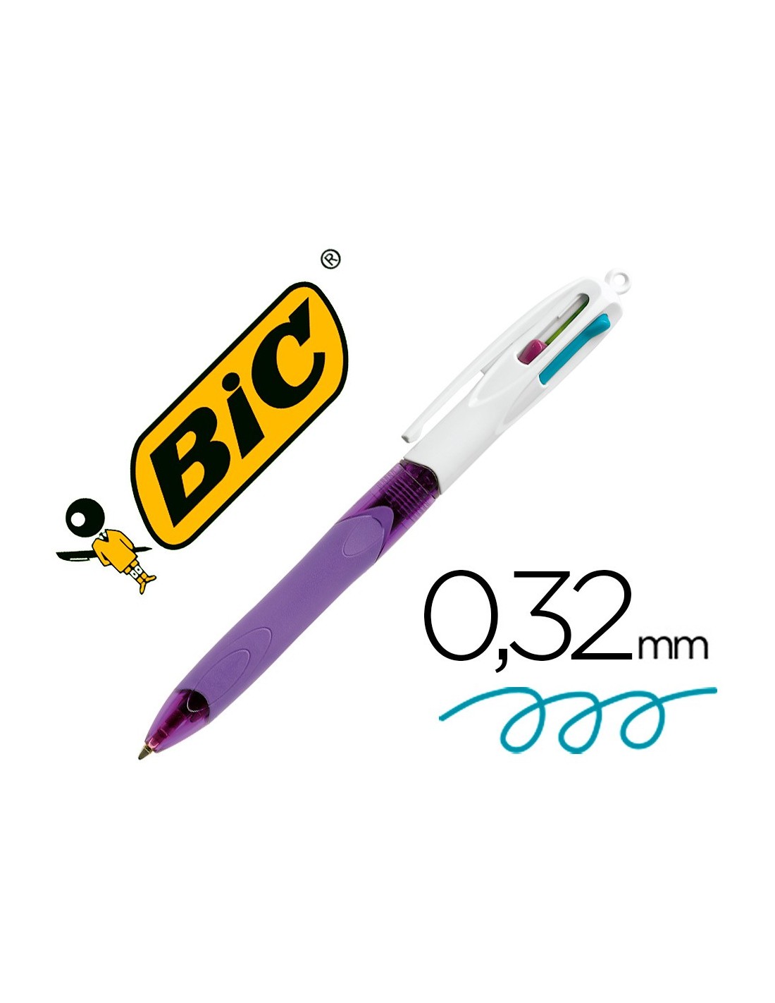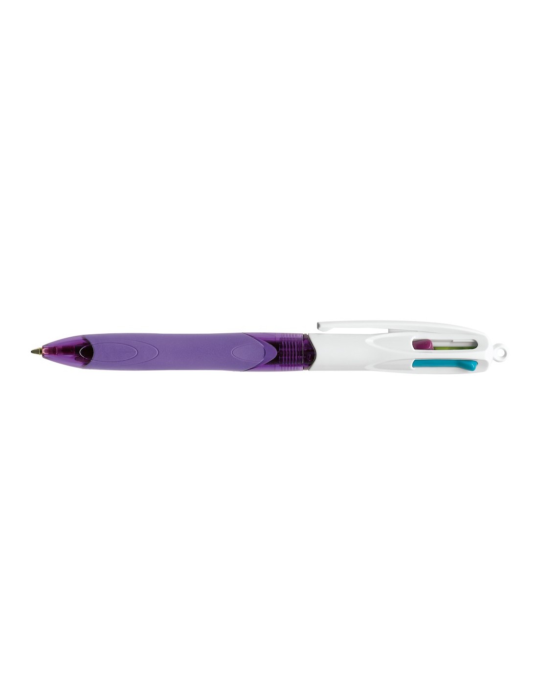 Bolígrafo 4 colores pastel. Cuerpo fabricado con grip de caucho que facilita la escritura. Ergonómico. Sistema para correa. Garantiza 8 km de escritura entre los 4 colores. Punta de 1 mm. Trazo de 0,4 mm.