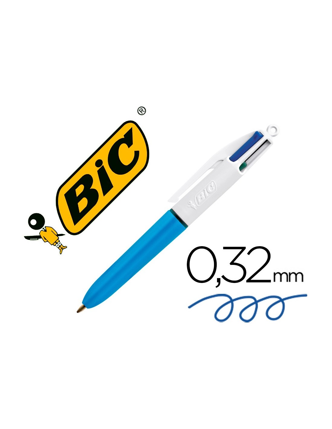 Bolígrafo retráctil 4 en 1. Escribe en azul, negro, rojo, verde. Permite corregir, marcar o diferenciar un texto con sólo pulsar el color de tinta elegido. Sistema para correa. El modelo convencional garantiza 8 km de escritura entre los 4 colores.