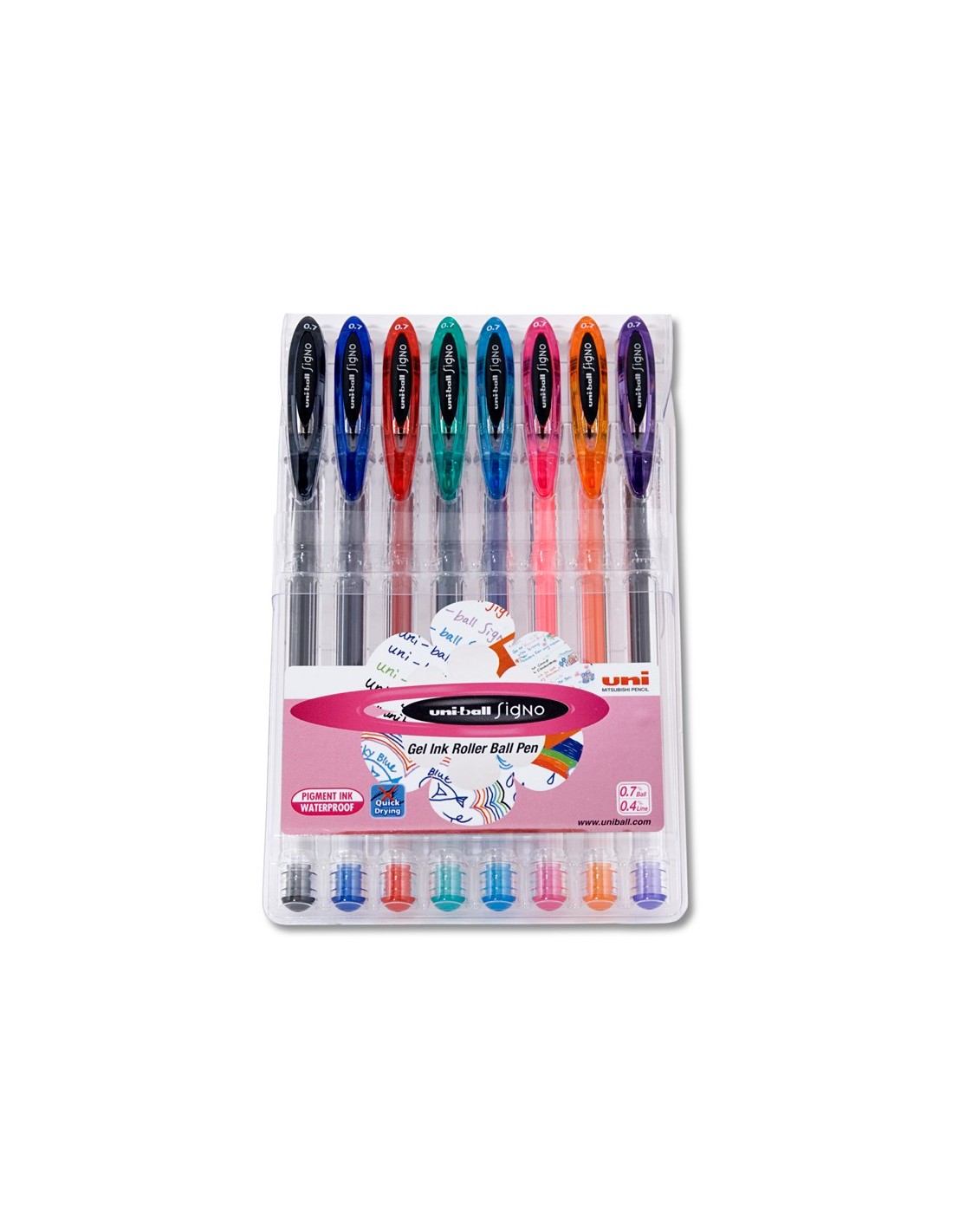 Tinta gel. Punta de acero inoxidable. Cuerpo de plástico. Clip exclusivo uni-ball. Amplia gama de colores junto a un excelente diseño. Tinta pigmentada resistente al agua y a la luz. Tiene una duración de 5 años. Punta de 0,7 mm. Trazo de 0,4 mm. Contiene 8 bolígrafos de colores surtidos.
