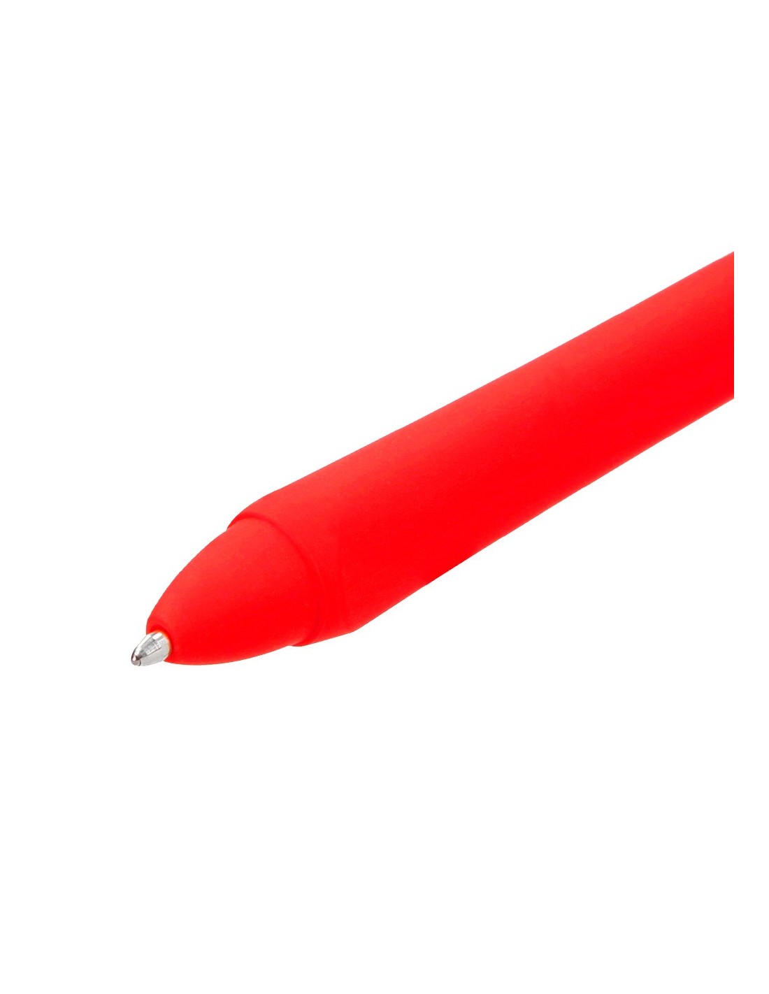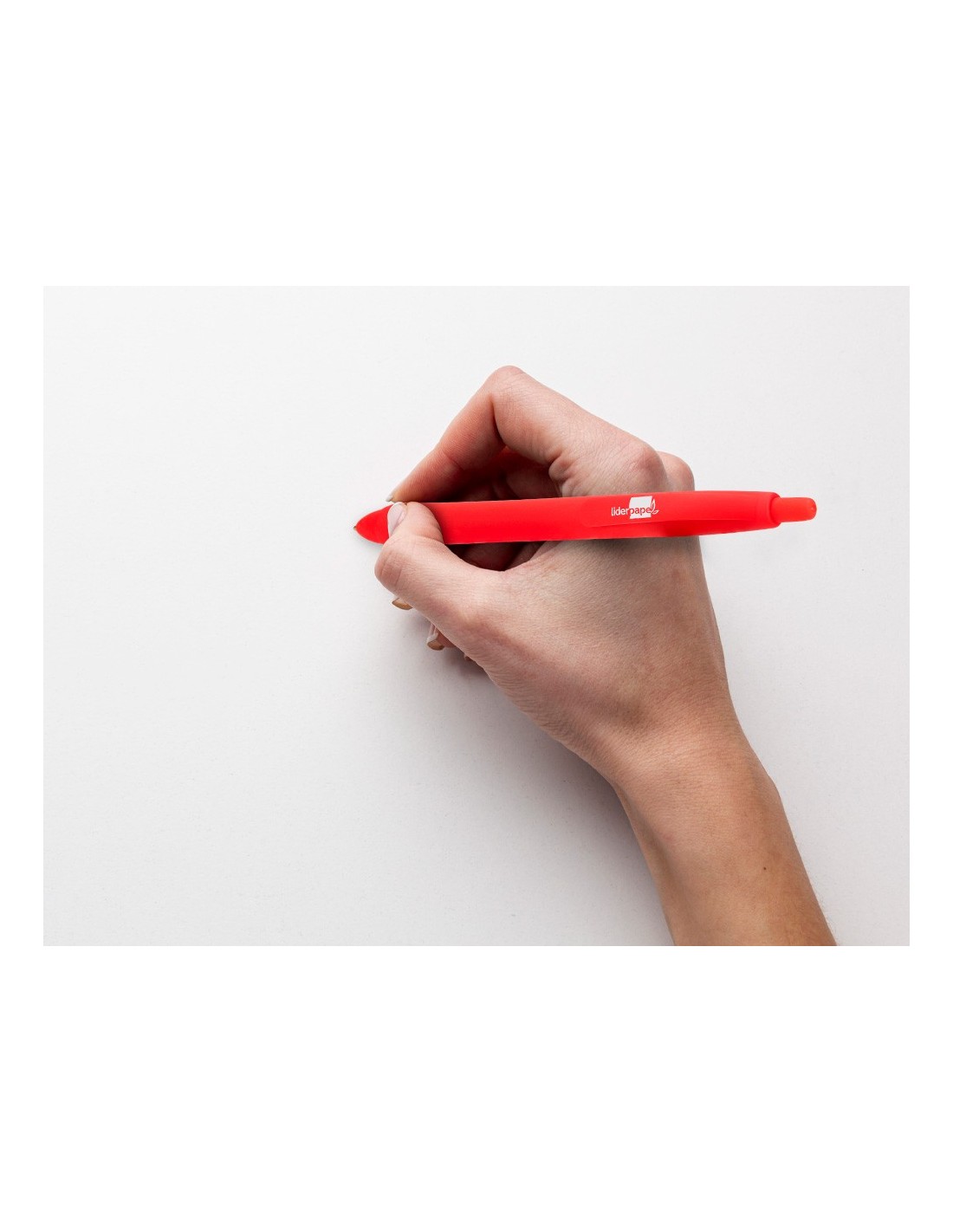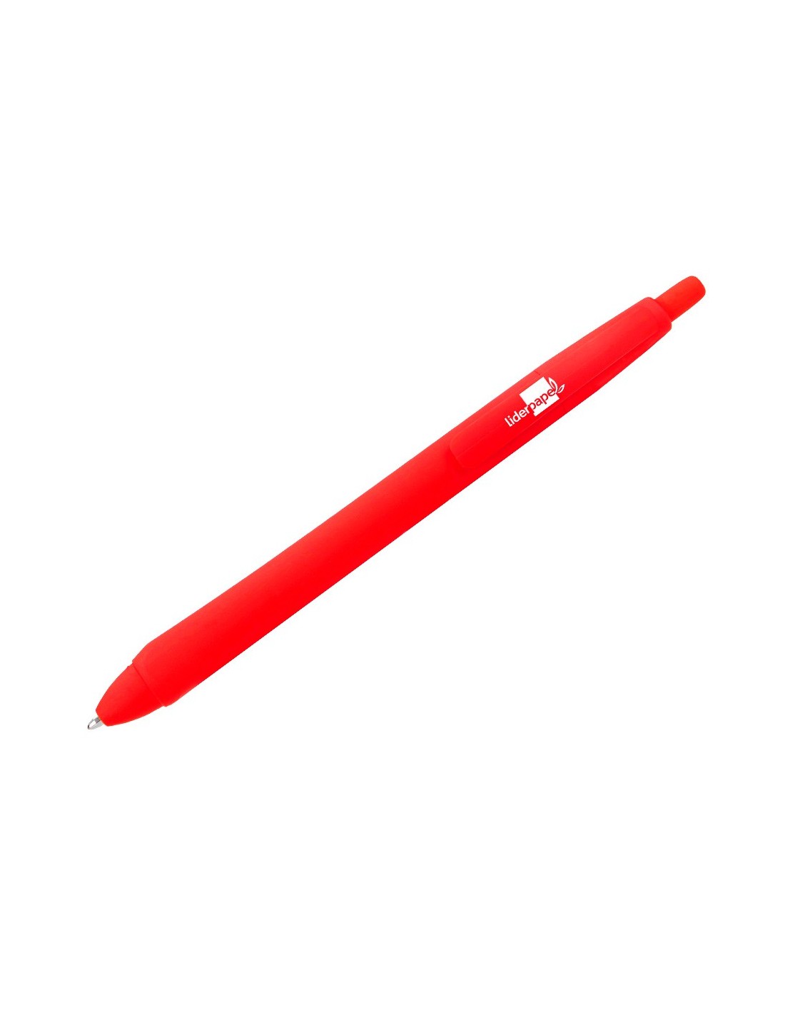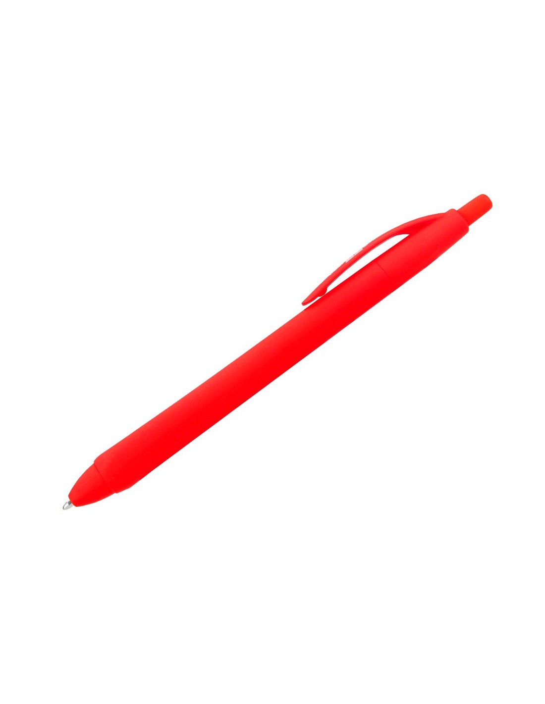Bolígrafo retráctil con cuerpo efecto goma. Tinta a base de aceite. Cuerpo del color de la tinta. Punta media. Trazo de 1 mm.