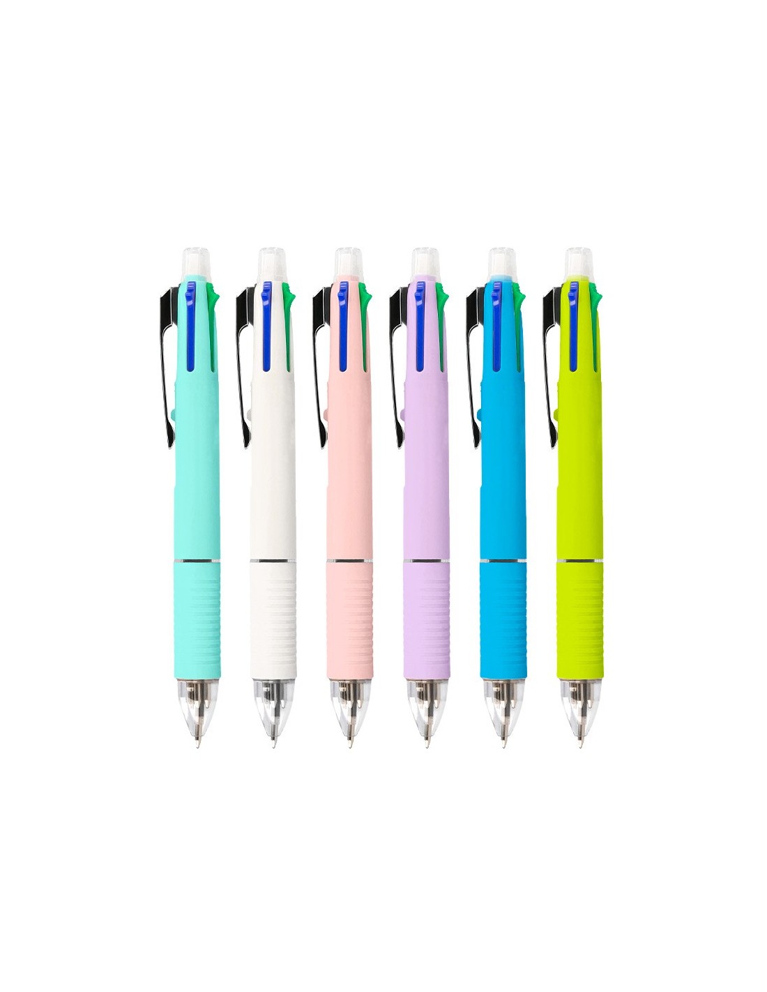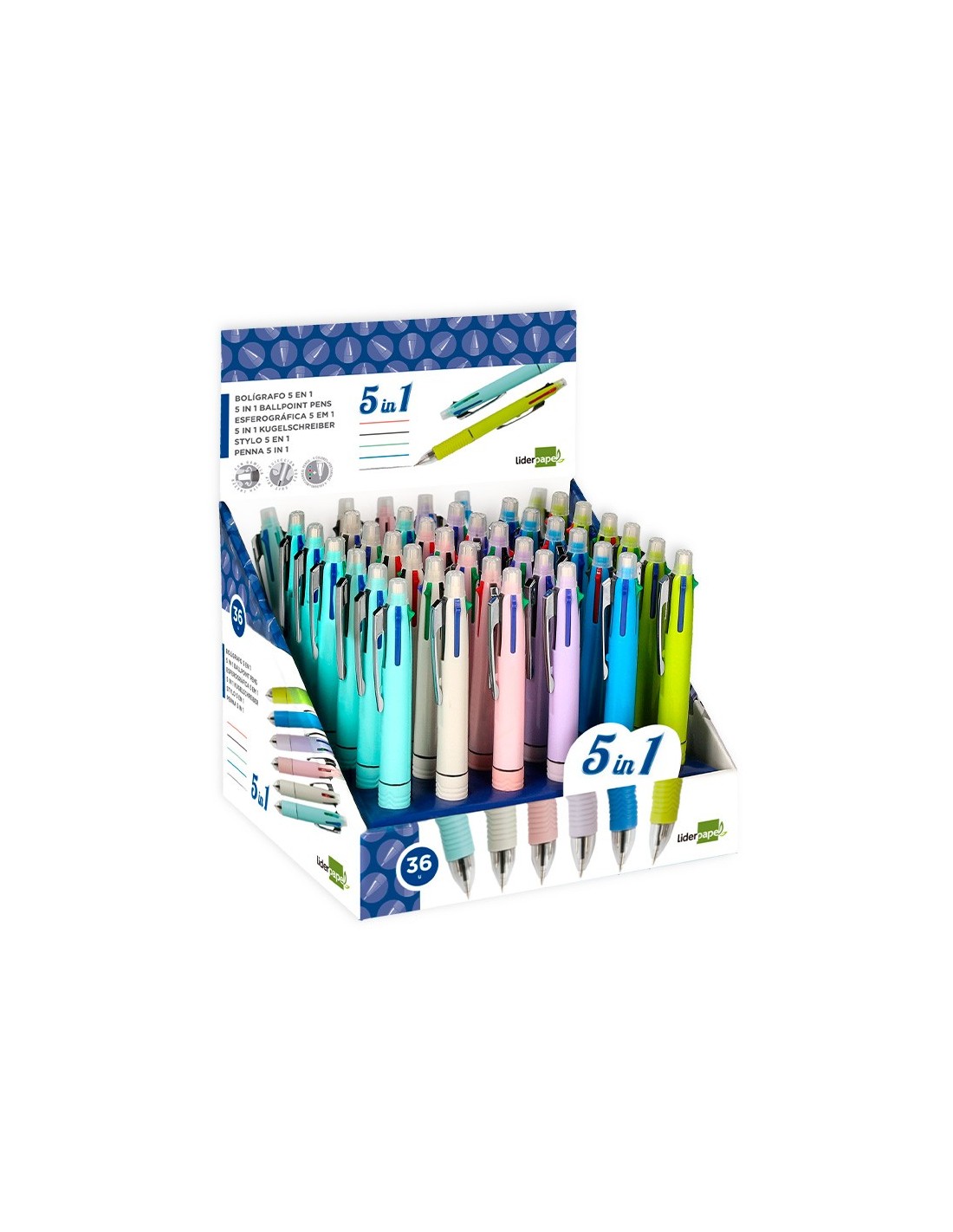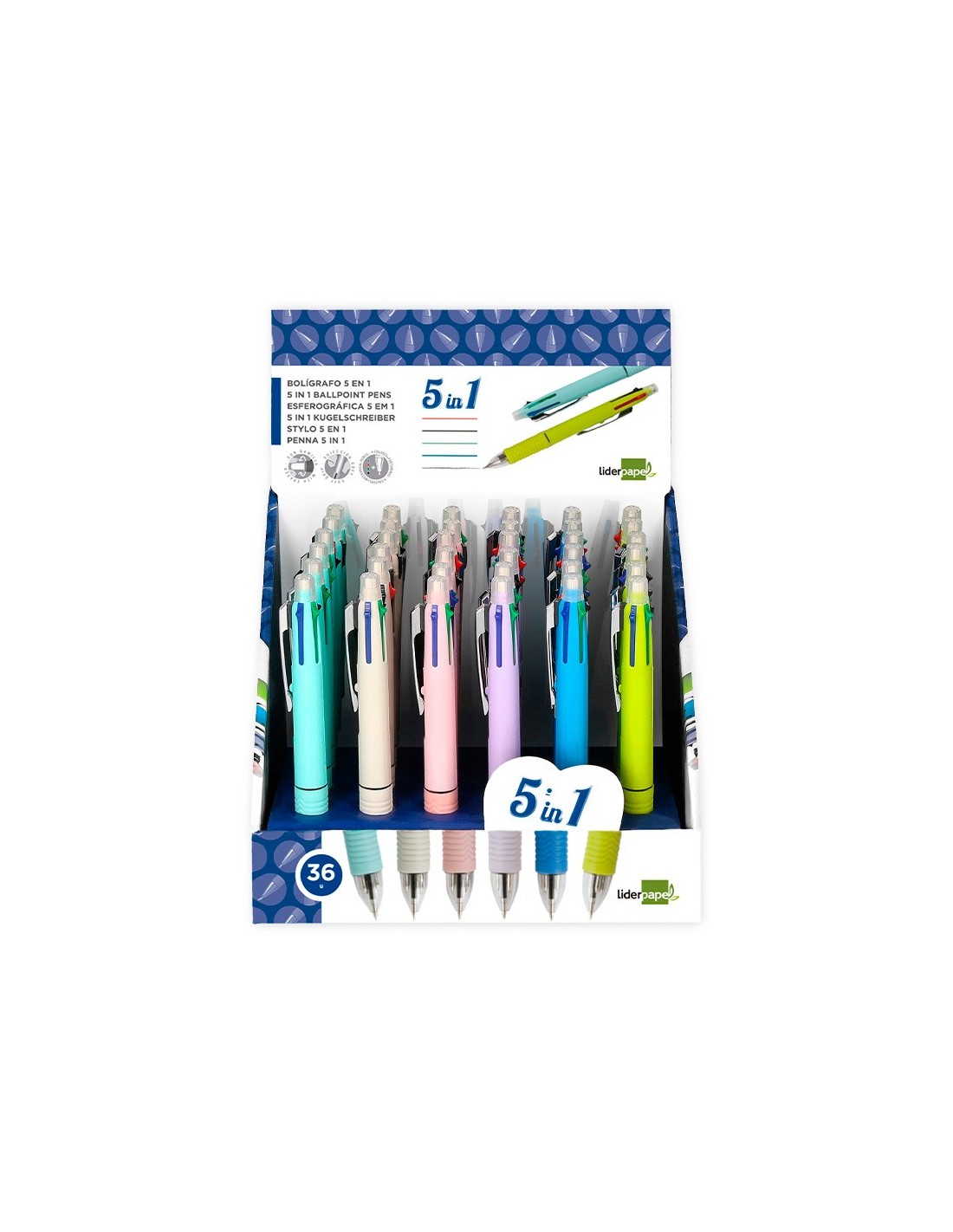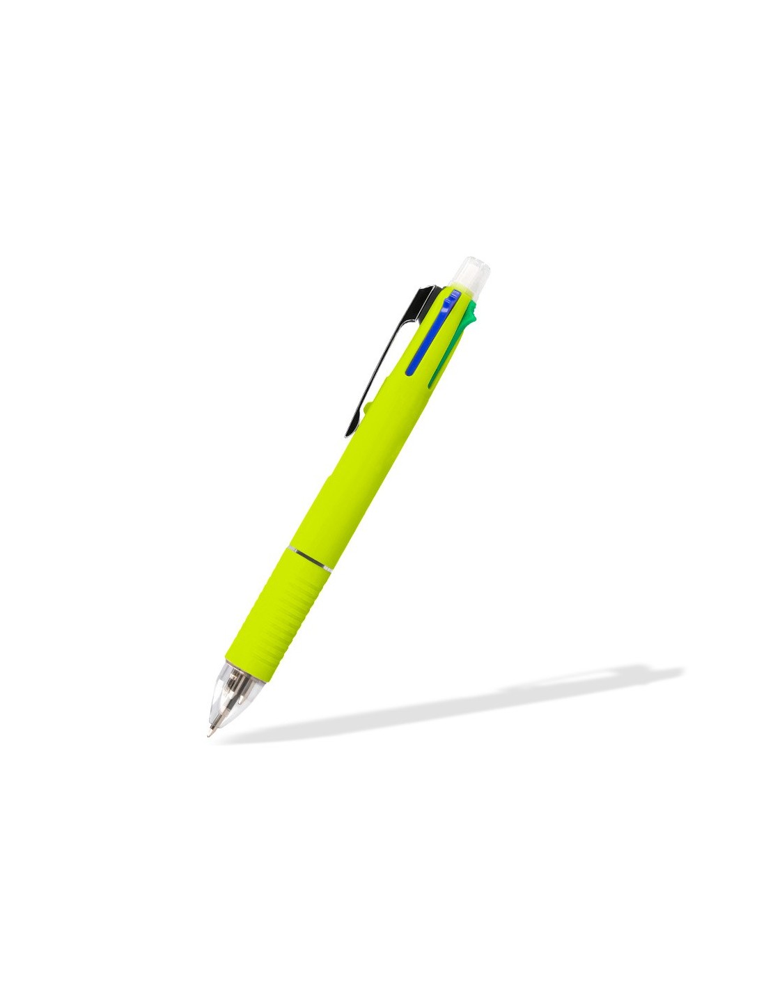 Bolígrafo retráctil multifunción con tinta a base de aceite. Completo sistema 5 en 1: con 4 colores de tinta (azul, negro, rojo y verde) y portaminas. Cuerpo de plástico en diferentes colores vivos y clip metálico. Grip de caucho en la parte inferior para una mayor comodidad en la escritura. Con goma de borrar protegida incluida en el pulsador. Punta de 1 mm. Trazo del bolígrafo de 0,7 mm. Trazo del portaminas de 0,5 mm.