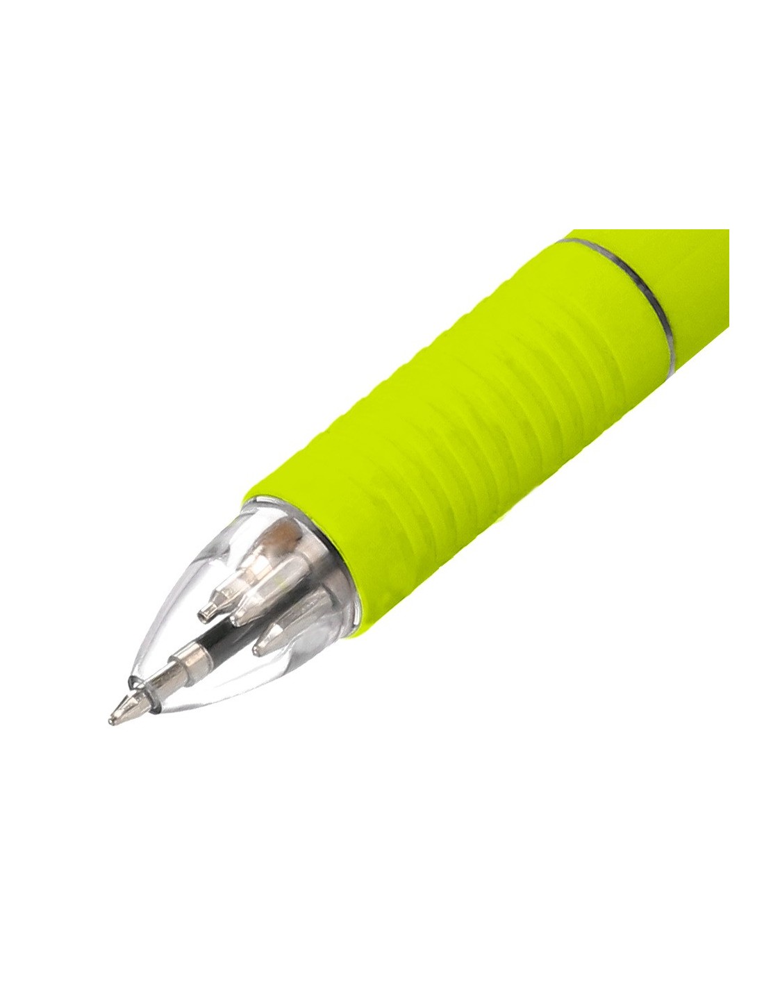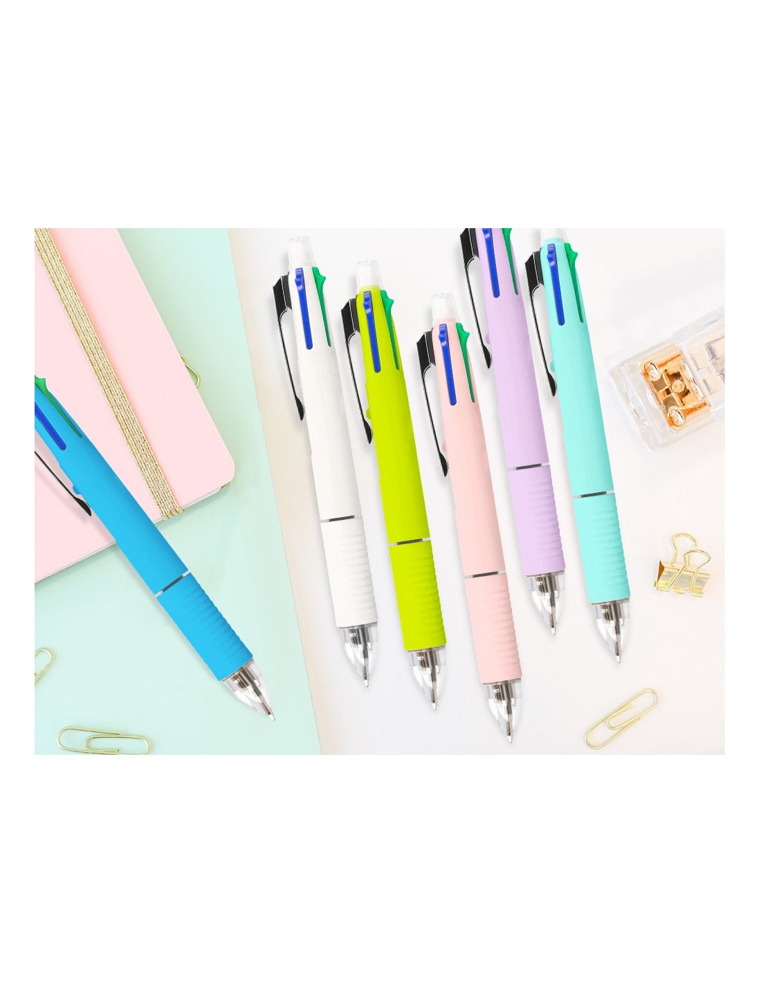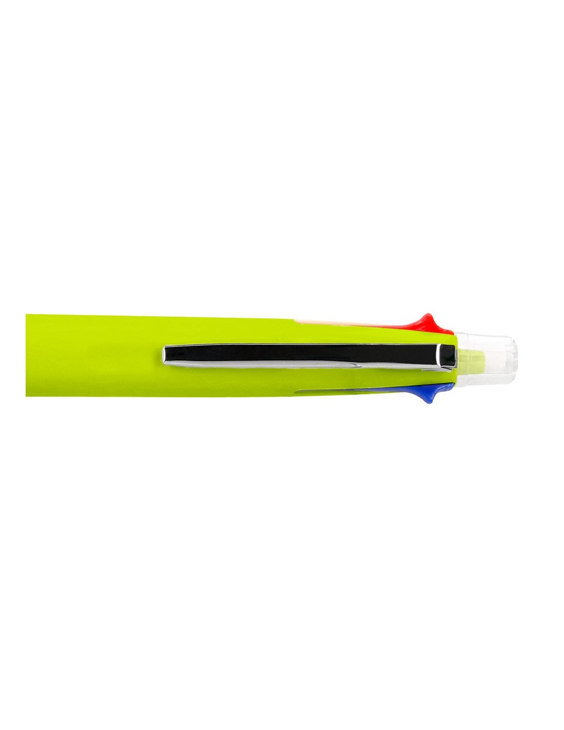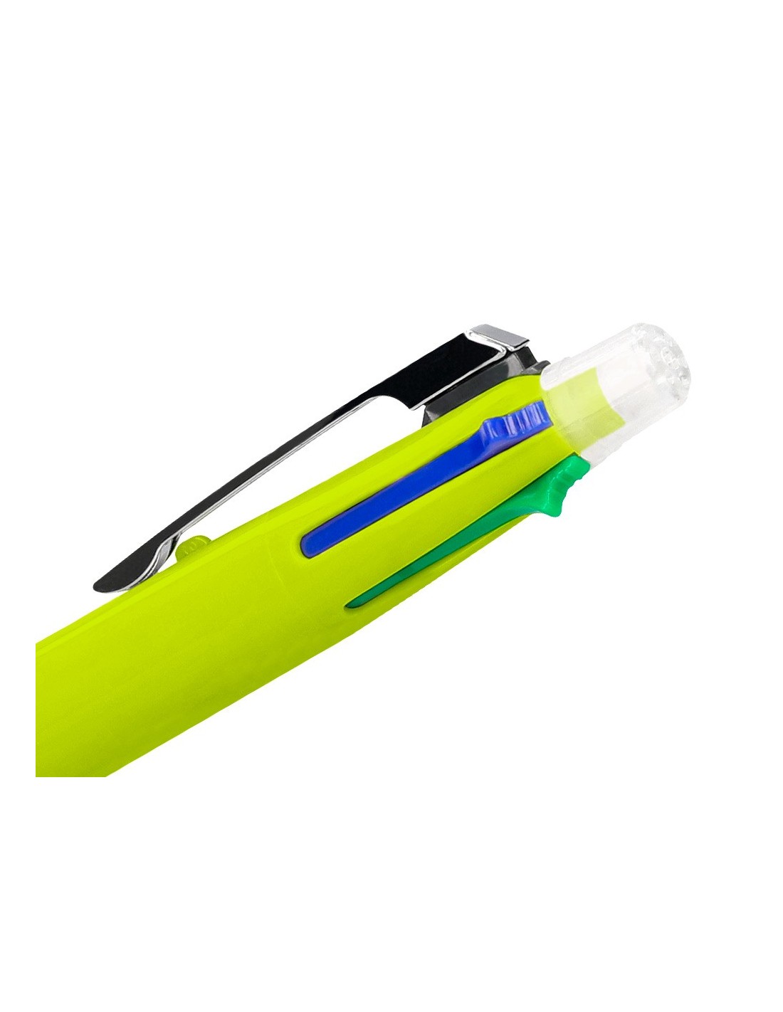 Bolígrafo retráctil multifunción con tinta a base de aceite. Completo sistema 5 en 1: con 4 colores de tinta (azul, negro, rojo y verde) y portaminas. Cuerpo de plástico en diferentes colores vivos y clip metálico. Grip de caucho en la parte inferior para una mayor comodidad en la escritura. Con goma de borrar protegida incluida en el pulsador. Punta de 1 mm. Trazo del bolígrafo de 0,7 mm. Trazo del portaminas de 0,5 mm.