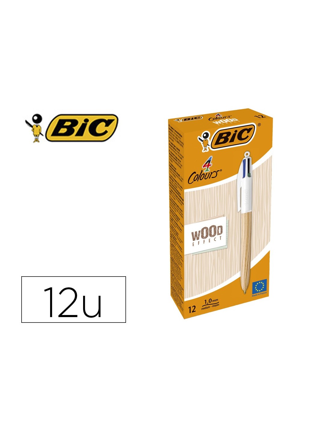 Con cuerpo cubierto con un atractivo diseño de aspecto natural, estos 12 bolígrafos BIC 4 Colours Wood Style son una versión lúdica y actual del icónico BIC 4 Colores. Las cuatro puntas medias de 1,0 mm de estos bolígrafosversátiles se adaptan perfectamente a todo tipo de usos. Los recambios de tinta de cuatro colores (azul, rojo, verde y negro) hacen que organizar y memorizar notas sea mucho más sencillo. Fabricado en Francia y diseñado p ara durar, este bolígrafo ofrece un total de 8 km de escritura.