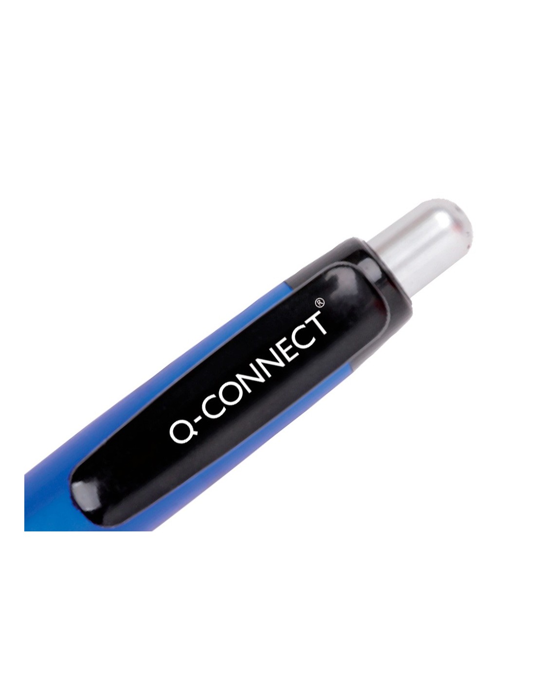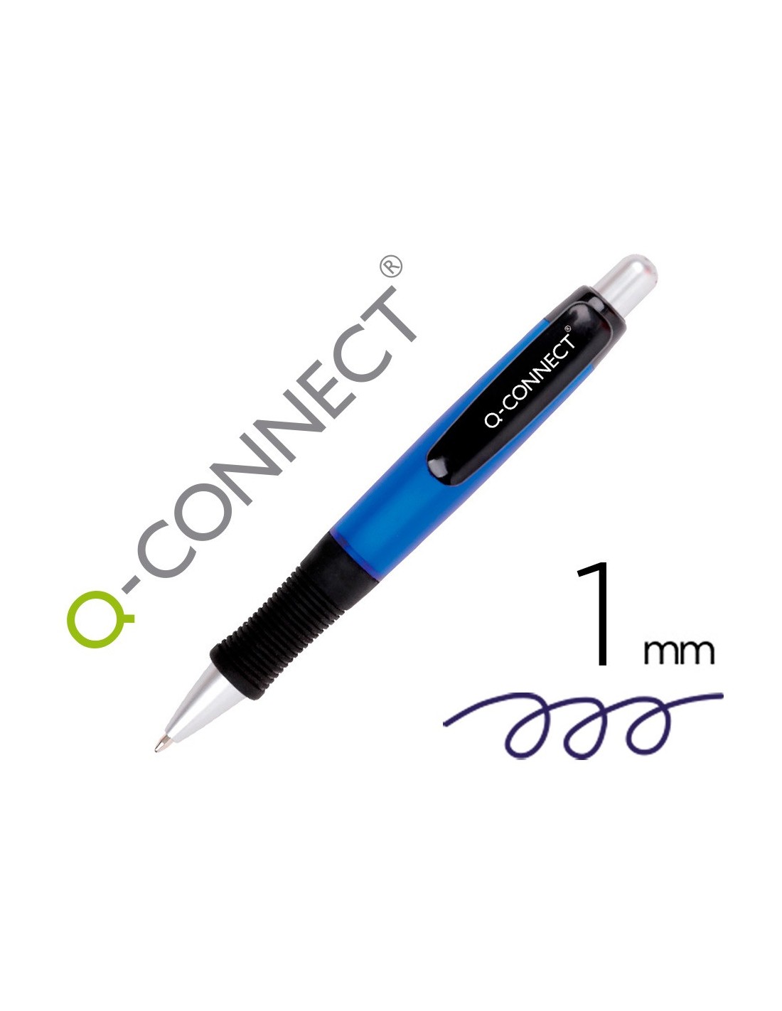 Bolígrafo retráctil con sujeción de caucho. Cuerpo ergonómico de ABS y agarre antideslizante de caucho para mayor comodidad. Clip hecho de material reciclable. Tinta azul a base de aceite. Punta de 1 mm. Trazo de 0,7 mm.