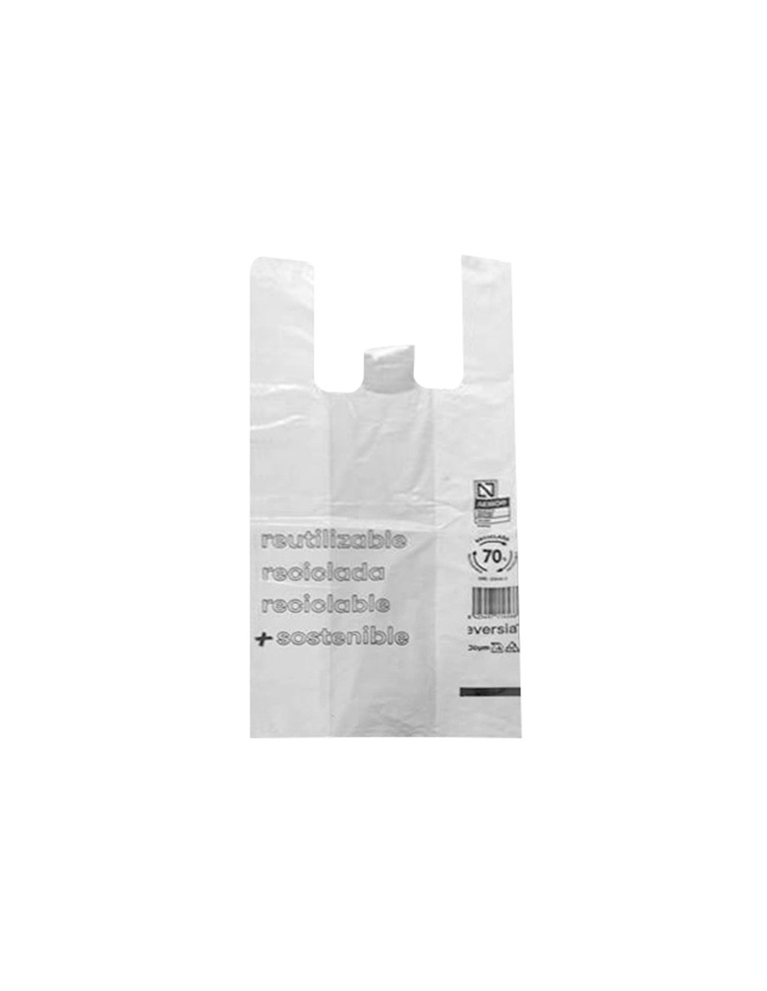 Bolsas camiseta de plástico blanco sin impresión con un 70% de material reciclado aptas para legislación de bolsas 2022.