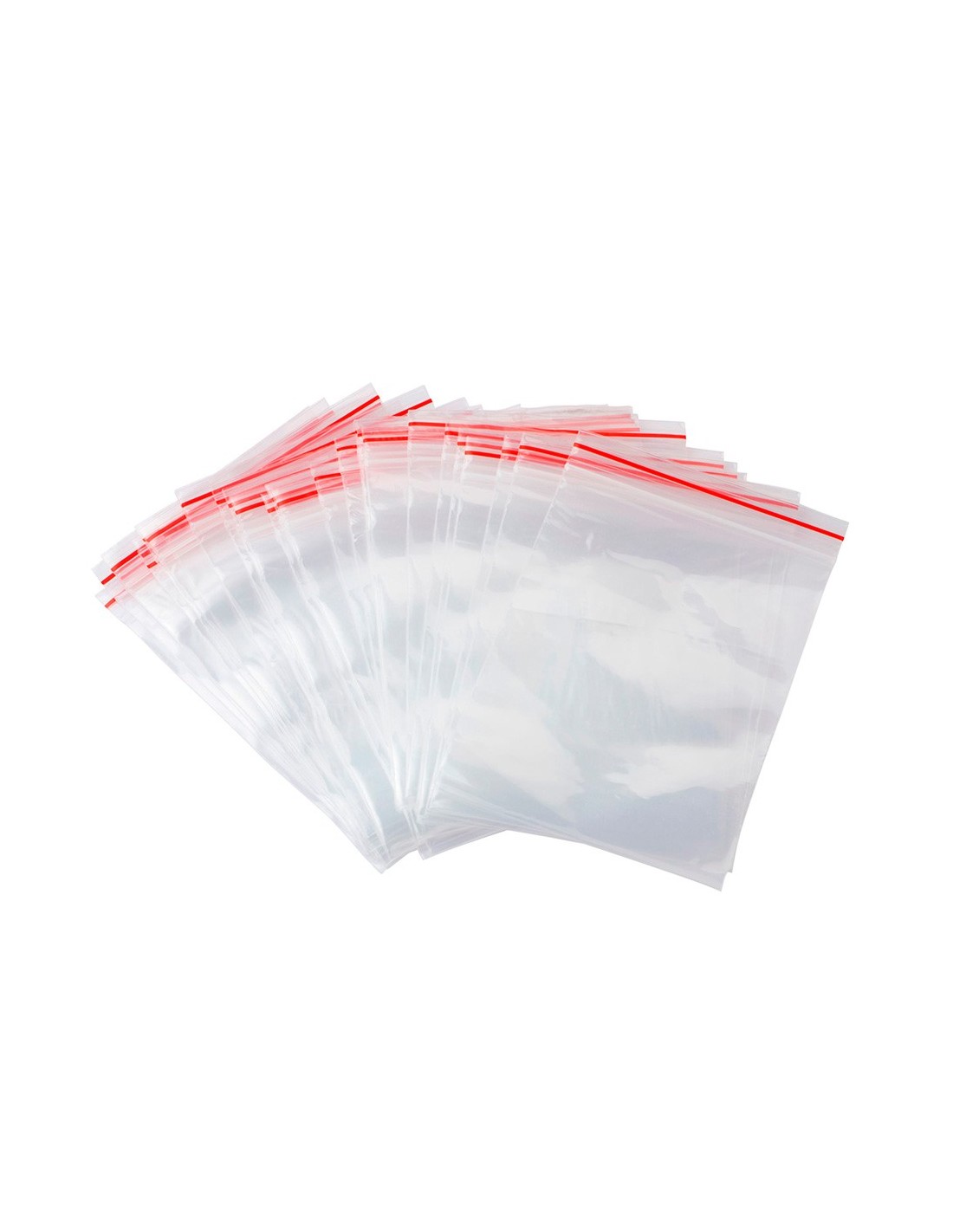 Bolsas fabricadas en plástico con sistema de autocierre por presión fáciles de volver a sellar. Color transparente con una línea roja y una perforación de 6 mm sobre el sello. Ideales para almacenar pequeños suministros de oficina o incluso alimentos. Grosor: 50 micras.