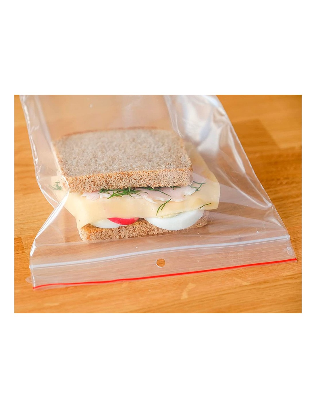 Bolsas fabricadas en plástico con sistema de autocierre por presión fáciles de volver a sellar. Color transparente con una línea roja y una perforación de 6 mm sobre el sello. Ideales para almacenar pequeños suministros de oficina o incluso alimentos. Grosor: 50 micras.
