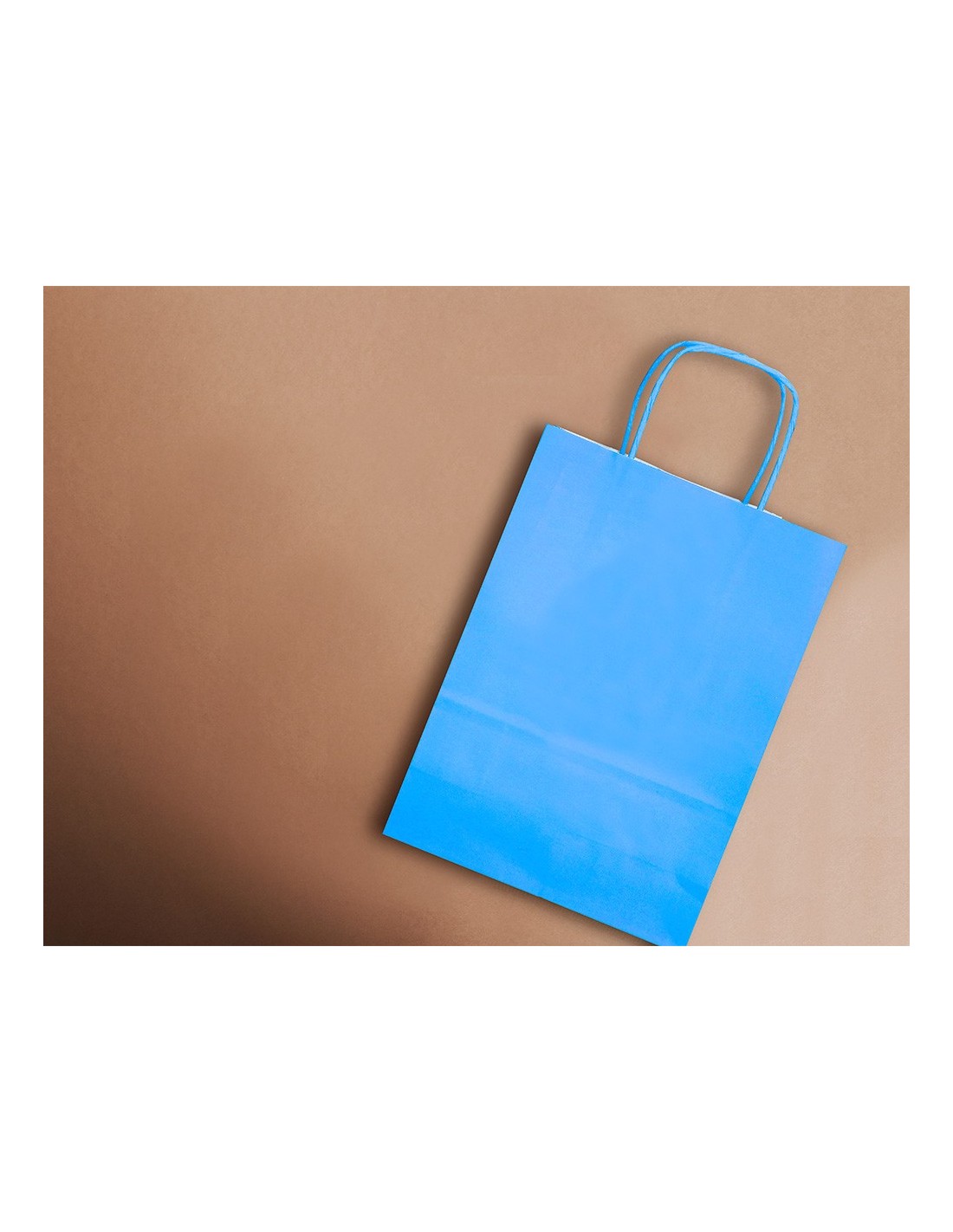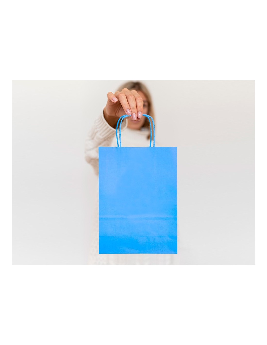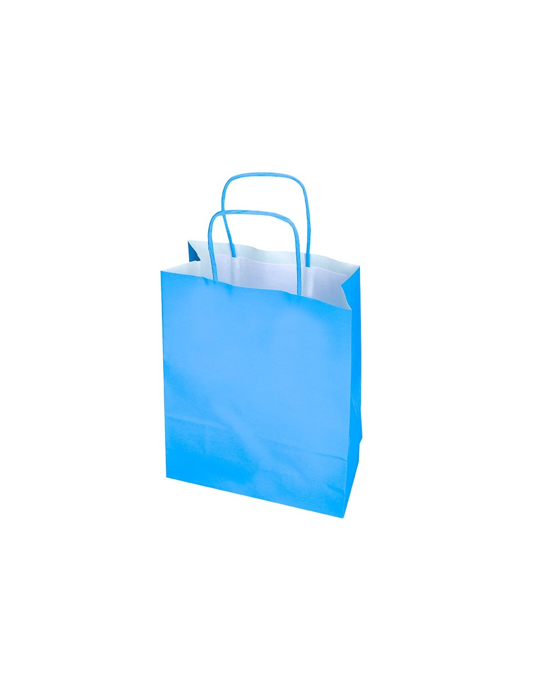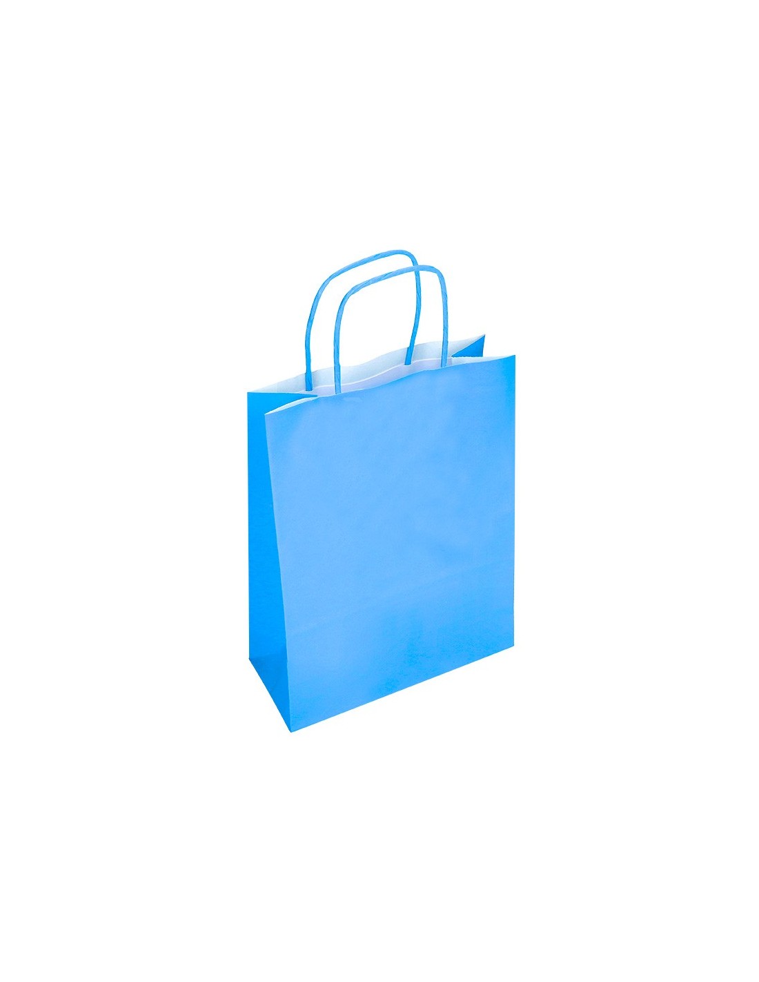 Bolsa de papel con asa retorcida celulosa celeste \"S\" 240x100x320 mm. Paquete de 25 unidades.