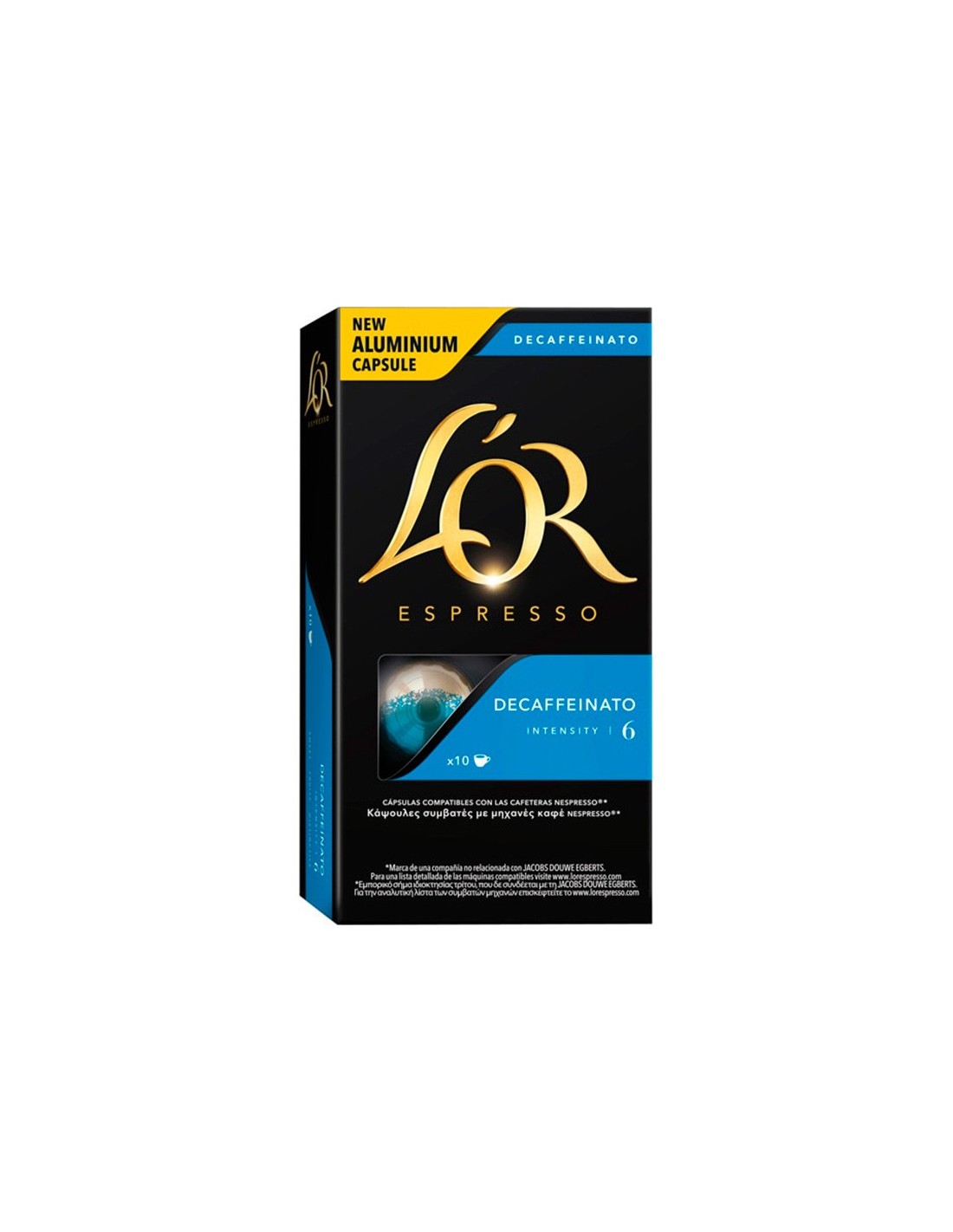 Café LOR Espresso en cápsulas que mantienen intacto el aroma y el sabor. Descafeinado. Intensidad 6. Compatible con Nesspreso. Caja de 10 cápsulas.