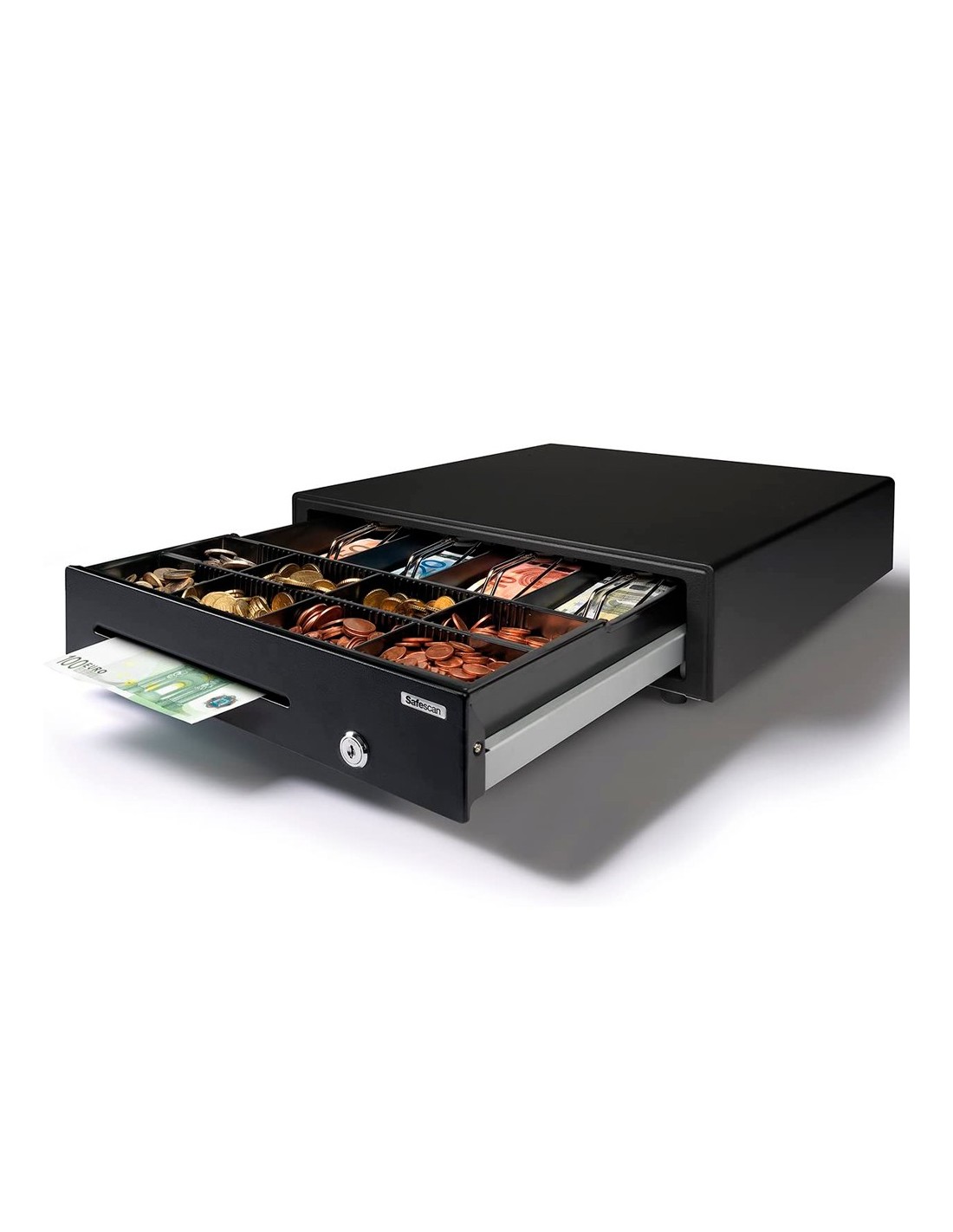Robustos rodillos con cojinetes de bolas. Testado para al menos 1 millón de aperturas. Robustas pinzas de metal. Sencilla apertura por presión. Gaveta ajustable y extraíble. 4 compartimentos para billetes y 8 compartimentos para monedas. Compatible con cajas registradoras con conexión RJ12 (12V). Medidas: 410 x 115 x 415 mm. Peso: 6,6 kg.