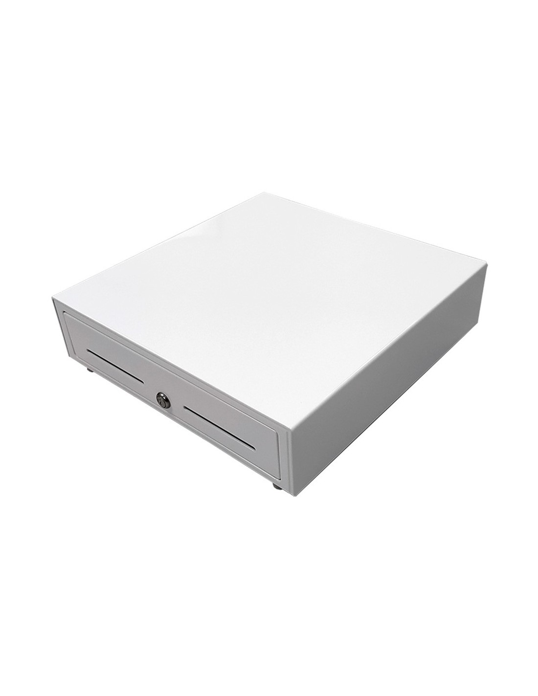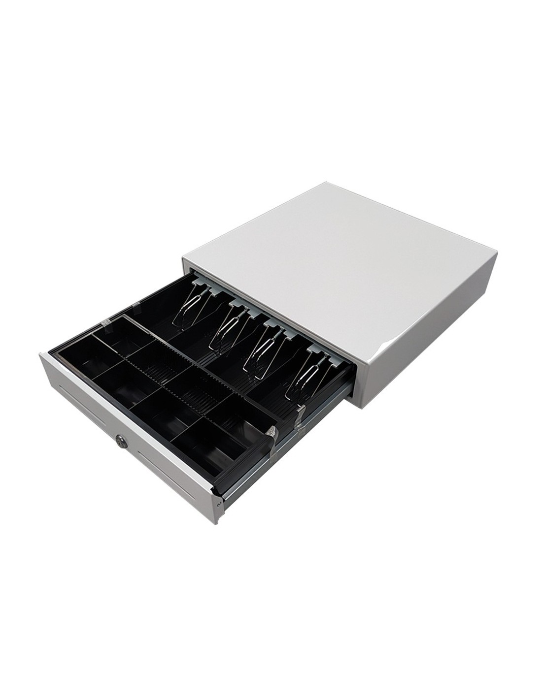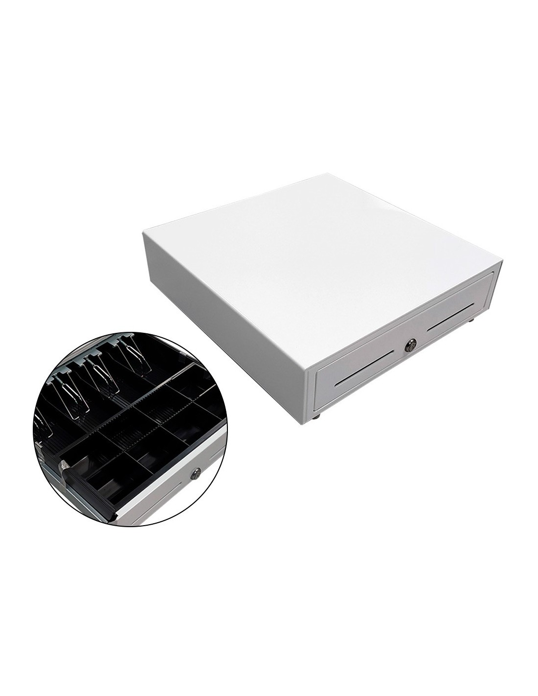 Cajón metálico grande blanco. Alta calidad. Ranura frontal. Conexión eléctrica para apertura automática y cerradura con llave. 8 monedas y 4 billetes. Gaveta extraíble .