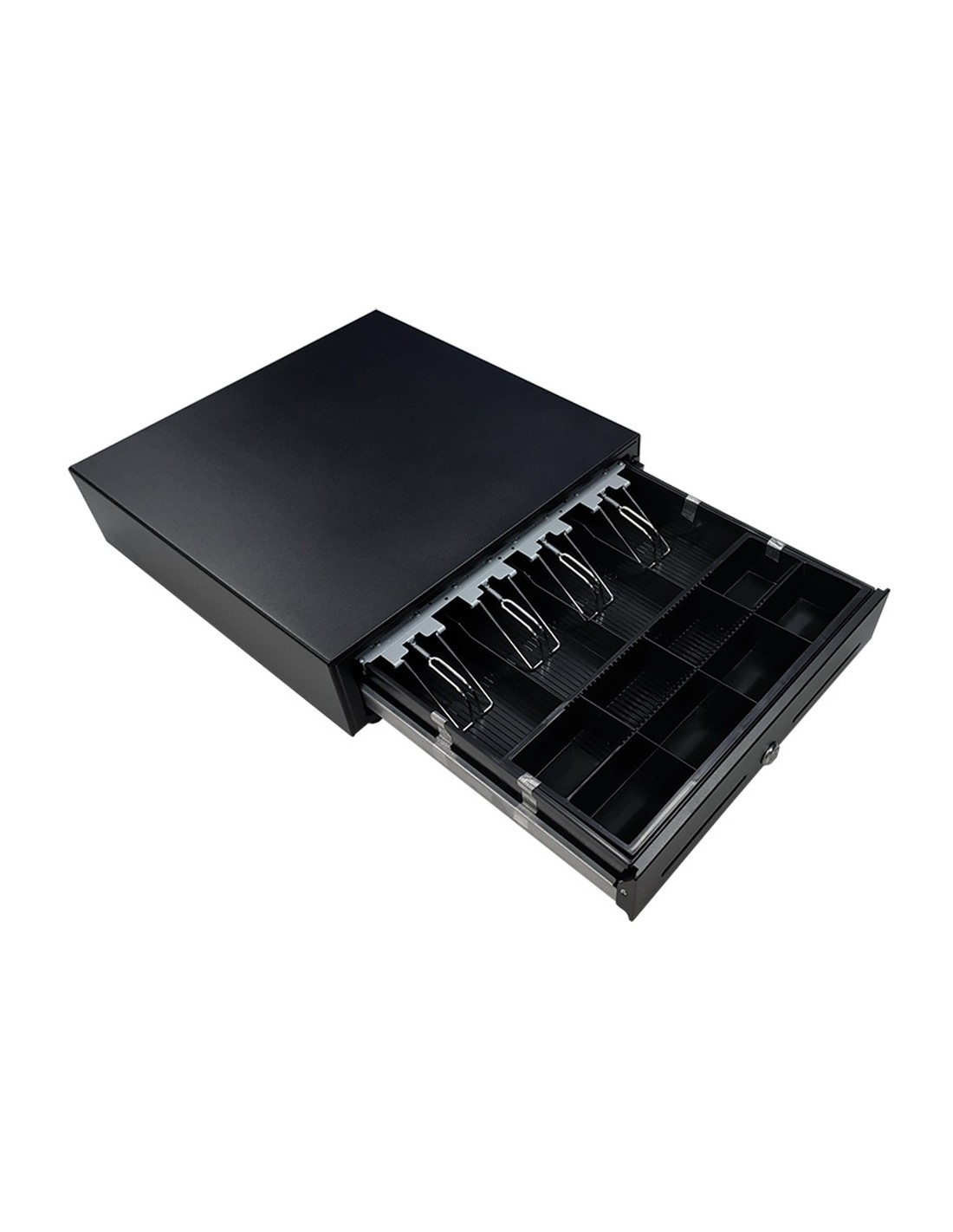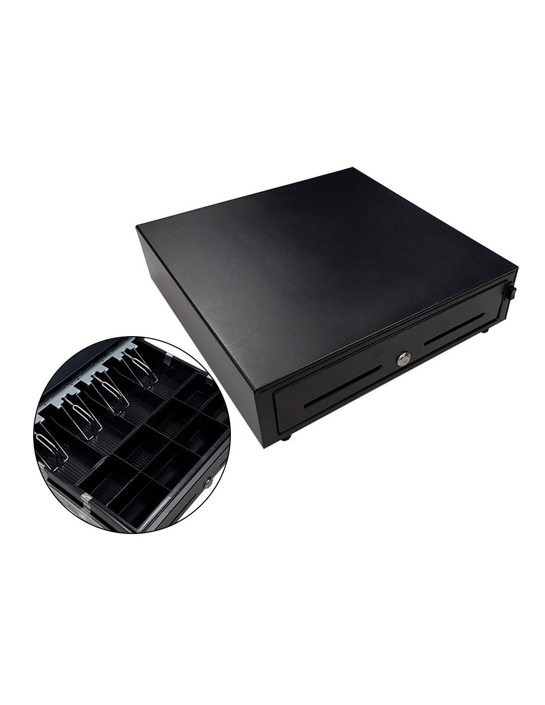 Cajón metálico grande negro. Alta calidad. Ranura frontal. Tiene un botón de apertura en la parte superior derecha y cerradura con llave. Gaveta extraíble para 8 monedas y 4 billetes.