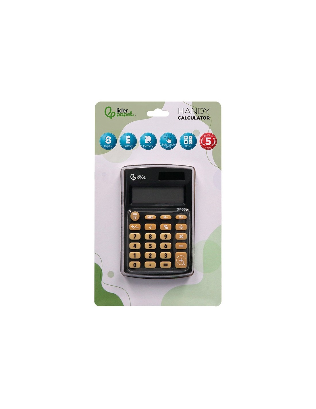 Calculadora de bolsillo de 8 dígitos. Funciones de encendido y apagado, raíz cuadrada, porcentaje, suma y resta de memoria. Usa pilas LR1130. Con pilas. Medidas: 99 x 64 x 9 mm. Peso: 105 g.