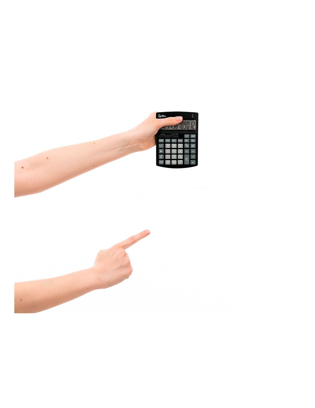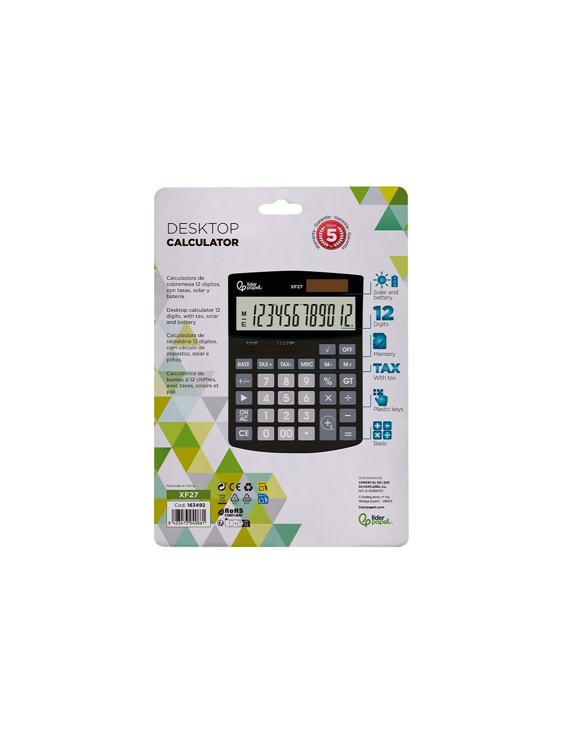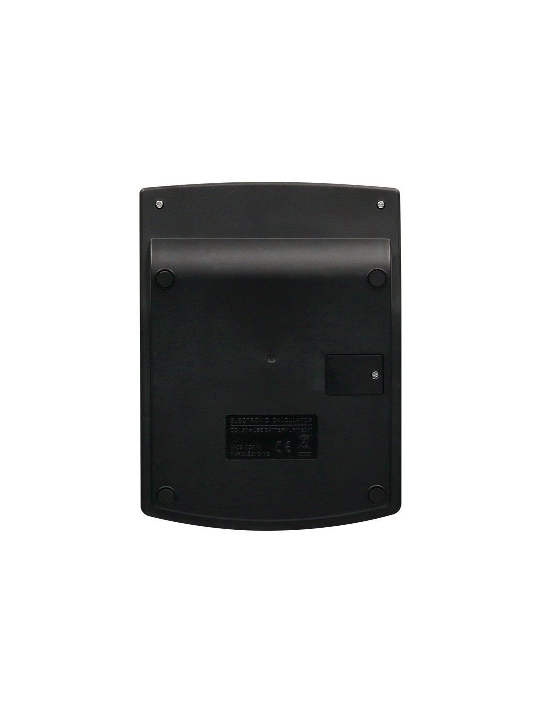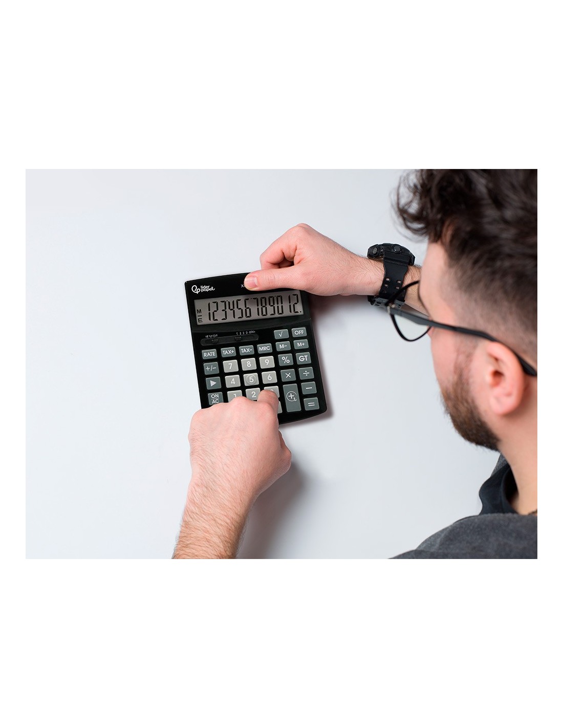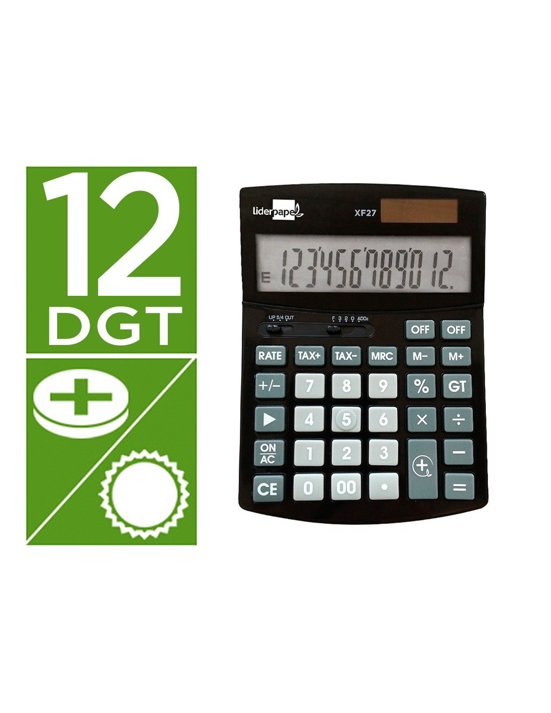 Calculadora de sobremesa de 12 dígitos. Teclas de encendido y apagado. Funciones de tasas y ratio, redondeo decimal, posición decimal, función GT. Tecla doble cero y de corrección de entrada. Solar y a pilas. Funciona con pilas LR1130. Color negro. Medidas: 155 x 115 x 25 mm. Peso: 265 g.