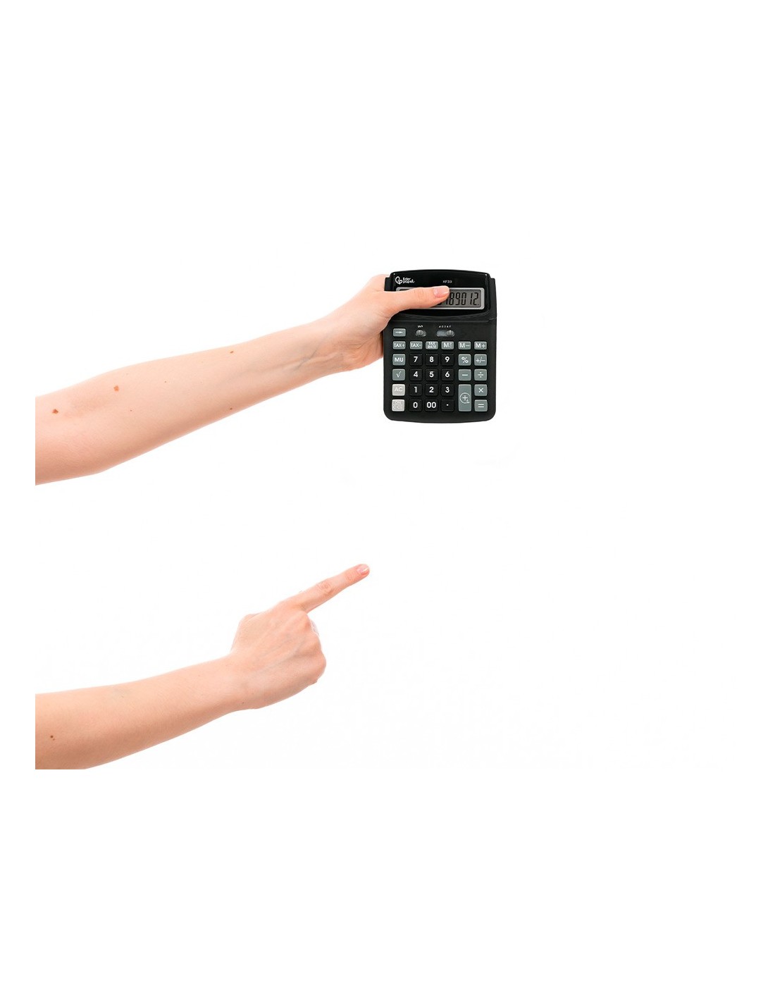 Calculadora de sobremesa grande de 12 dígitos. Fabricada con un 40% en plástico reciclado, respetuosa con el Medioambiente. Pantalla reclinable. Teclas de plástico. Tecla de encendido. Autoapagado. Tecla de redondeo decimal. Tecla de posición decimal. Tecla de doble cero. Tecla de check. Tecla de raíz cuadrada. Porcentaje. Suma y resta de memoria. Pulsación de rápida respuesta. Autoapagado. Medidas: 190 x 140 x 32 mm. Solar y pilas. Color negro.