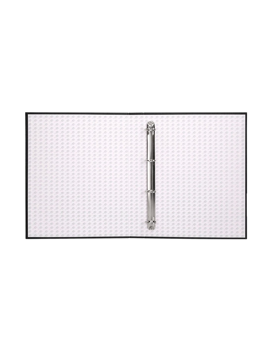 Carpeta cartón entrecolado de 1,75 mm de espesor, forrado con papel de encuadernación plastificado, gofrado tela en PVC. Con anillas mixtas. Tamaño folio. Medidas: 260 x 332 mm.