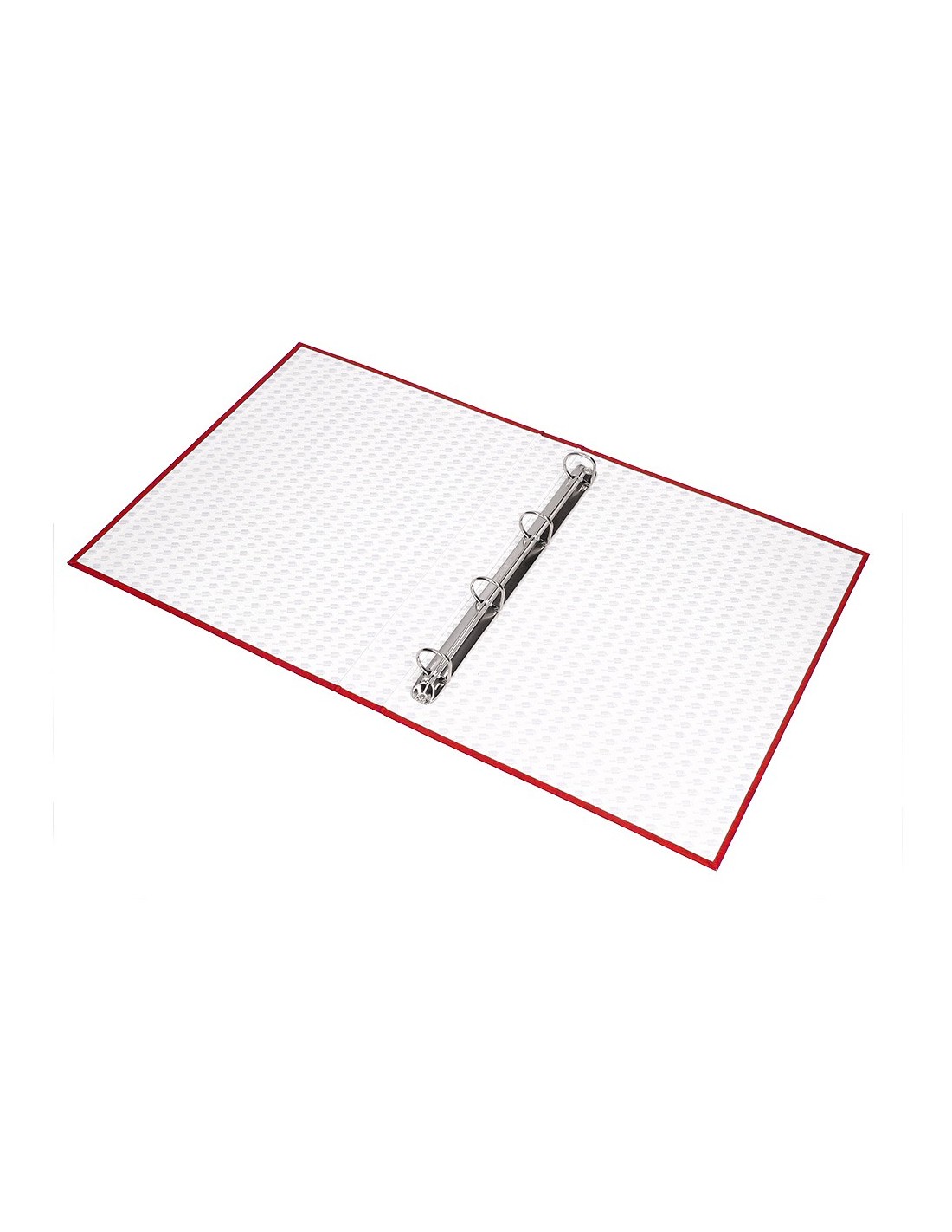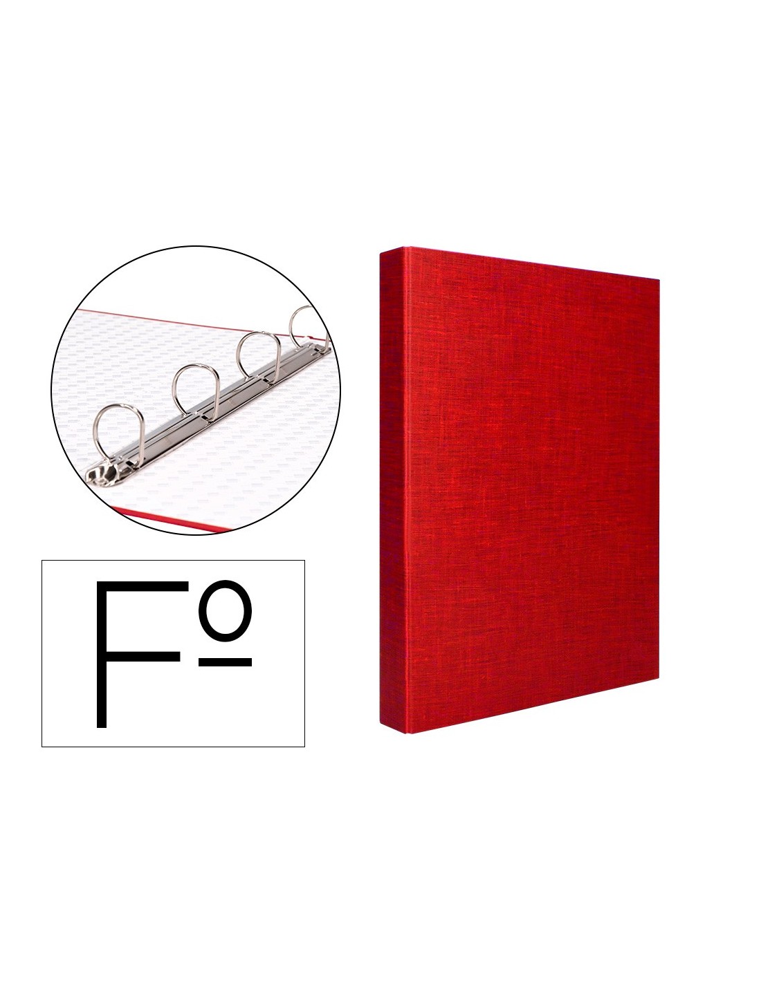 Carpeta cartón entrecolado de 1,75 mm de espesor, forrado con papel de encuadernación plastificado, gofrado tela en PVC. Con anillas mixtas. Tamaño folio. Medidas: 260 x 332 mm.