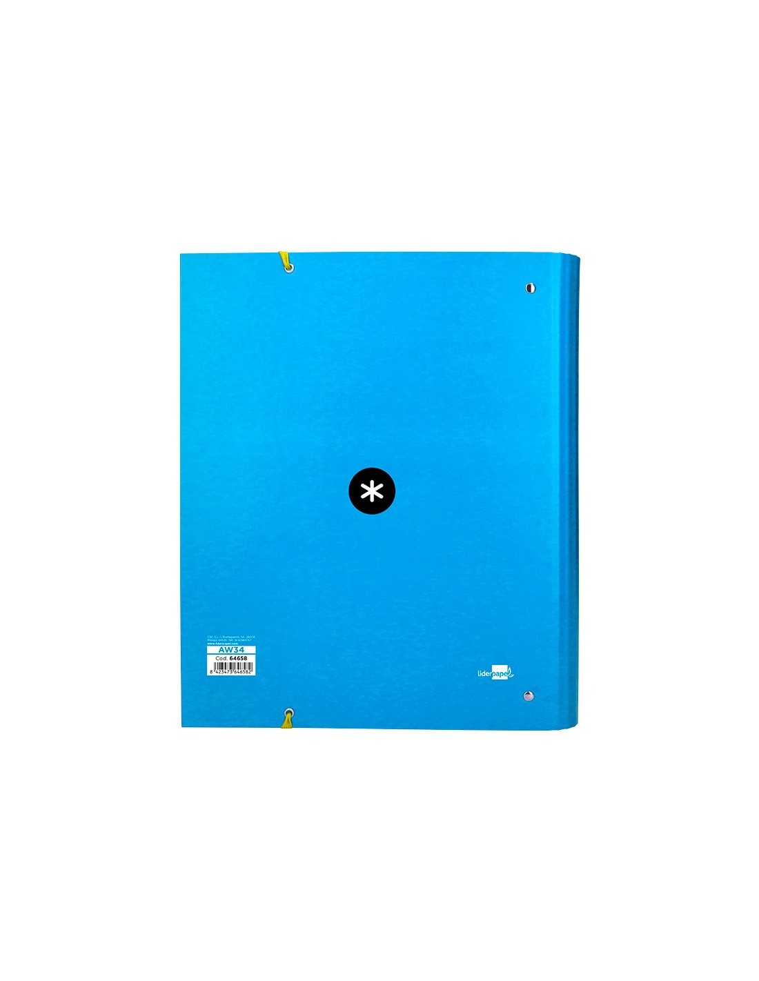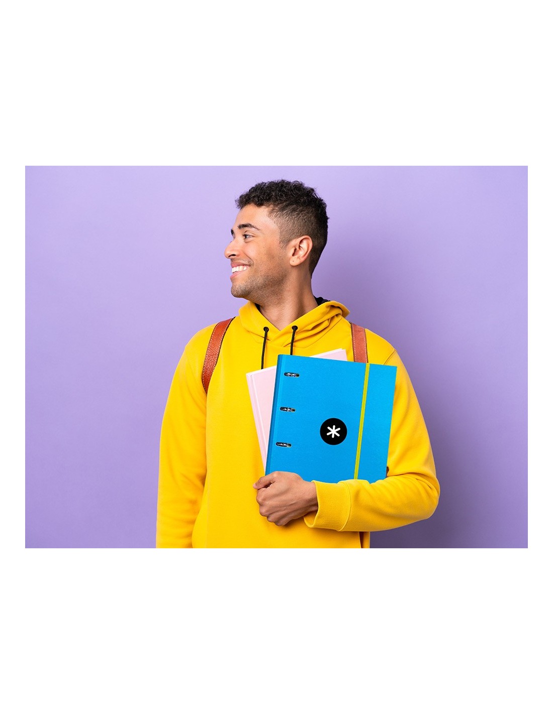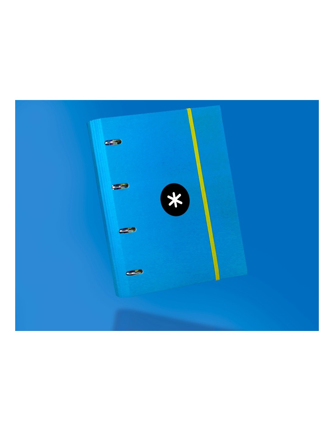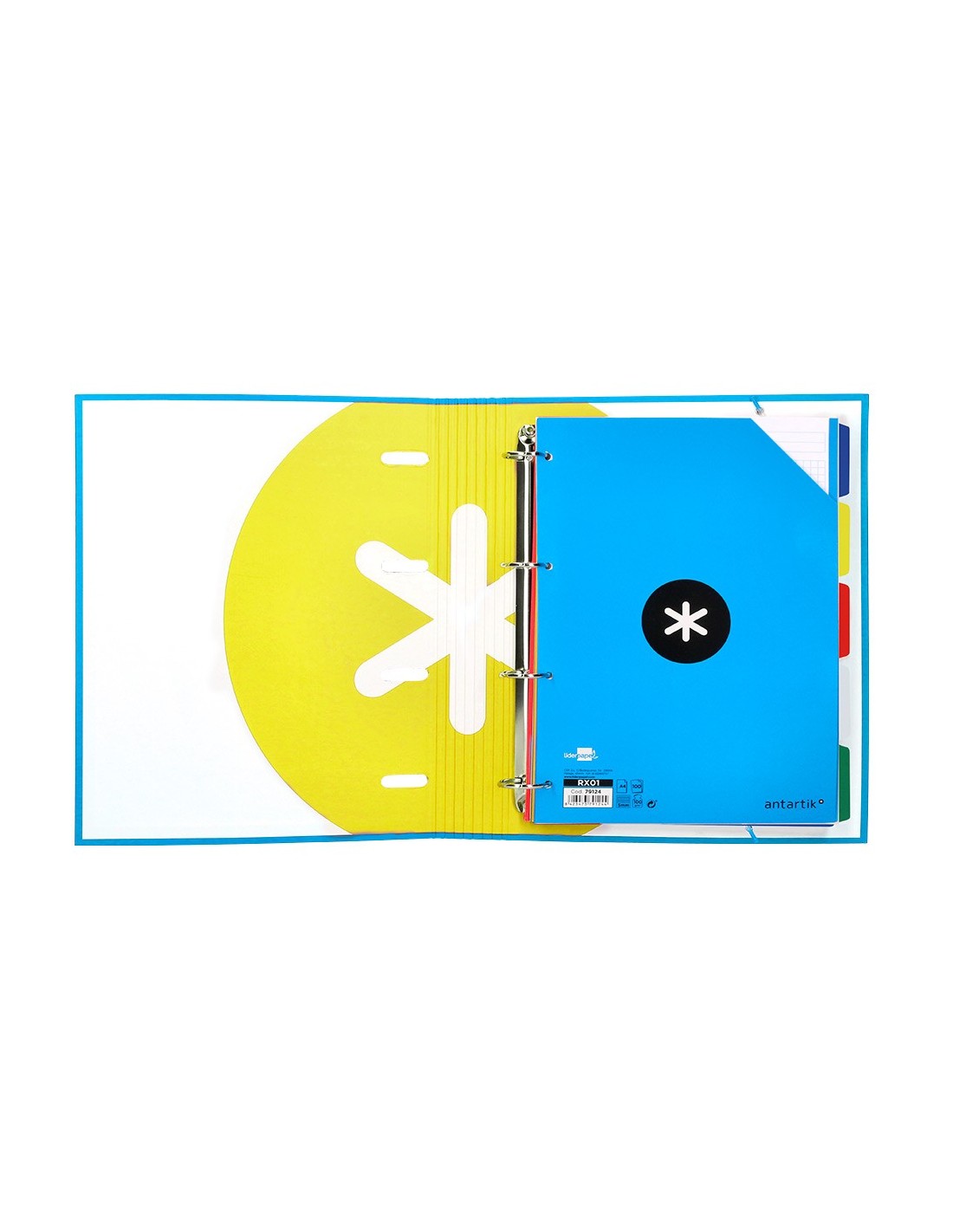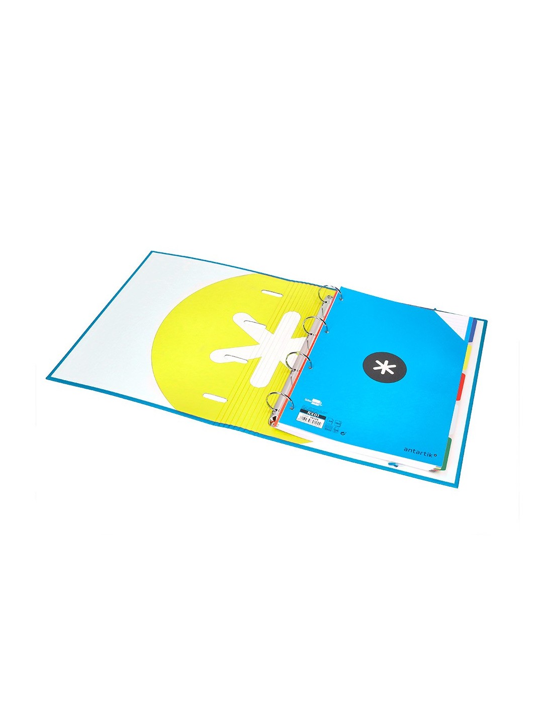Tapa de cartón forrado de 1,75 mm de espesor. Forrada en papel estucado mate de 135 g/m² impreso. Plastificada mate con detalles barniz UVI. 4 anillas redondas. Cierre de gomilla. Con ranuras para anillas. 100 hojas con 5 bandas de color y 4 taladros. Papel interior extrablanco de 90 g/m². Ultr asuave. Cuadrícula de 5 mm. Formato DIN A4. Guarda interior impresa. LOMO REDONDO, CON SEPARADOR INTERIOR Y SOLAPA.