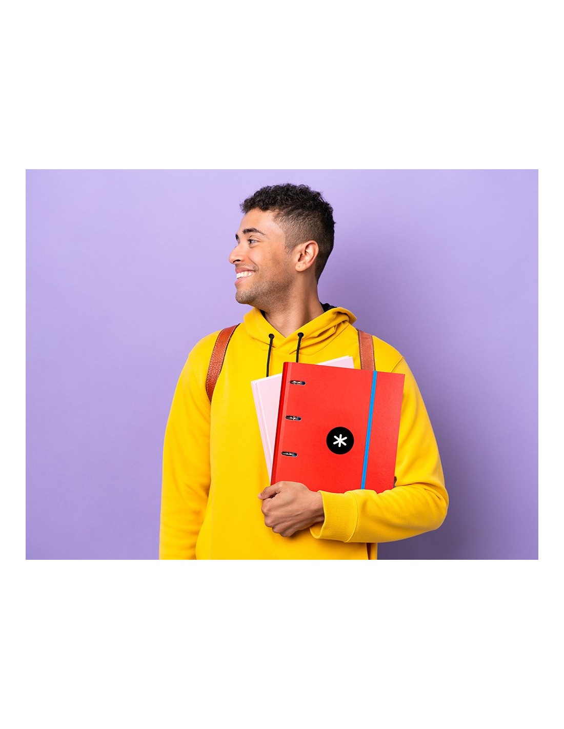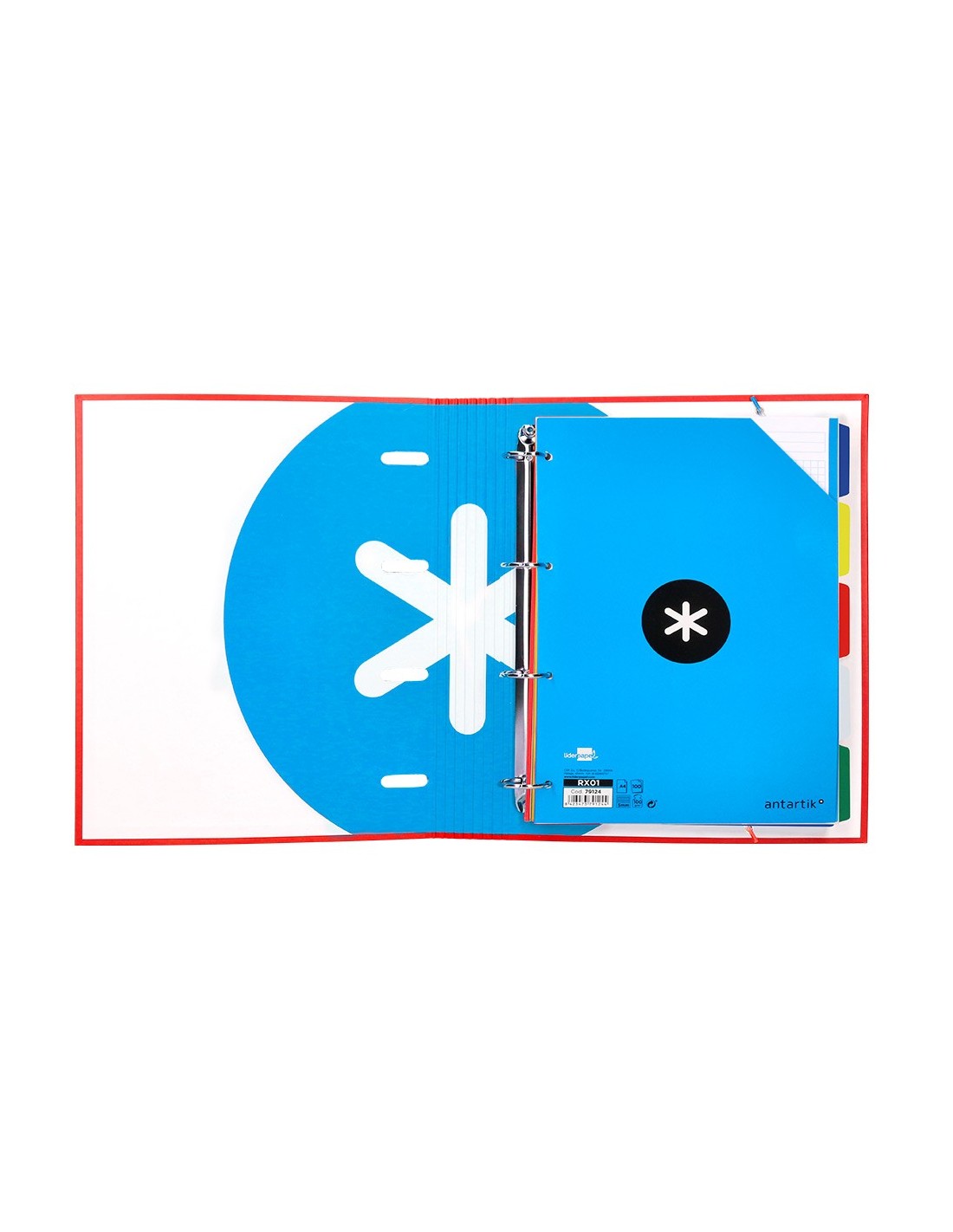TAPA DE CARTÓN FORRADO DE 1,75 MM DE ESPESOR. FORRADA EN PAPEL ESTUCADO MATE DE 135 G/M² IMPRESO. PLASTIFICADA MATE CON DETALLES BARNIZ UVI. 4 ANILLAS REDONDAS. CIERRE DE GOMILLA. CON RANURAS PARA ANILLAS. 100 HOJAS CON 5 BANDAS DE COLOR Y 4 TALADROS. PAPEL INTERIOR EXTRABLANCO DE 90 G/M². ULTR ASUAVE. CUADRÍCULA DE 5 MM. FORMATO DIN A4. GUARDA INTERIOR IMPRESA. LOMO REDONDO, CON SEPARADOR INTERIOR Y SOLAPA.