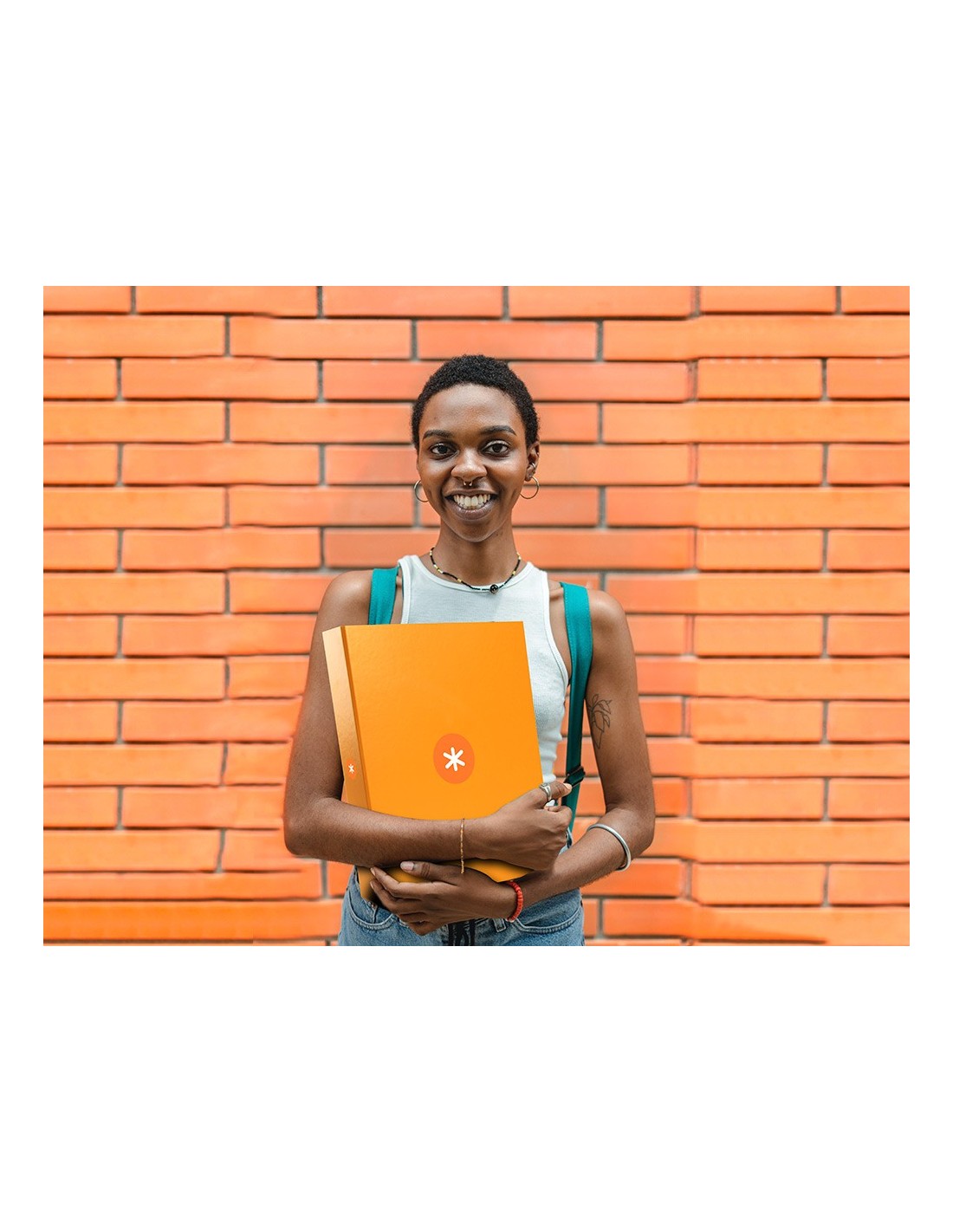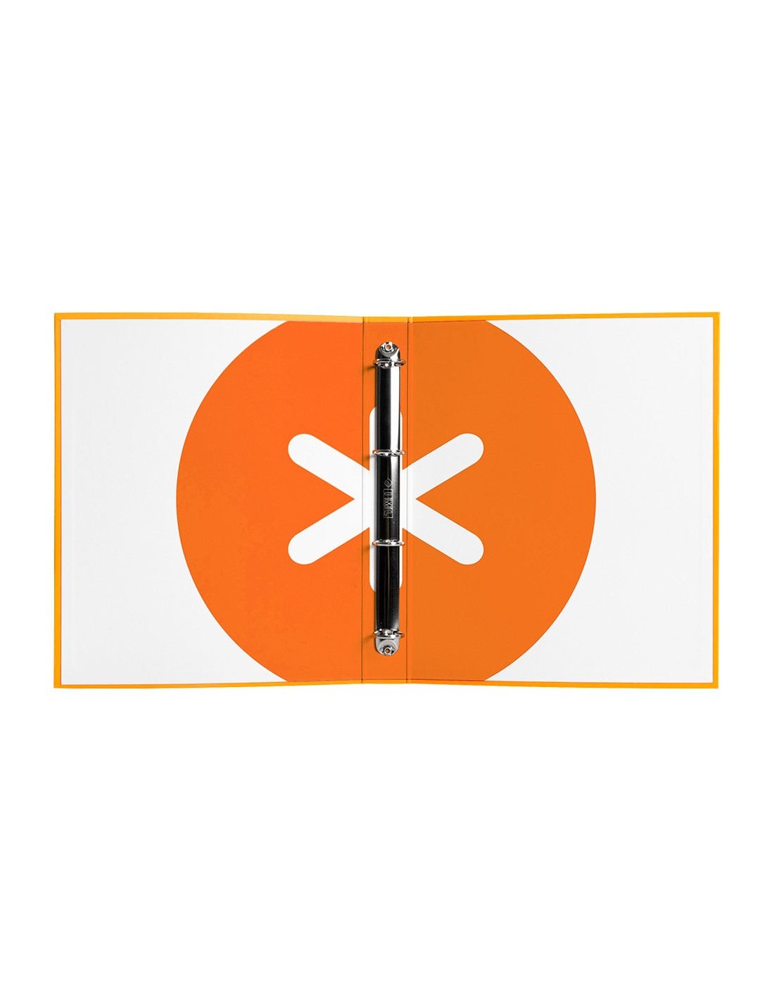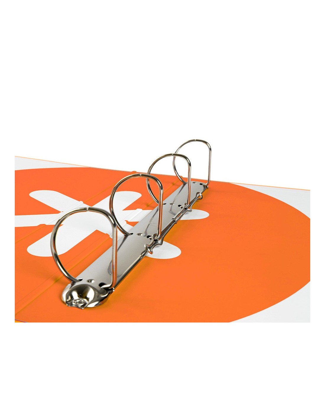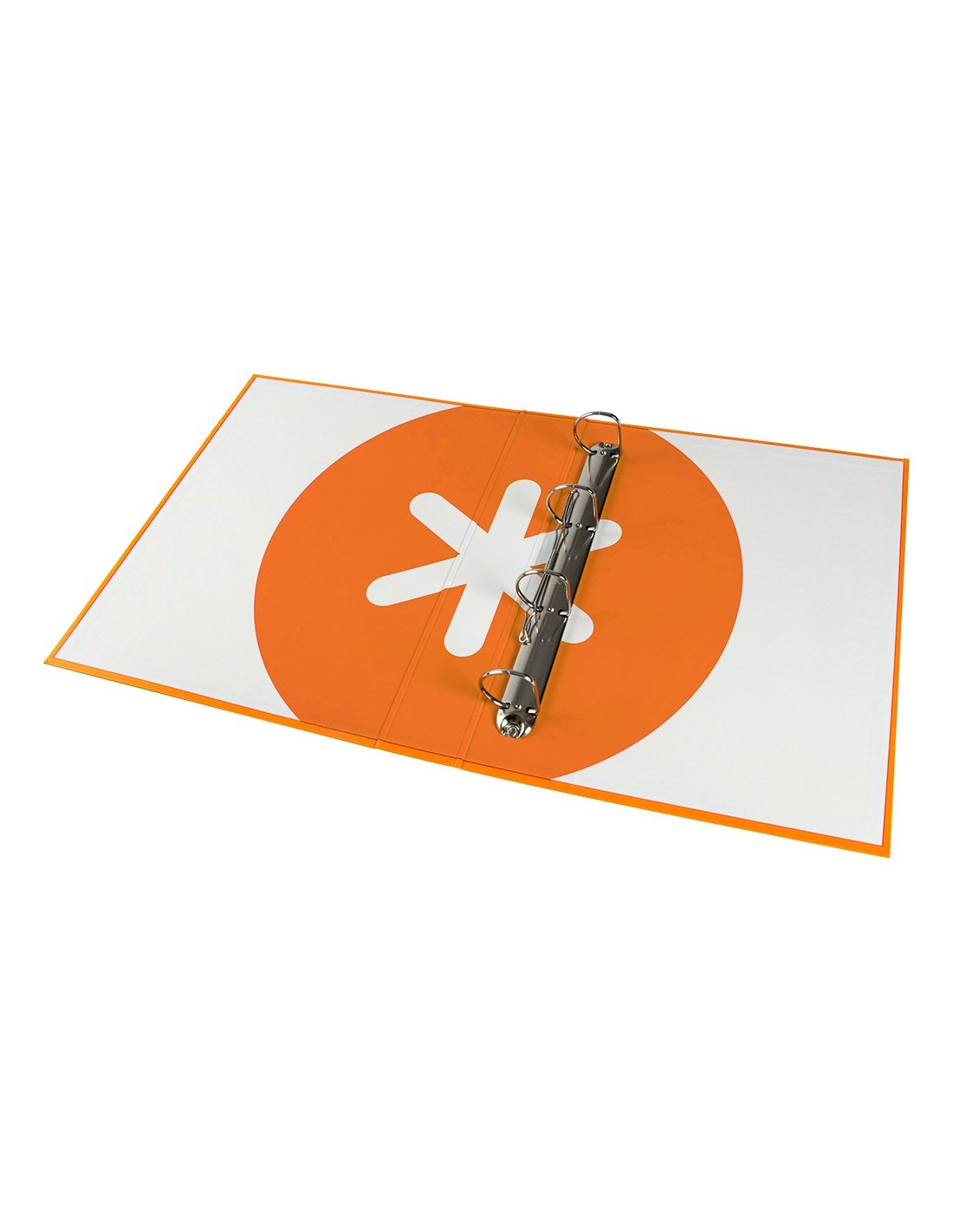 Carpeta fabricada en cartón forrado de 1,5 mm de espesor. Forrada en papel estucado de 135 g/m² impreso. Plastificada mate con detalles en barniz UVI. Con 4 anillas de 40 mm. Guarda interior impresa. Formato DIN A4.