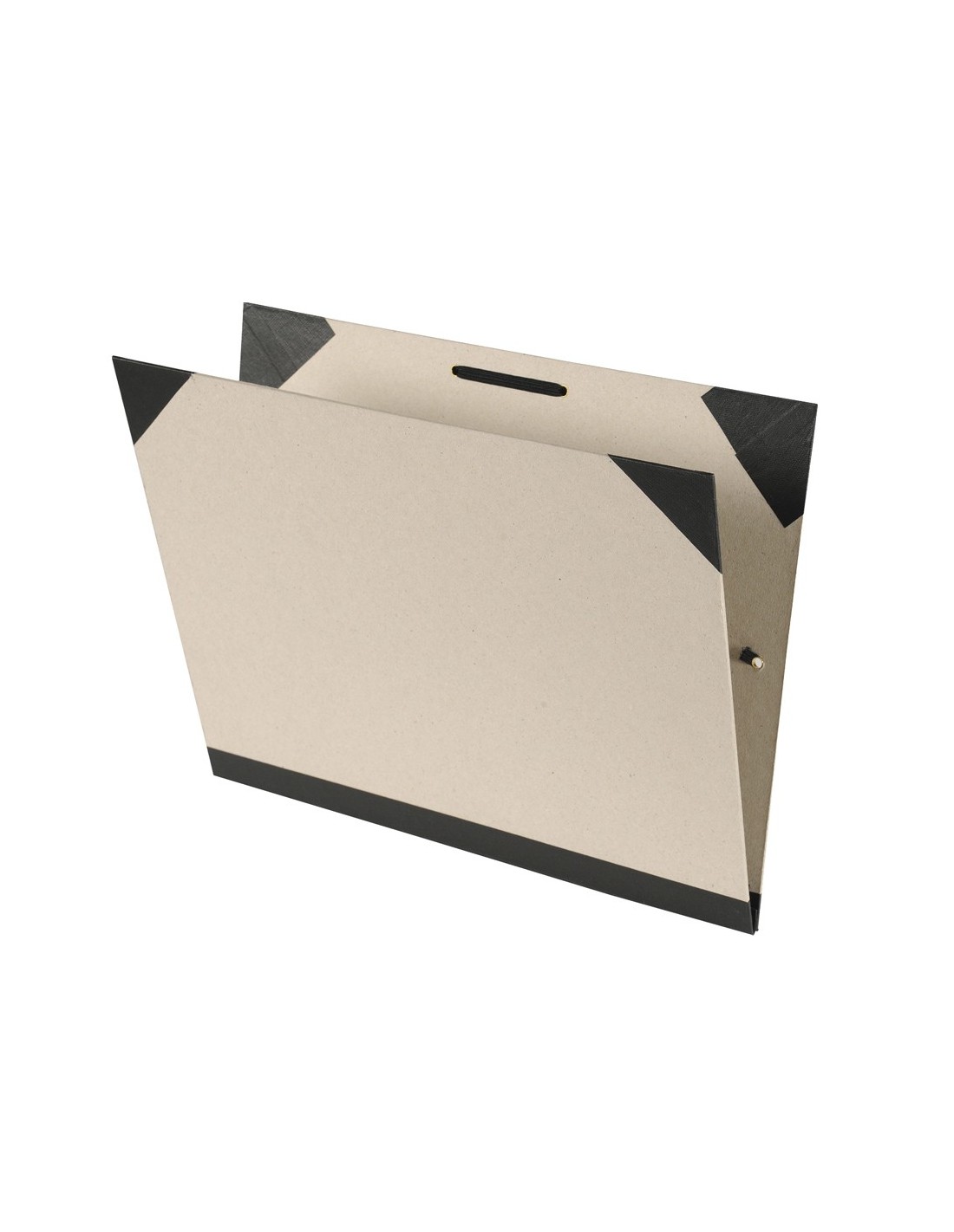 Carpeta de dibujo revestida exterior e interiormente en papel kraft. Lomo de fuelle entelado con lino negro y cuatro esquineros de refuerzo. Cierre con dos gomas elásticas.