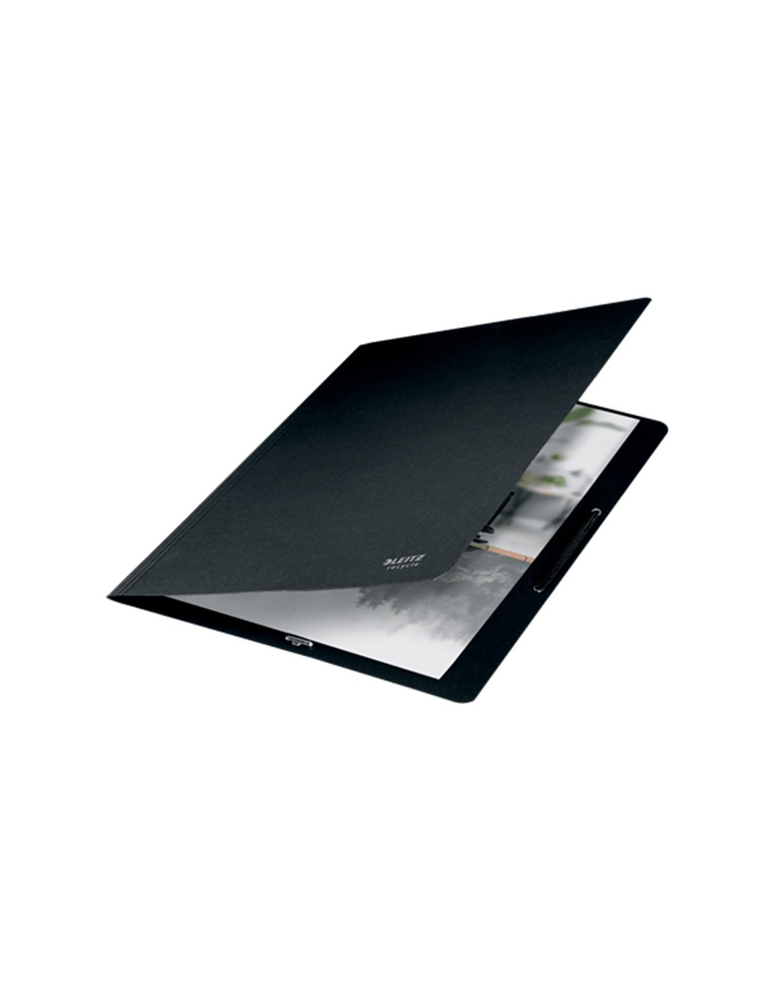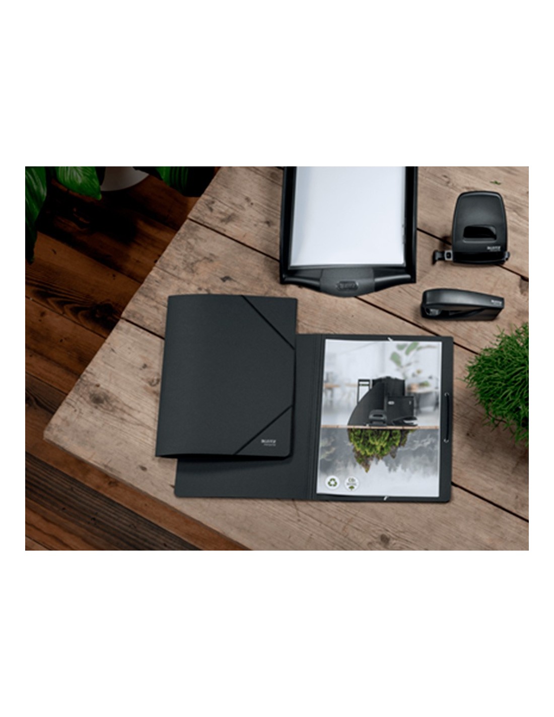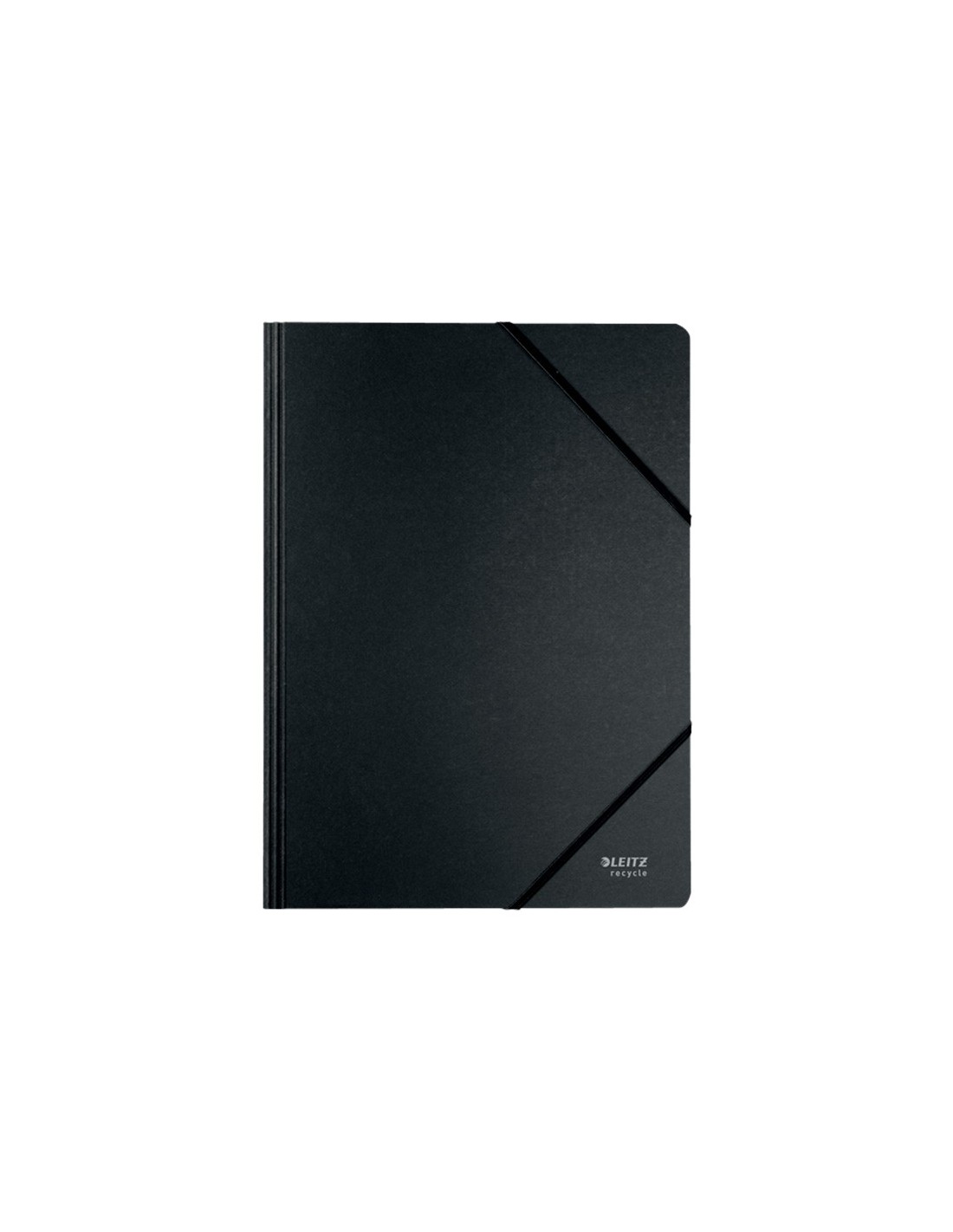 Fabricada con cartulina 100% reciclada y reciclable. Con bandas elásticas en las esquinas para evitar que los documentos se salgan. Color negro. Formato DIN A4.