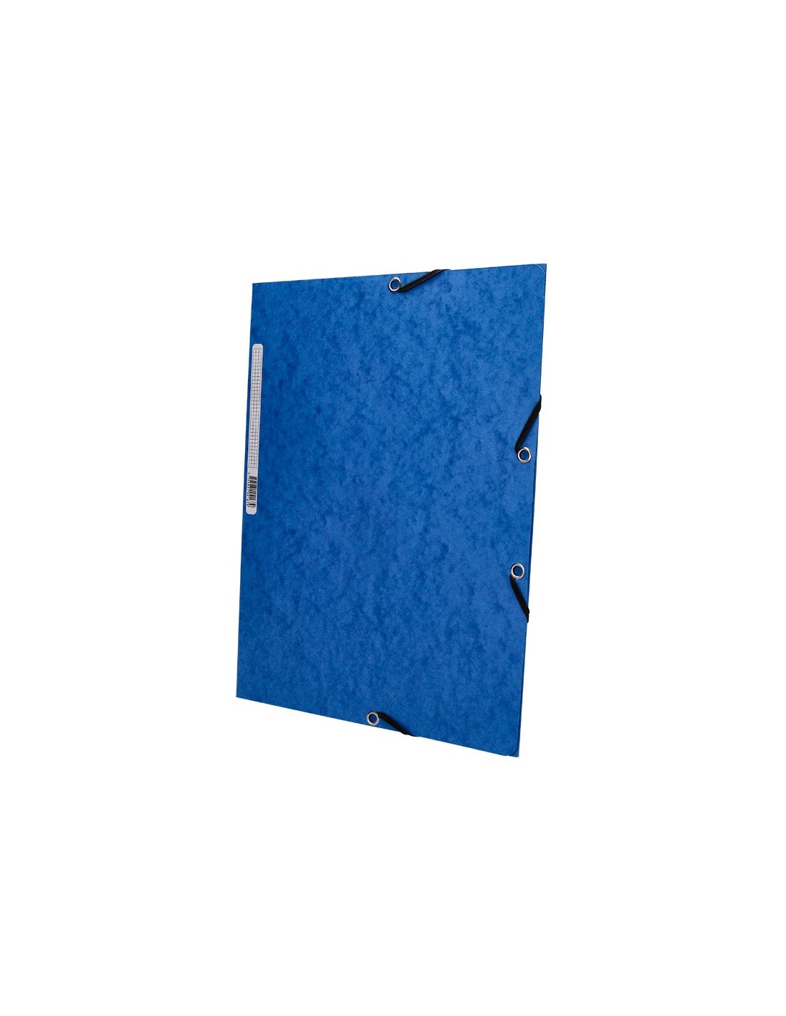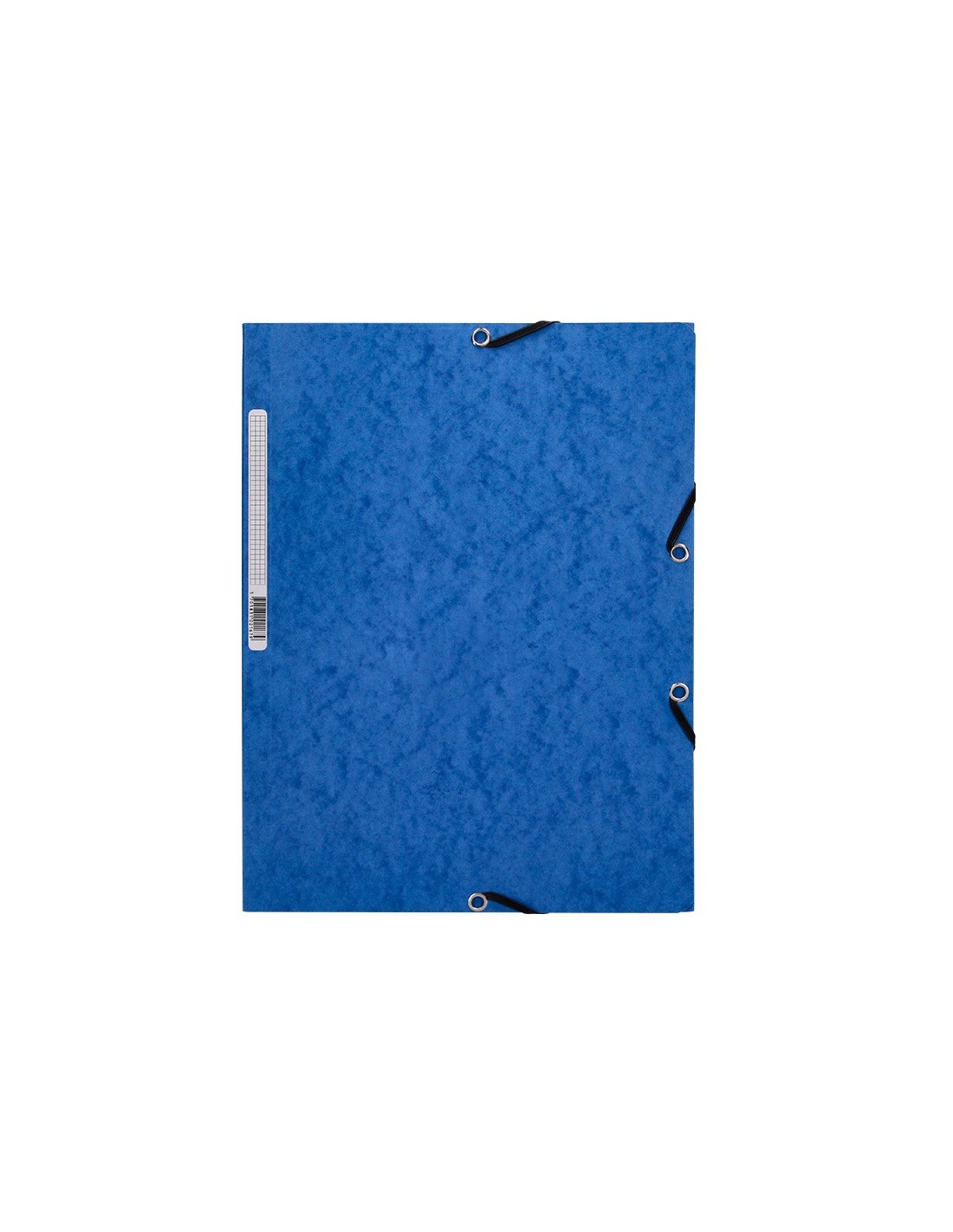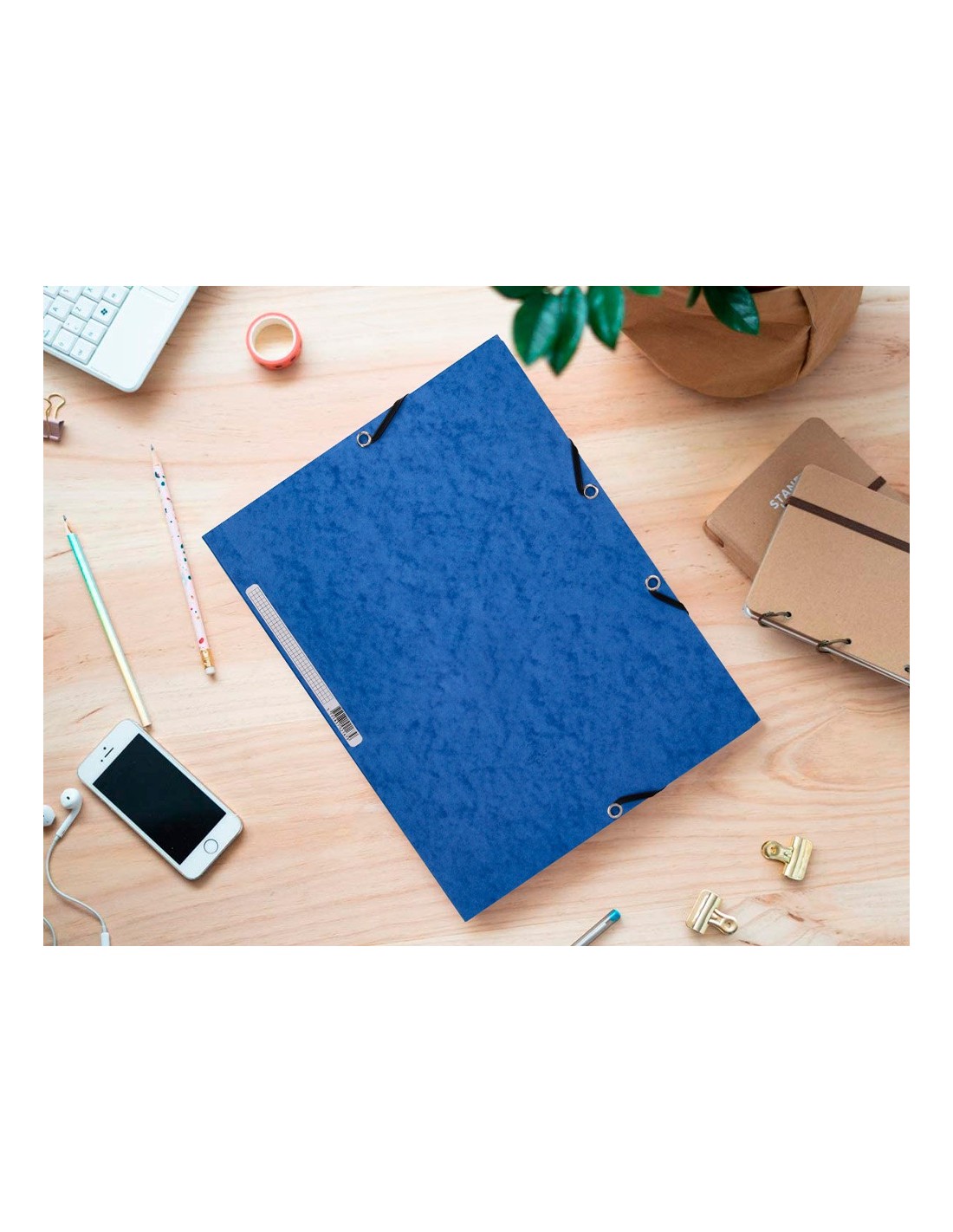 Carpeta de goma en símil prespán de 325 g/m². Cierre con elástico y tres solapas. Etiqueta adhesiva en el lomo. Formato DIN A4. Lomo de 15 mm.