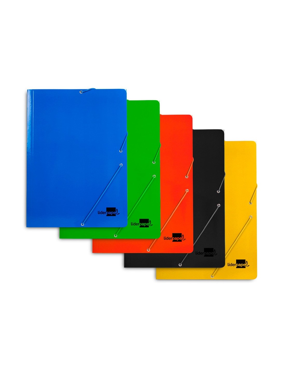 Carpeta de gomas fabricada en cartón plastificado de 600 g/m². Cierre con gomas. Con tres solapas. Tamaño folio. Colores surtidos: amarillo, azul, negro, rojo y verde.