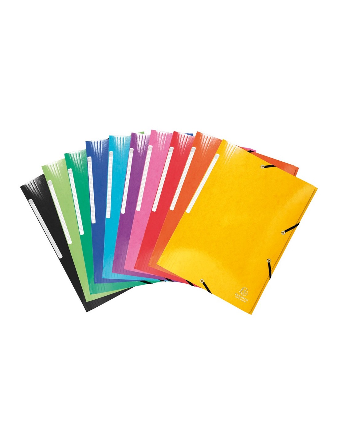 Carpeta de gomas en símil prespán plastificado de 600 g/m². Cierre con elástico y tres solapas. Etiqueta adhesiva en el lomo. Formato DIN A4+. 10 colores surtidos: amarillo, azul claro, azul oscuro, morado, naranja, negro, rojo, rosa, verde anís, verde oscuro.