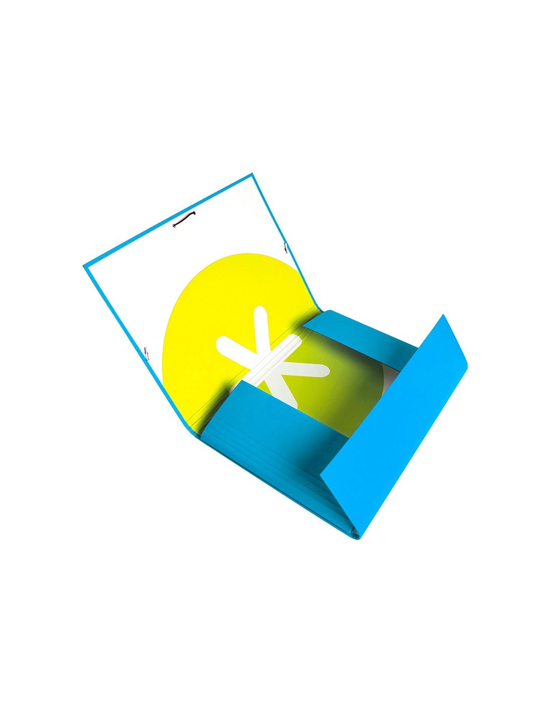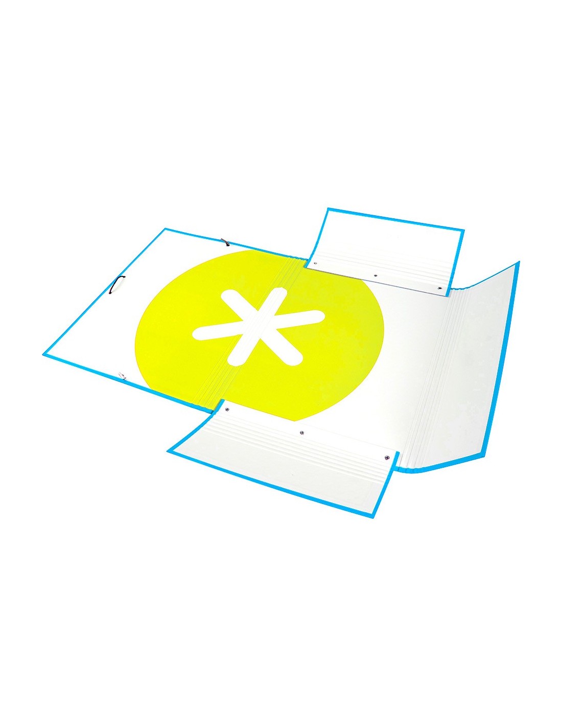 Carpeta de gomas fabricada en cartón forrado de 1,75 mm de espesor. Forrada en papel estucado mate de 135 g/m ² impreso. Plastificada mate con detalles en barniz UVI. Cierre con gomas. Tres solapas. Guarda interior impresa. Formato DIN A4.
