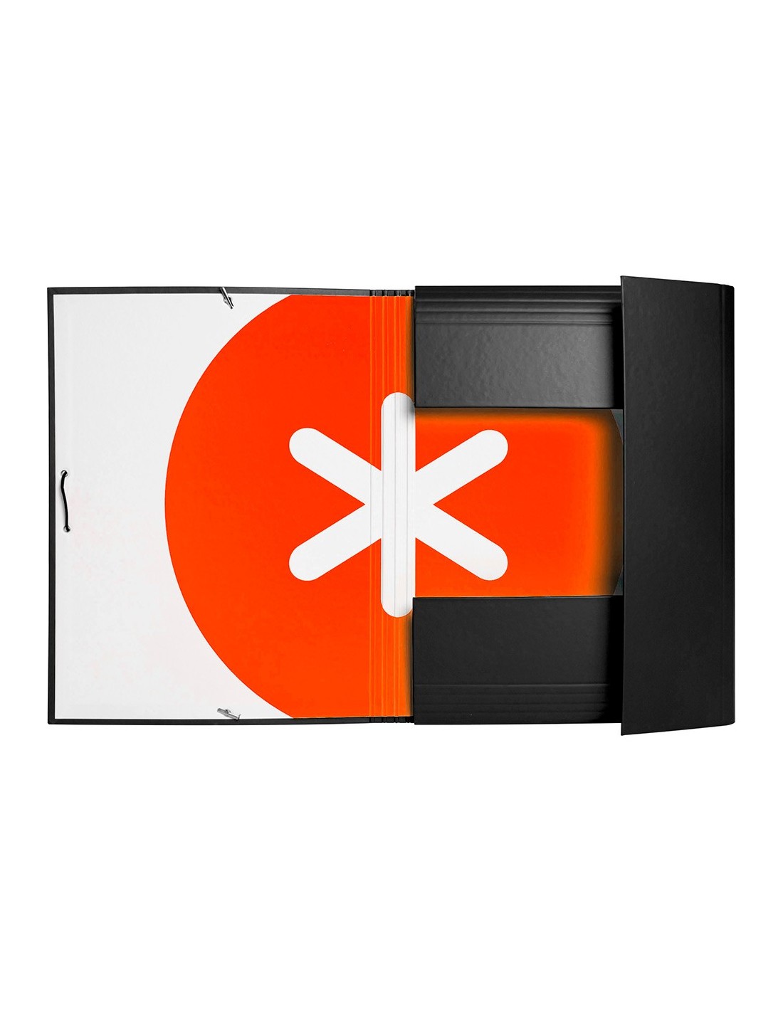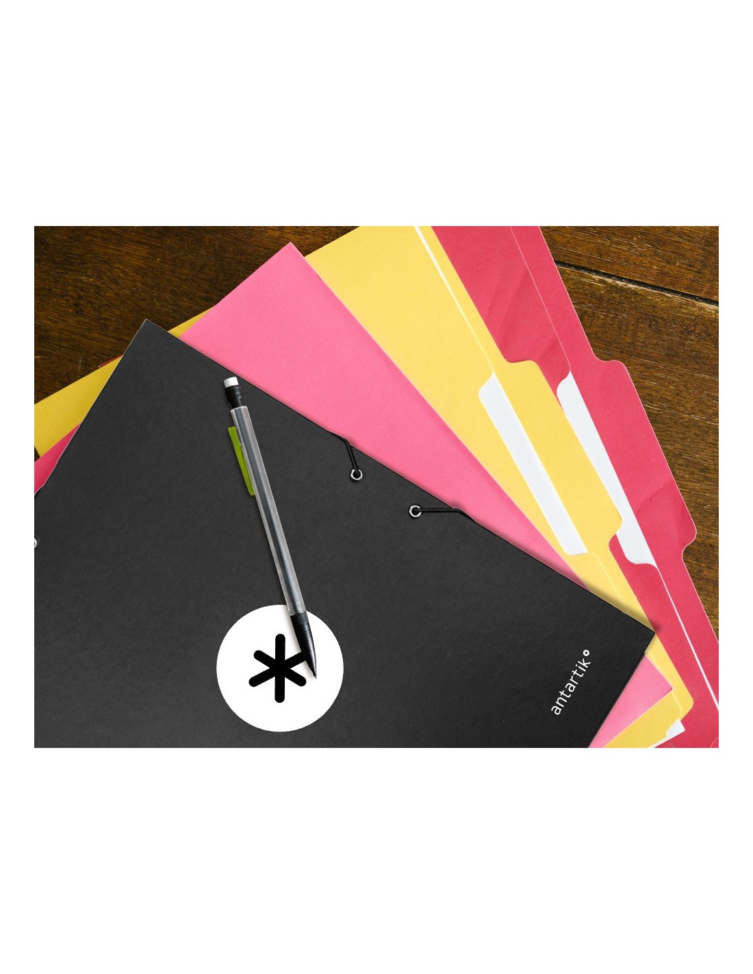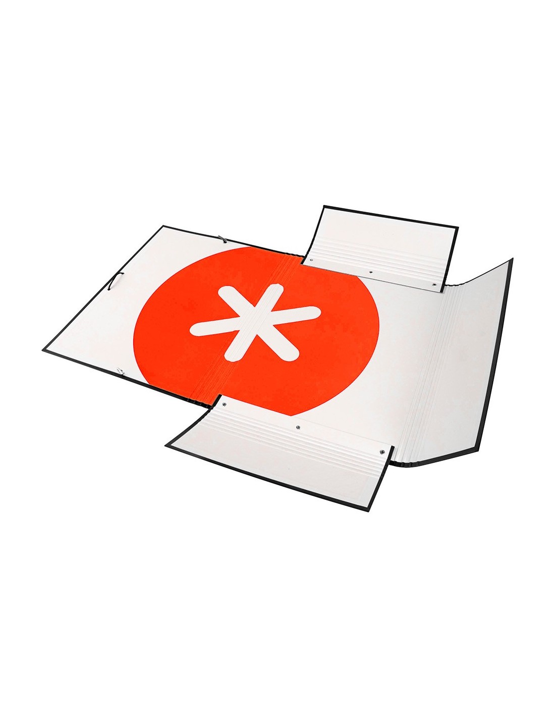 Carpeta de gomas fabricada en cartón forrado de 1,75 mm de espesor. Forrada en papel estucado mate de 135 g/m ²impreso. Plastificada mate con detalles en barniz UVI. Cierre con gomas. Tres solapas. Guarda interior impresa. Formato DIN A4.