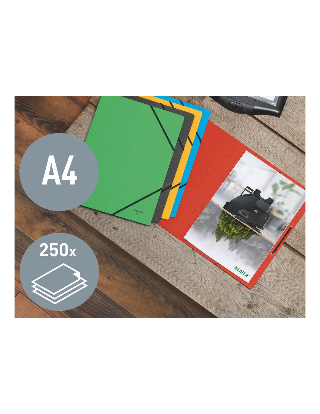 Carpeta de cartón llamativa y de primera calidad. Uno de los tipos de carpeta más utilizadas para la protección y el transporte de documentos. Con gomas en las esquinas para evitar que los documentos se salgan. Fabricada con cartón 100% reciclado, neutro para el clima gracias a la reducción y compensación de CO2, 100% reciclable y con certificación medioambiental BlueAngel. Esta robusta y práctica carpeta con gomas complementa perfectament e otros productos de la gama Leitz Recycle y está hecha para durar. Producto de papelería ecológica, moderno y contemporáneo que quedará genial en c