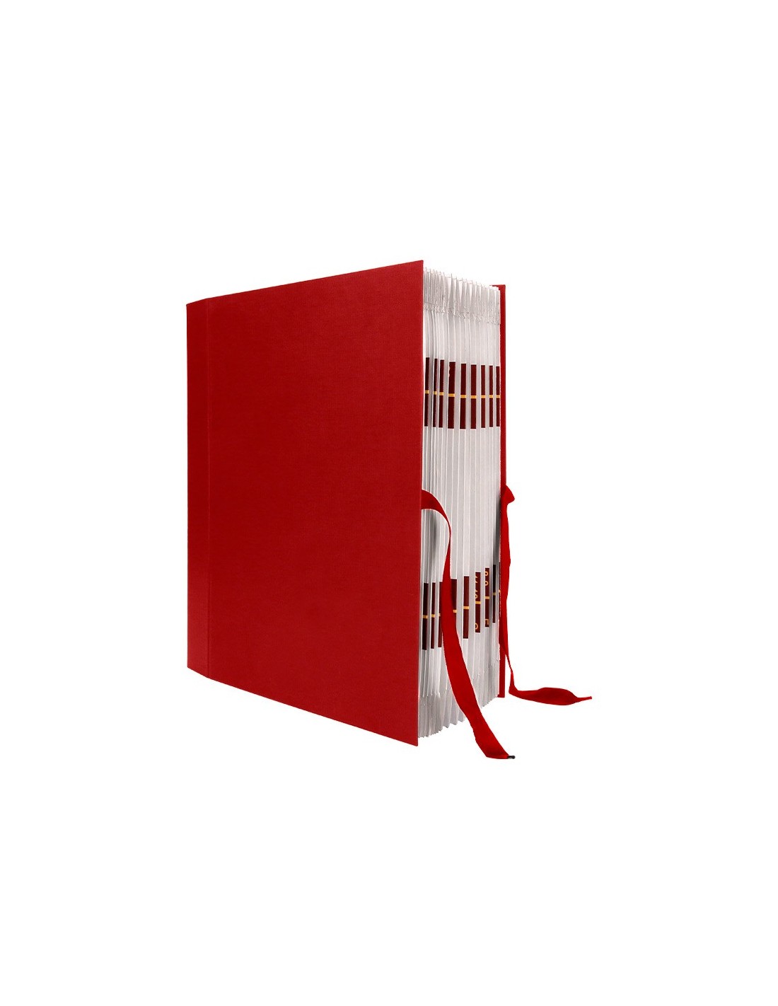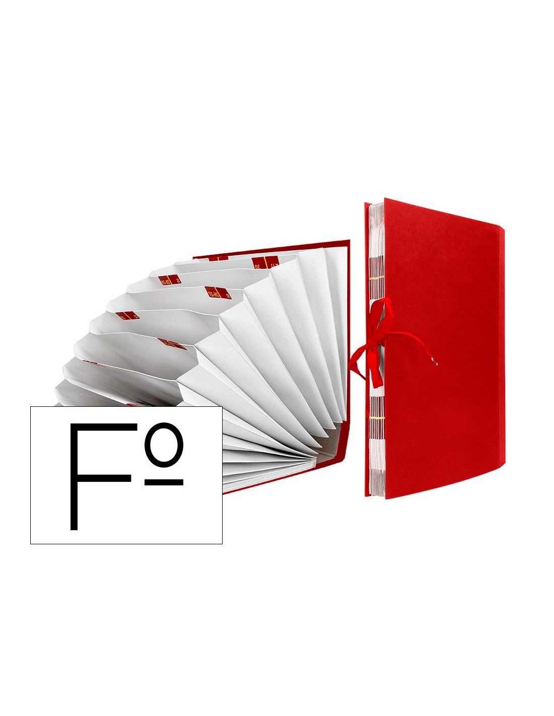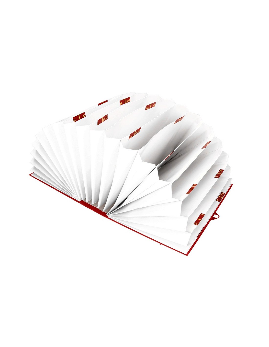 Carpeta de cartón forrado con materiales de primera calidad, con cinta de raso para una mayor resistencia y con guardas para un perfecto acabado. Con 20 departamentos A-Z y 1-31.