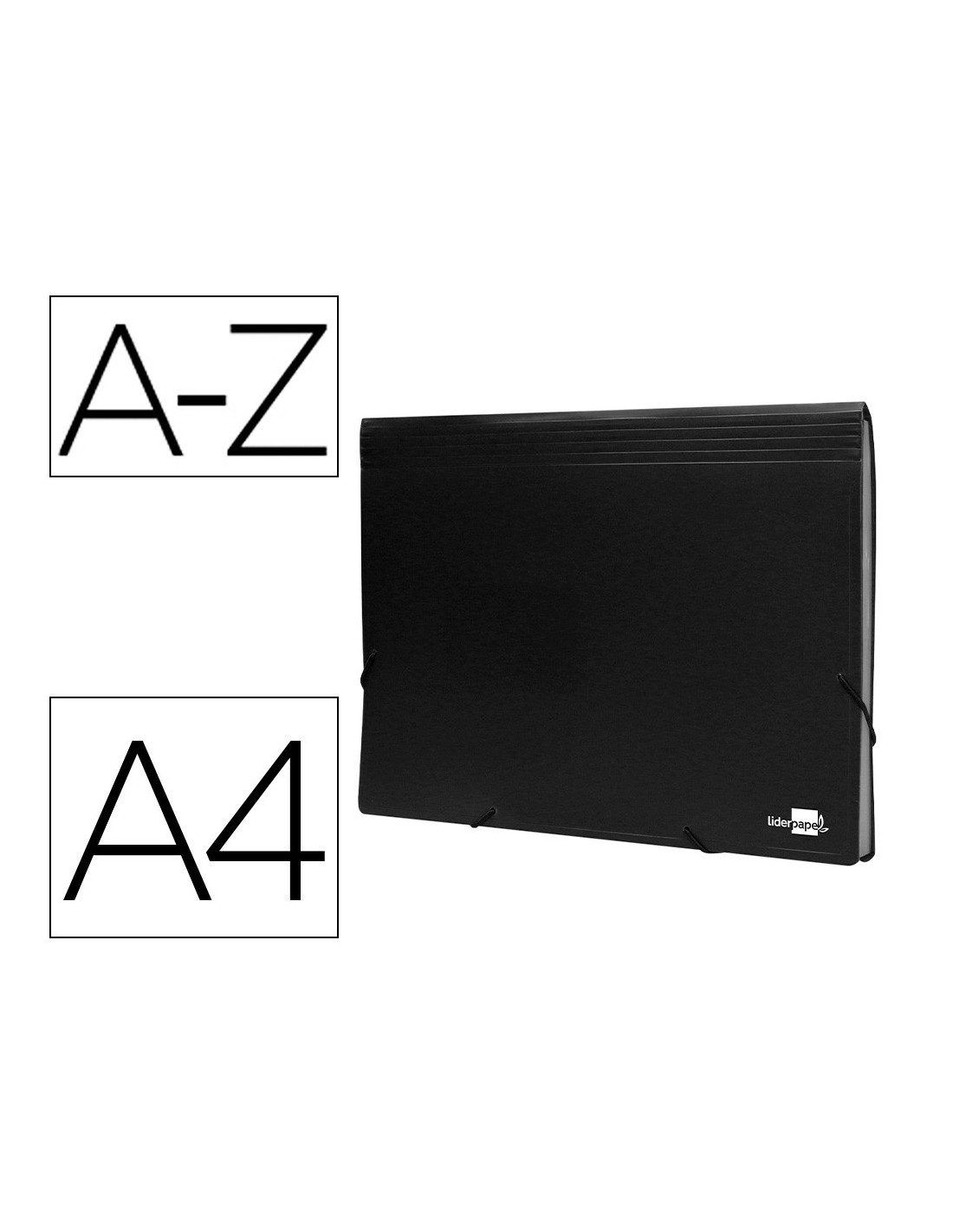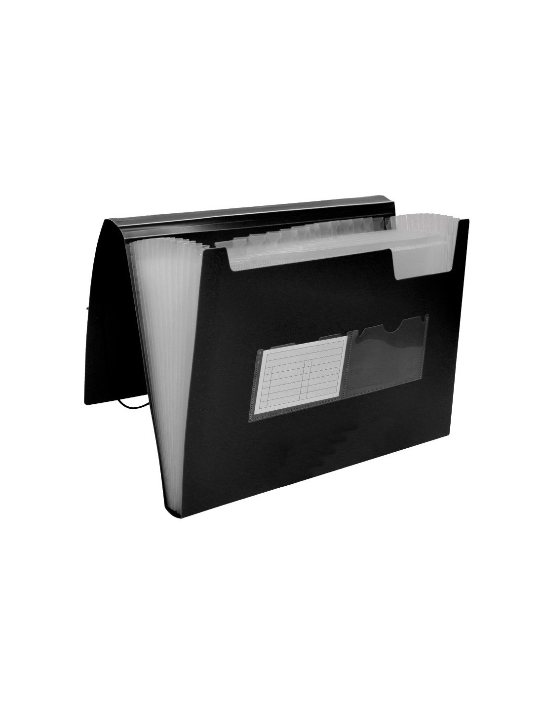 Cierre de gomas. 2 huecos para tarjetas. Etiquetas de meses y A-Z incluidas. 13 departamentos. Formato DIN A4. Fabricada en polipropileno. 700 micras. Departamentos de 150 micras.