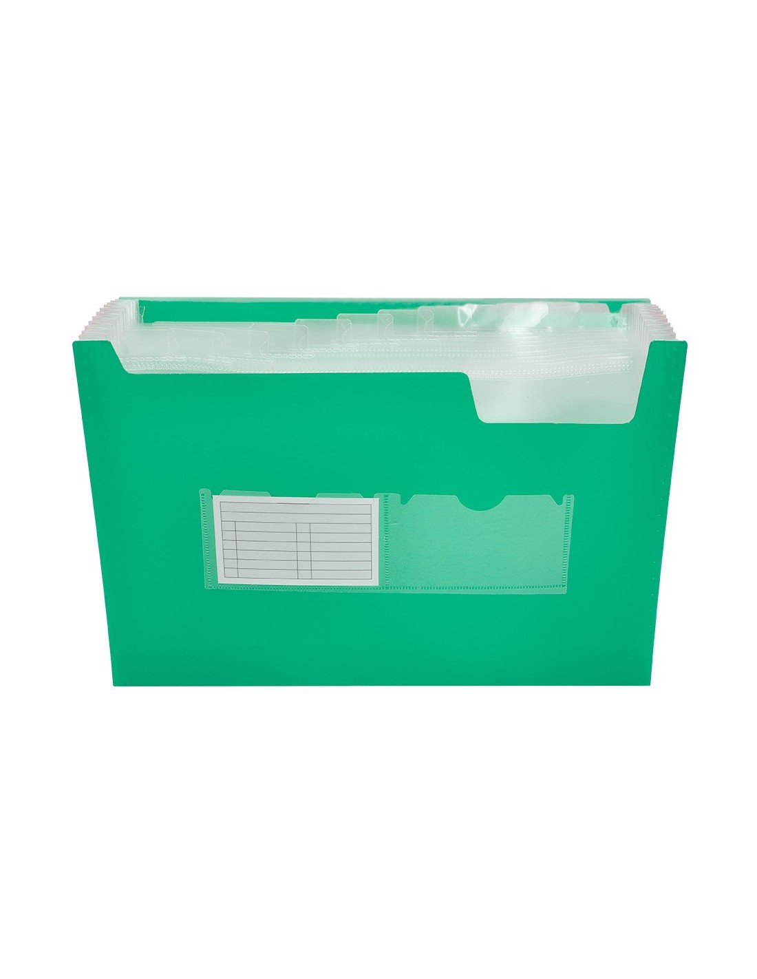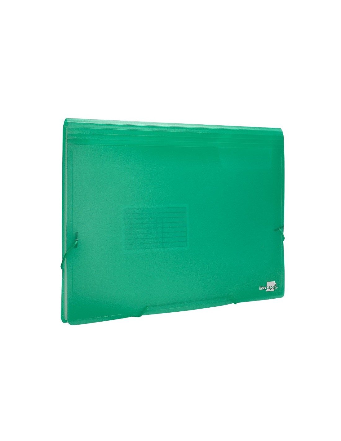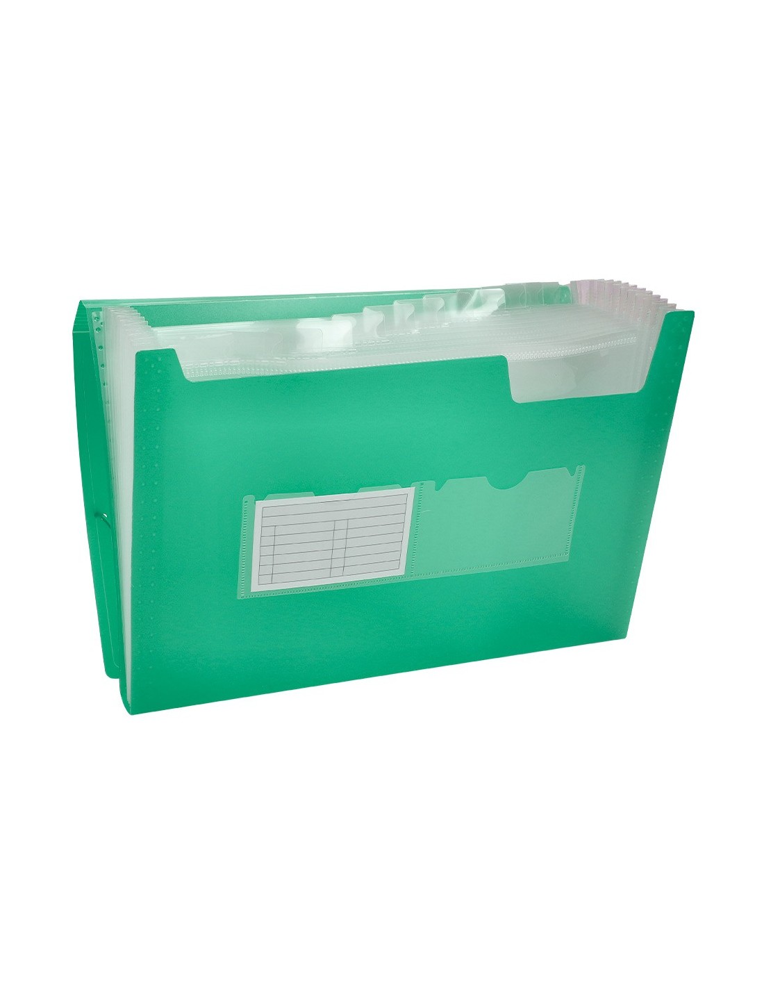 Cierre de gomas. 2 huecos para tarjetas. Etiquetas de meses y A-Z incluidas. 13 departamentos. Formato DIN A4. Fabricada en polipropileno. 700 micras. Departamentos de 150 micras.
