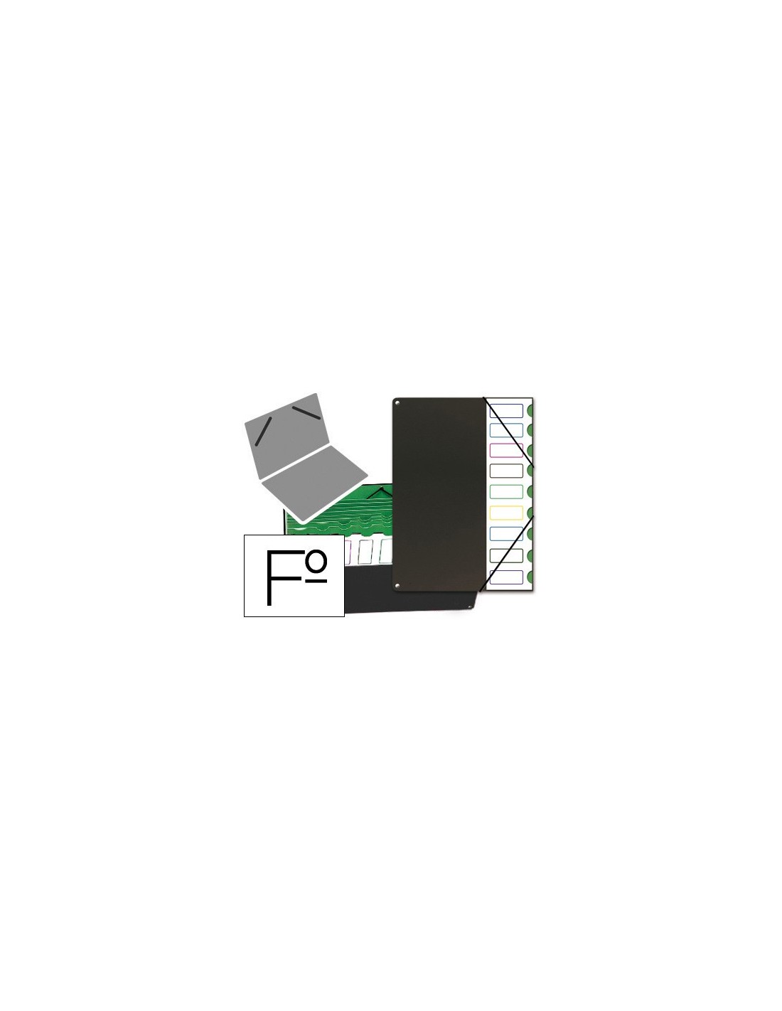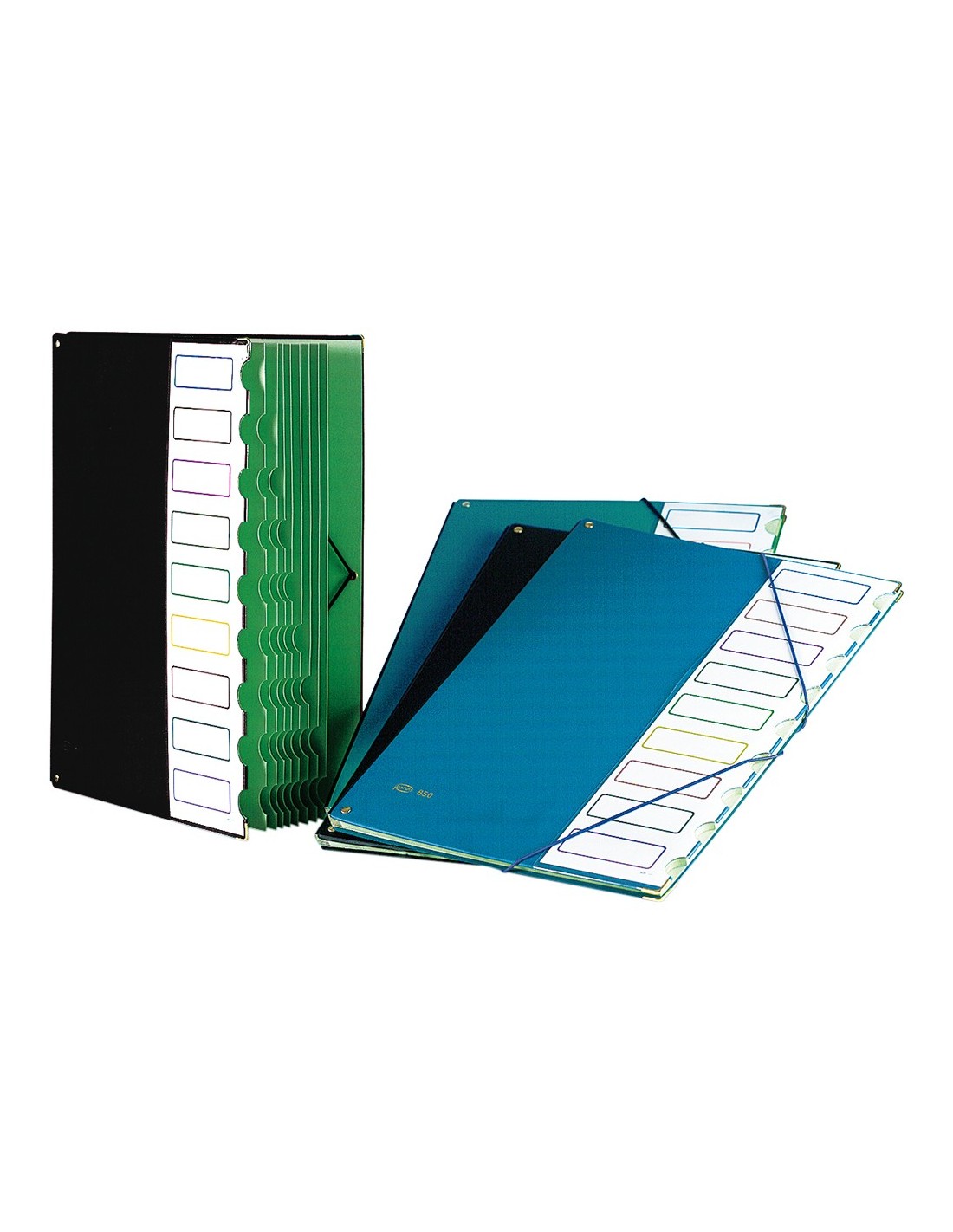 Clasificador extra de cubiertas de plástico cartulina doble. 9 departamentos. Con lomo tipo fuelle y con tarjetero en portada. Tapas y cierre de gomas. Tamaño folio.
