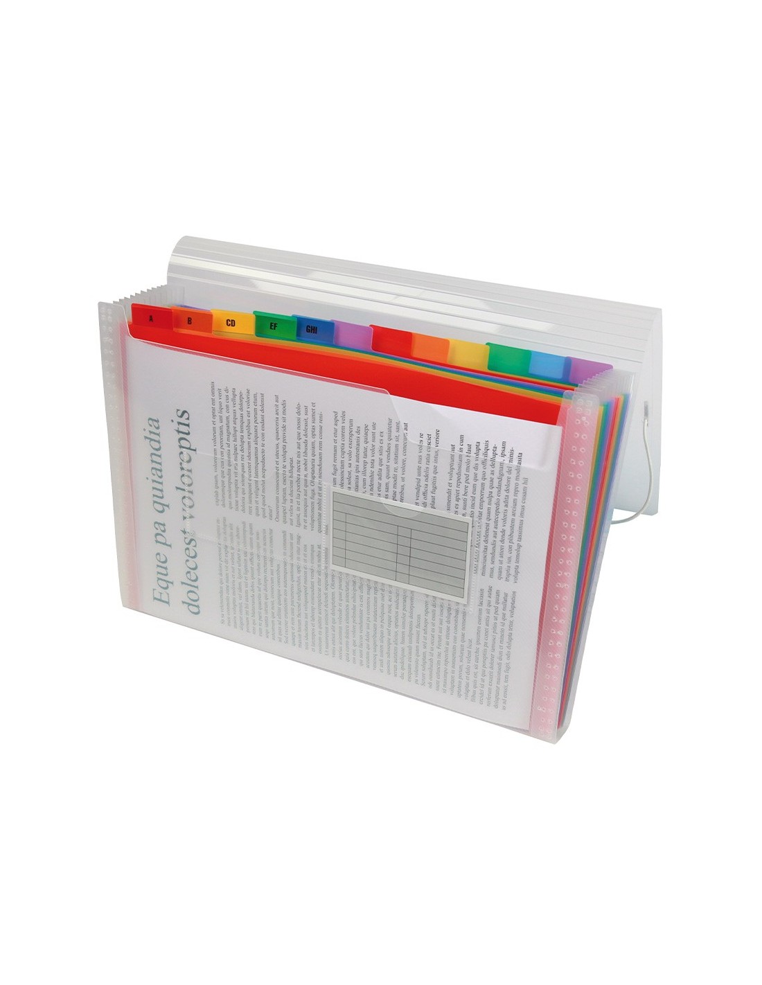 Serie Spectrafile. Cierre de gomas. Transparente. 2 huecos para tarjetas. 13 departamentos de colores. Fabricada en polipropileno. Color transparente. 700 micras. Departamentos de 150 micras.