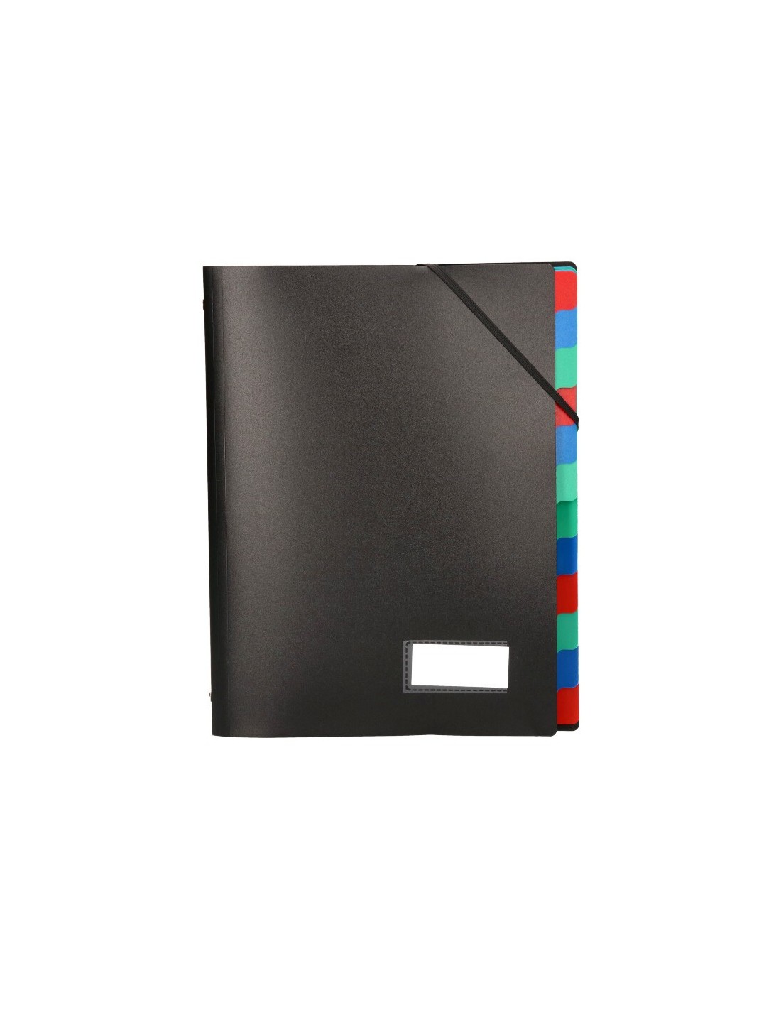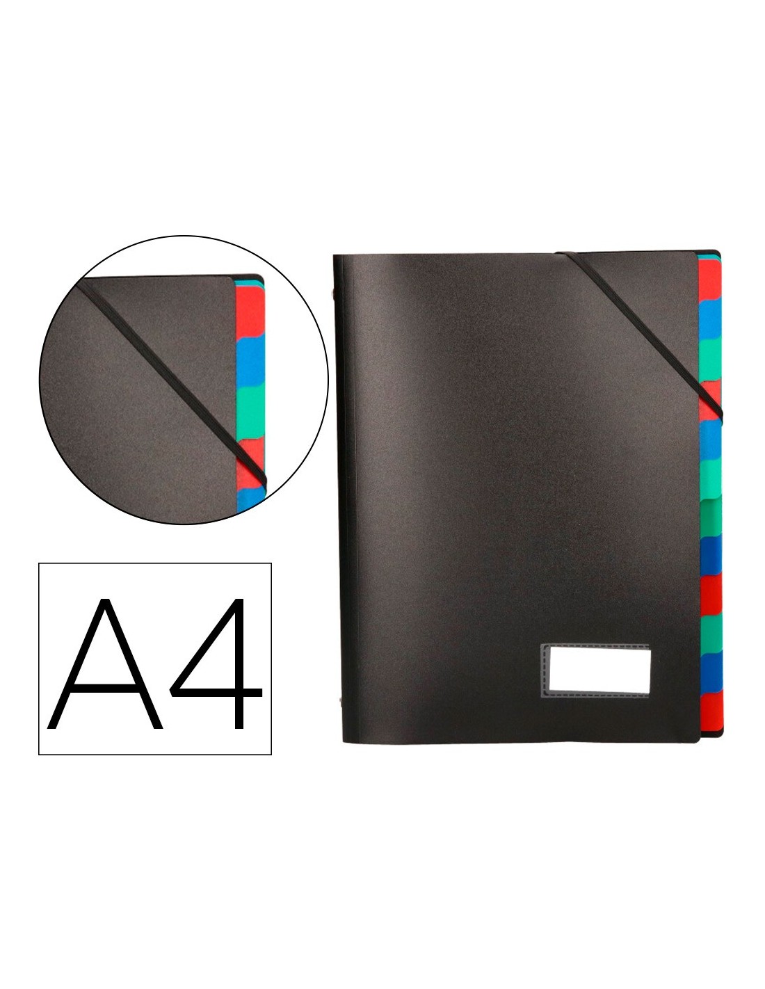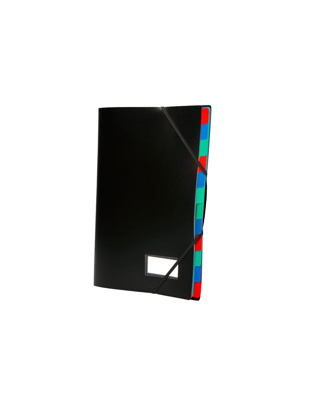 Carpeta clasificadora fabricada en polipropileno. Con portafirmas. 12 departamentos en tres colores. Capacidad para 450 hojas DIN A4 80 g/m². Cierre con gomas. Color negro. Formato DIN A4. Medidas: 254 x 320 x 11 mm.
