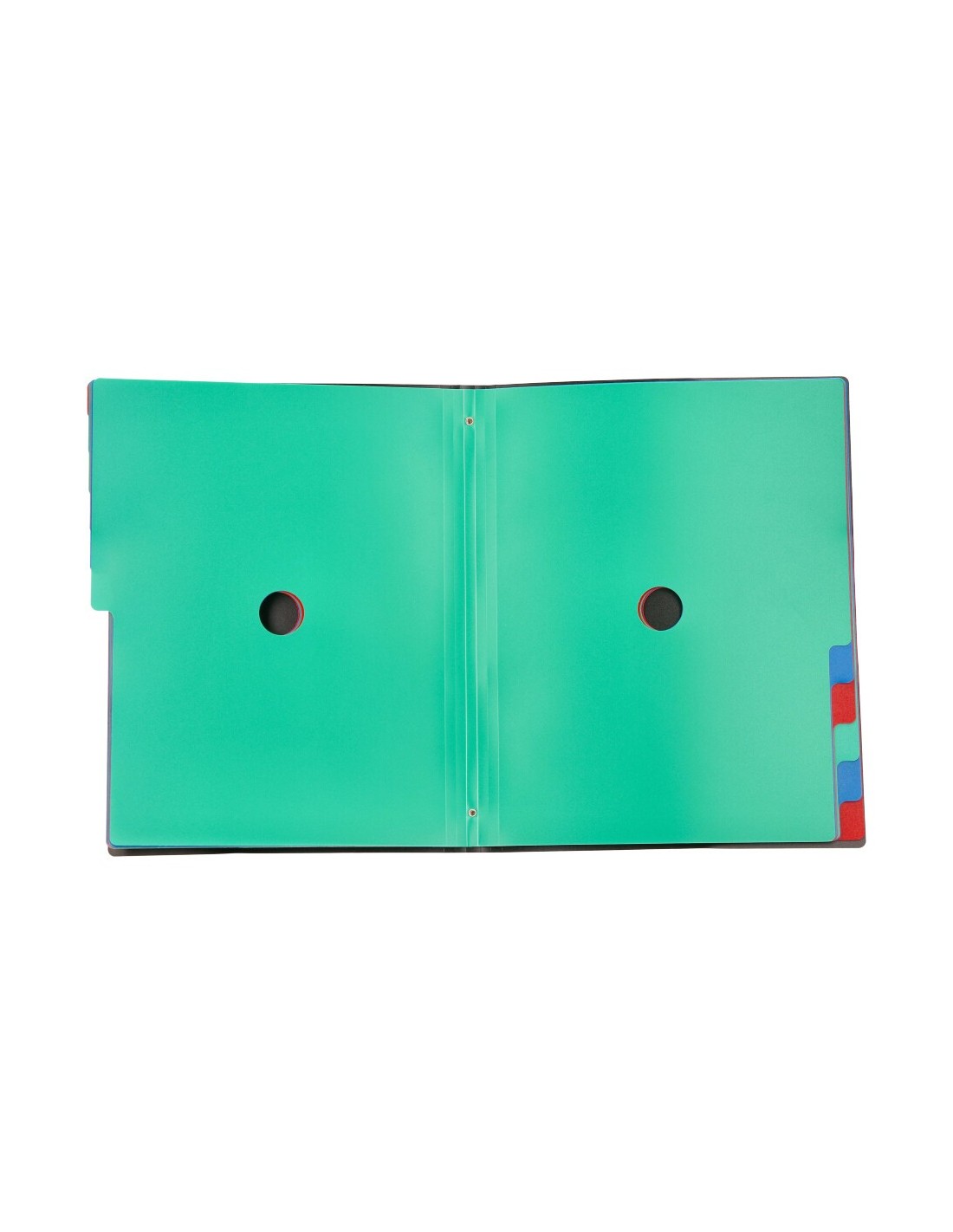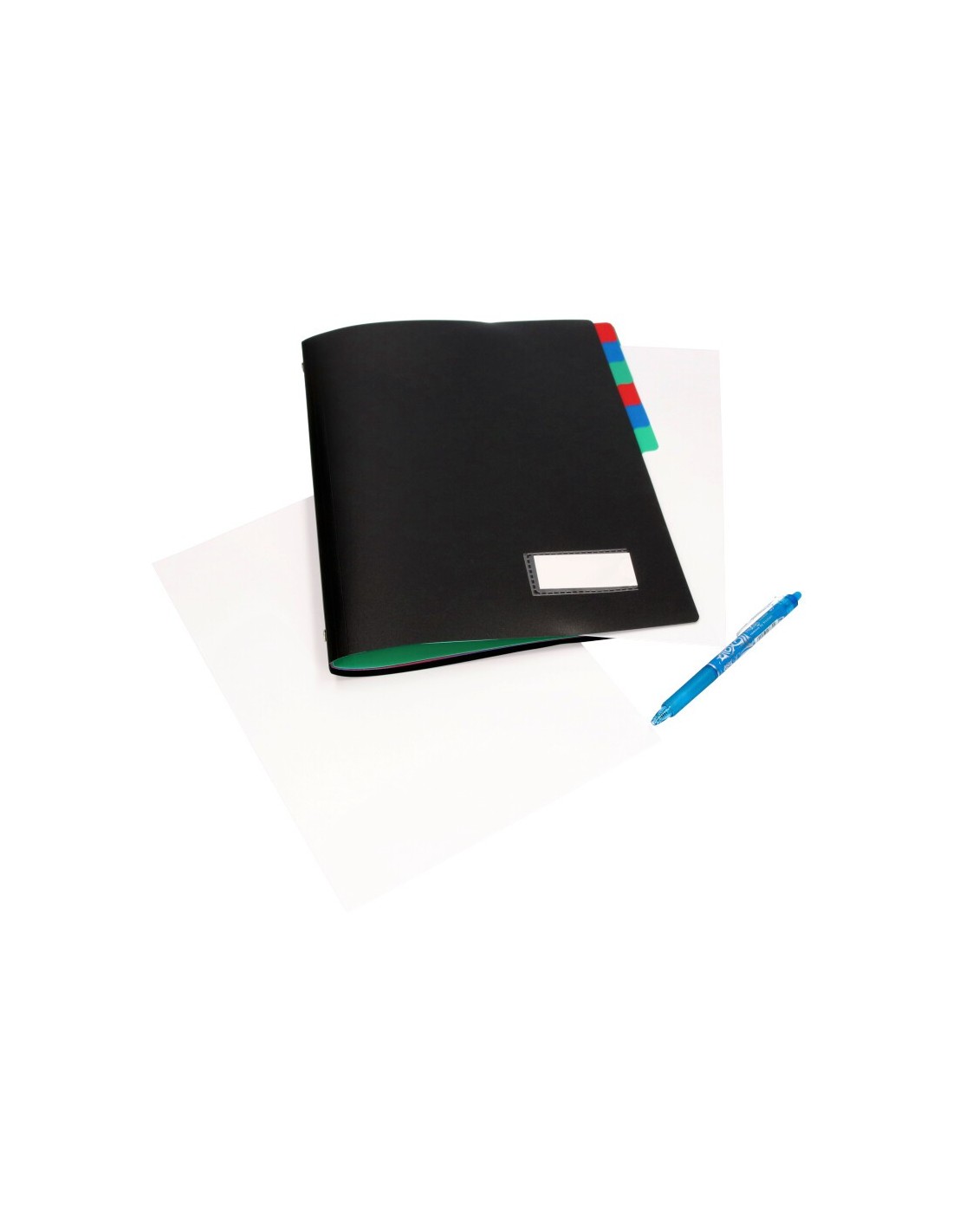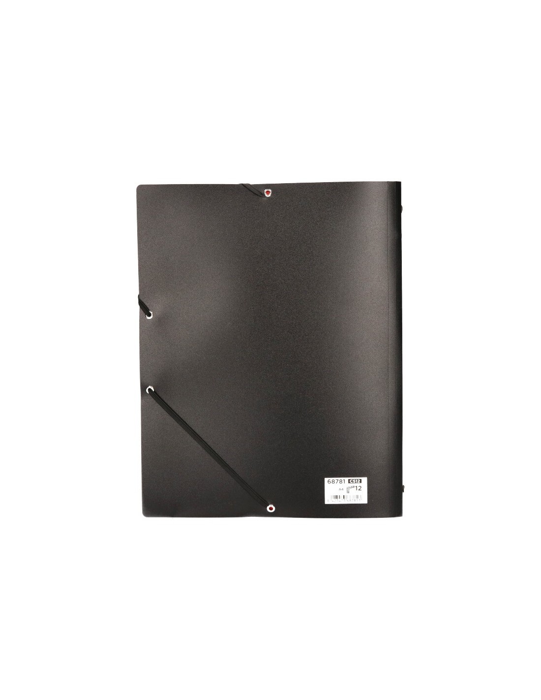 Carpeta clasificadora fabricada en polipropileno. Con portafirmas. 12 departamentos en tres colores. Capacidad para 450 hojas DIN A4 80 g/m². Cierre con gomas. Color negro. Formato DIN A4. Medidas: 254 x 320 x 11 mm.